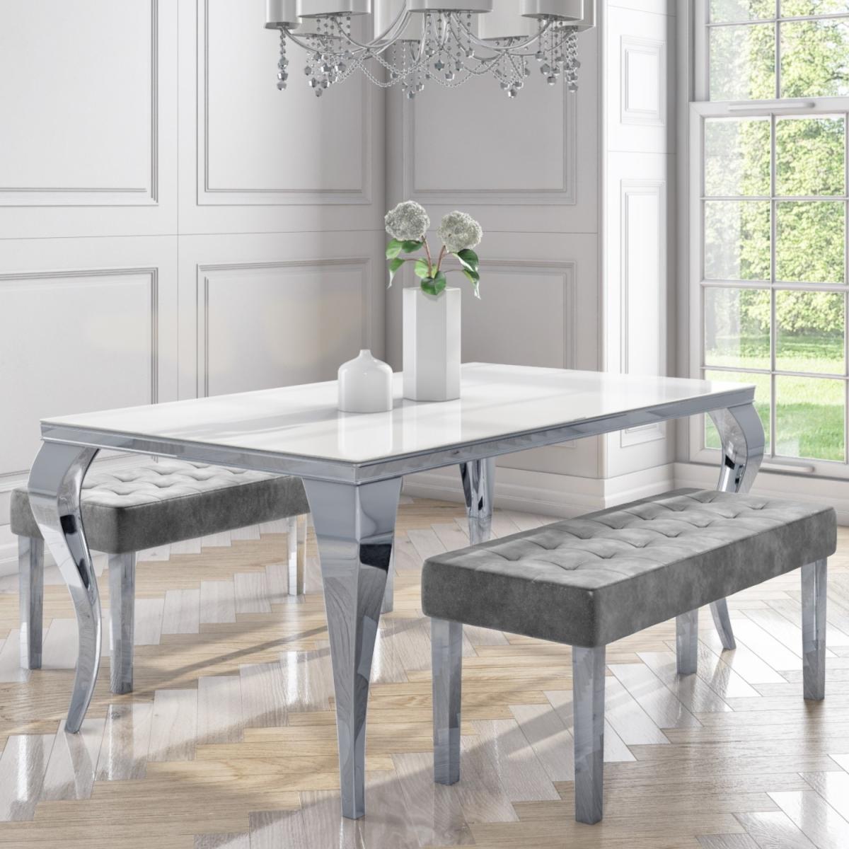 . This bundle includes. 1 x Jade Boutique Mirrored Dining Table with White Glass. 2 x Jade Boutique Grey Velvet Dining Benches with Chrome Legs Features we love White glass dining table with a stainless-steel frame. Comfortably seats 4 people around the table. Tempered glass table top for added peace of mind. Comes with 2 grey velvet benches with chrome legs. All seating is foam-filled for comfort and support Need to know. Dining Table Information. Dimensions. H76 x W160 x D92 cm Seats. 4 Colour. White and silver Finish. Tempered glass Frame finish. Polished stainless-steel Material. Glass and metal Assembly required. Yes Dining Bench Information. Number of benches. 2 Dimensions. W116 x D46 x H49 cm Seats. 2 per bench Colour. Grey and silver Finish. Velvet upholstery and chrome stainless steel legs Material. Solid rubberwood stainless steel and velvet Assembly required. Yes - just the legs.