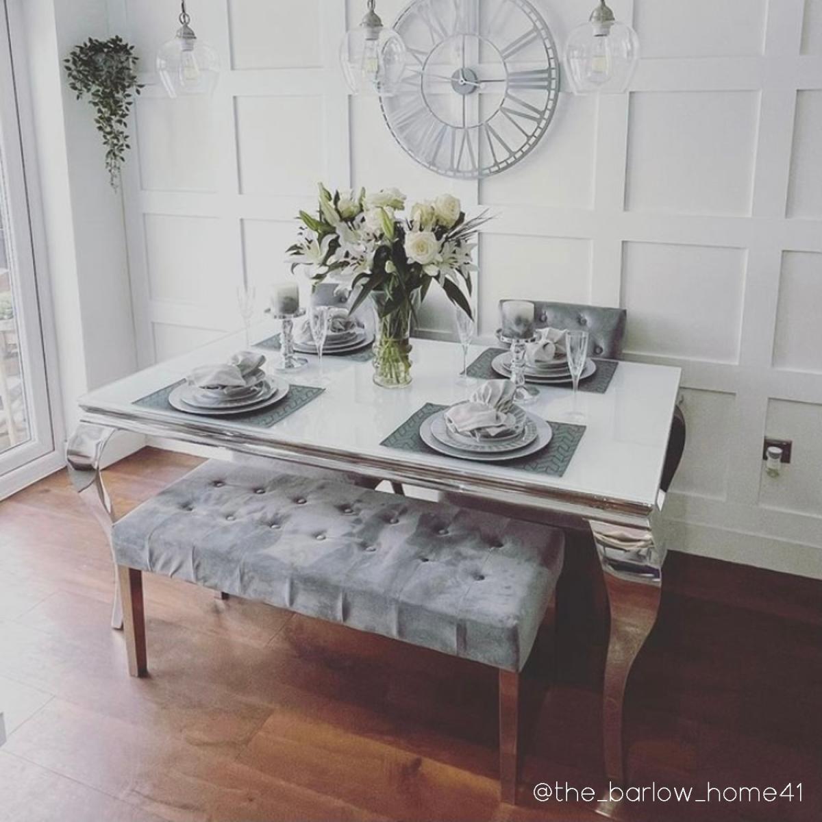 . This bundle includes Jade Boutique Mirrored Dining Table White Glass - Seats 6 - 160cm. 1 x Set of 2 Grey Knocker Chairs in Velvet with Chrome Legs & Studs - Jade Boutique 1 x Grey Velvet Dining Bench with Chrome Legs - Jade Boutique. Features we love The glamourous and elegant design makes a stylish impact in any dining space Sleek white glass table top reflects the light beautifully. Curvaceous polished chrome stainless-steel frame creates a luxurious look. Combination of stainless steel and thick glass it's designed and made to last. With space for up to six people it's ideal for light entertaining. Part of the Jade Boutique range of dining furniture All about me. Give your dining space a brighter spacious feel with this Jade Boutique dining table. Supported by elegant curvaceous polished stainless steel legs and a modern white glass top it's sure to make a lasting impression as it takes centre stage in your dining space. It comfortably seats up to six diners making it ideal for small family gatherings or light entertaining. It'll make a stunning addition to any modern home. Assembly is required; however it is relatively minimal; it's just a case of fixing the tabletop to the base. If you're looking for a complete dining set why not match to the Jade Boutique dining chairs to complete the look?. Need to know. Dimensions. H76 x W160 x D92 cm Colour. White and silver Finish. Tempered glass top and polished stainless steel base and legs Material. Glass and stainless-steel Assembly required. Yes Range. Jade Boutique.