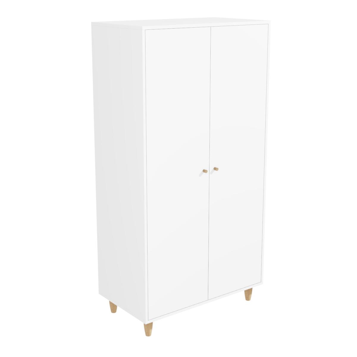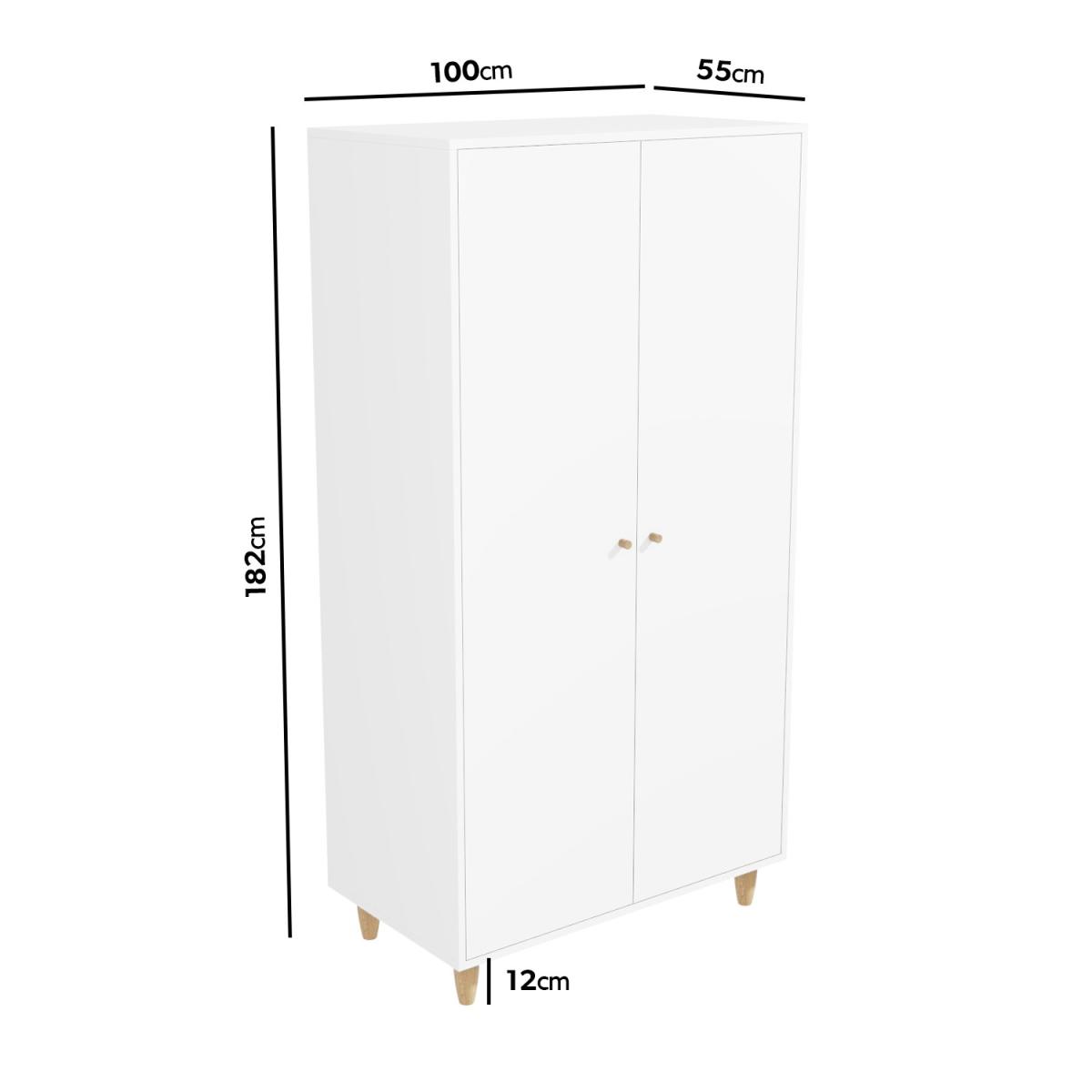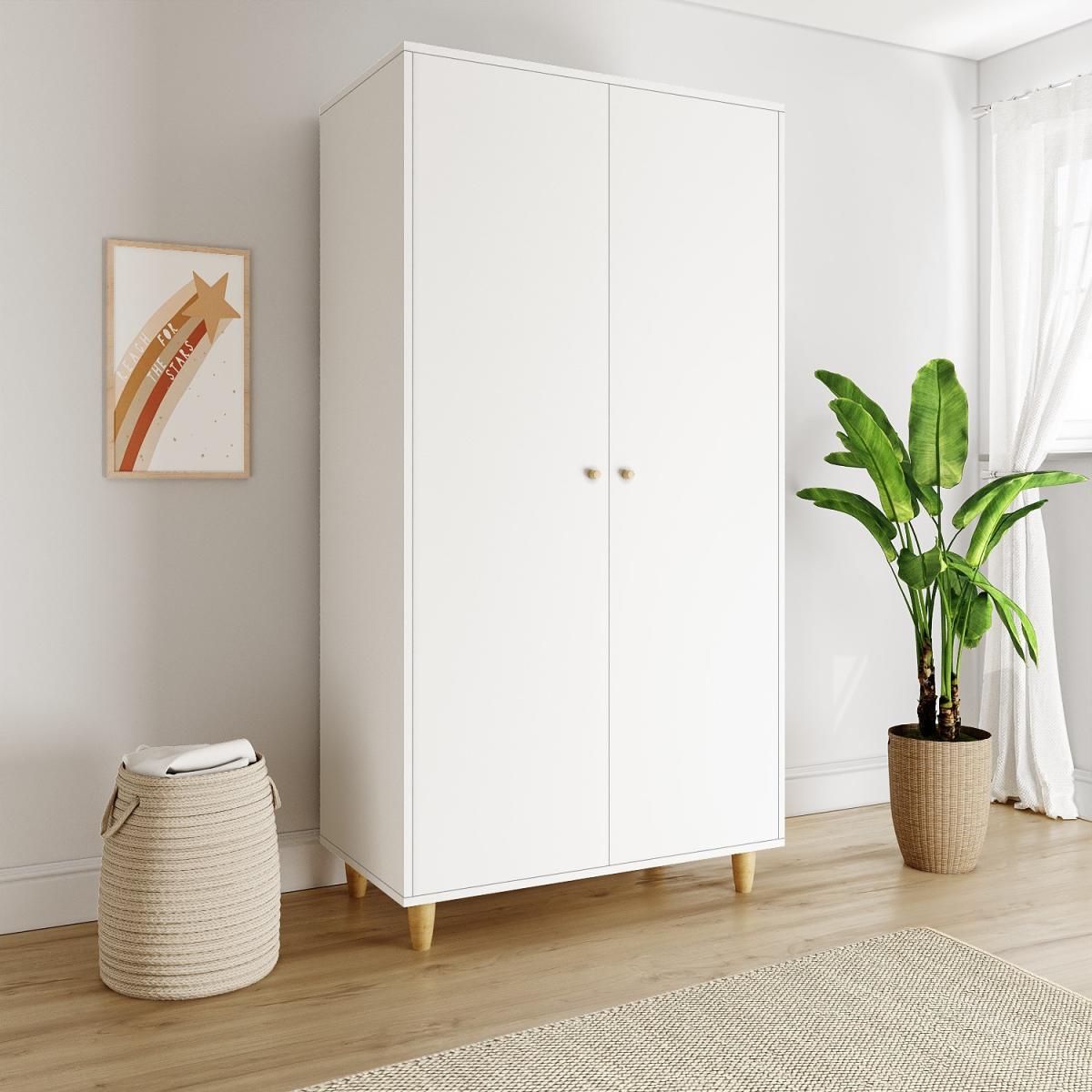 Features we love White Scandi-styled wardrobe with constrasting pine legs. With two adjustable shelves and a spacious hanging rail. Made from sustainably sourced New Zealand Pine. Creates a stylish Scandi-inspired look in any nursery. Matching cot bed / toddler bed and changer available Need to know. Packaging dimensions. Box 1 W63 x D174 x H10 cm / Box 2 W55 x D174 x H9 cm / Box 3 W63 x D110 x H19 cm Packaging weight. Box 1 28kg / Box 2 19.5 kg / Box 3 36kg Product dimensions. W100 x D55 x H182 cm Number of shelves. 2 Product weight. 83.5kg Colour. White and natural pine Finish. Painted and natural Material. Solid pinewood For use. Indoors Includes. Anti-tilt strap for the wall Assembly required. Yes. Conforms to European safety standard EN 716 2008+A1 2013 and British safety standard BS 8509 2008+A1 2011.