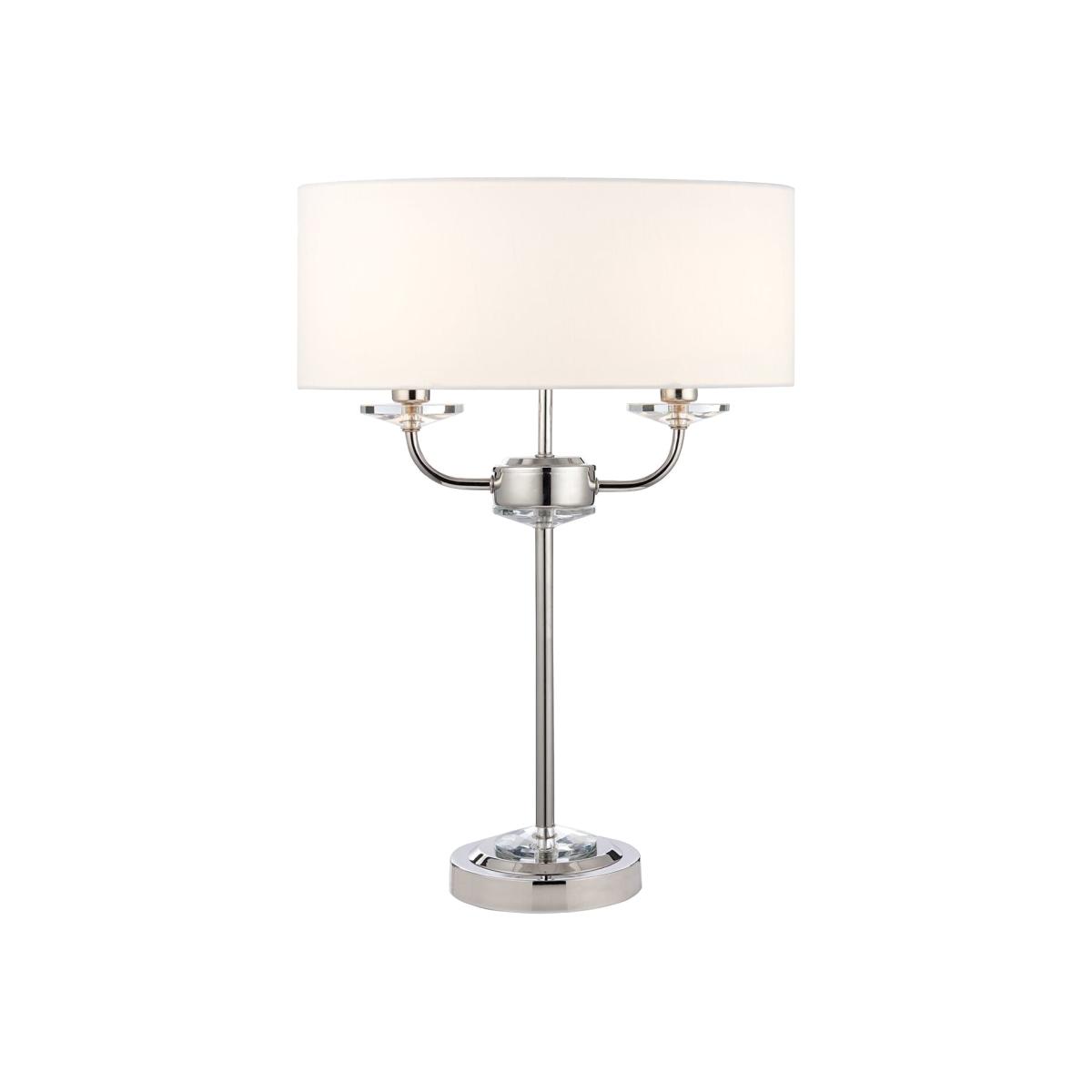 Dimensions W38 x H54 x D15 cm. The Nixon table light finished in bright nickel is completed by a vintage white silk shade and crystal glass detailing. Features. Constructed from steel crystal glass and fabric Bright nickel plate and vintage white silk shade. Inline switch supplied. Matching items availableLE D compatible Modern design Assembly required..