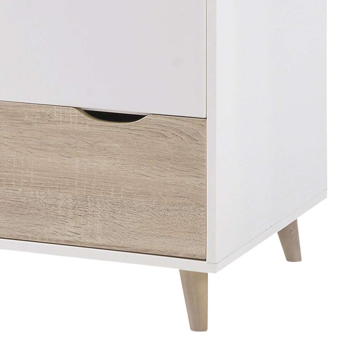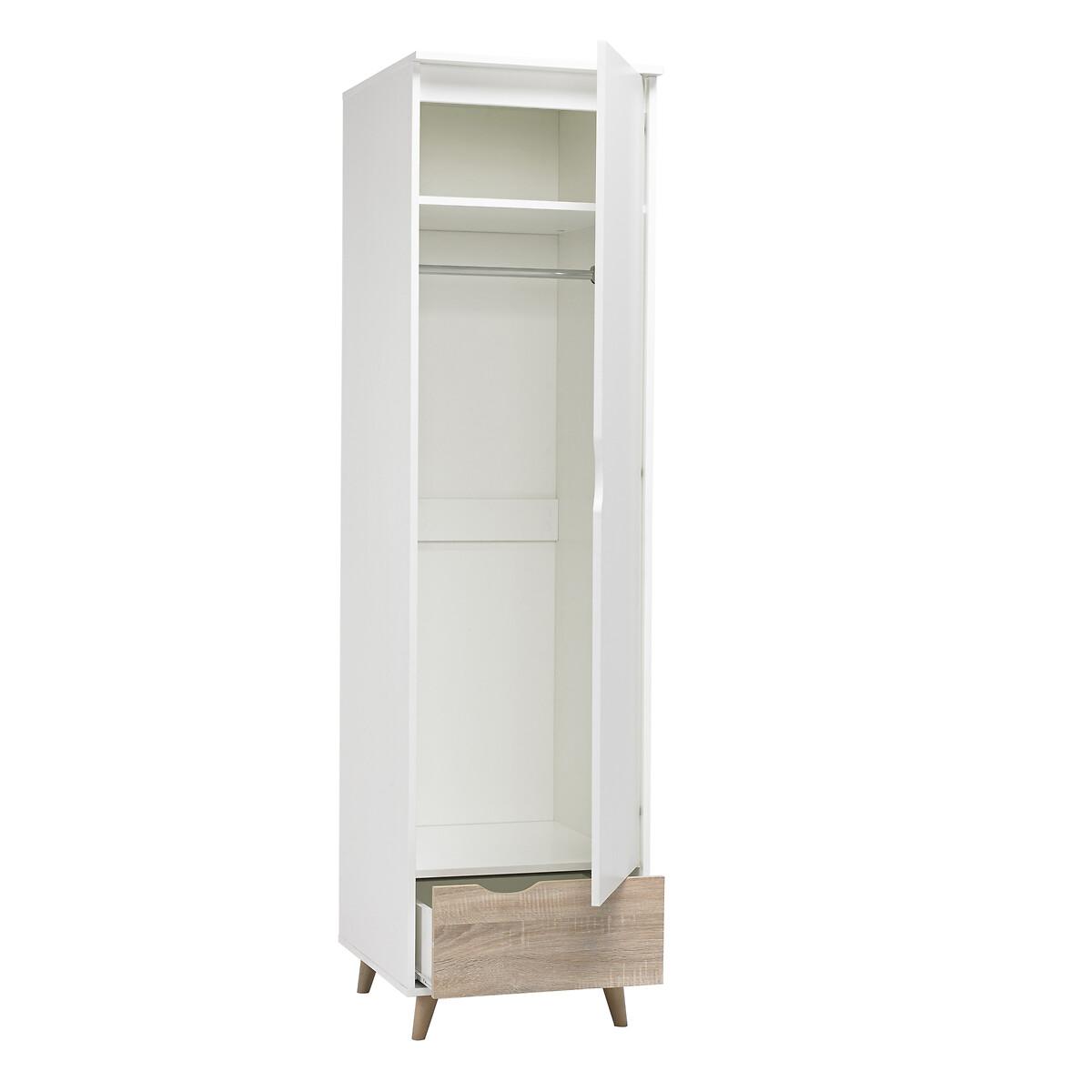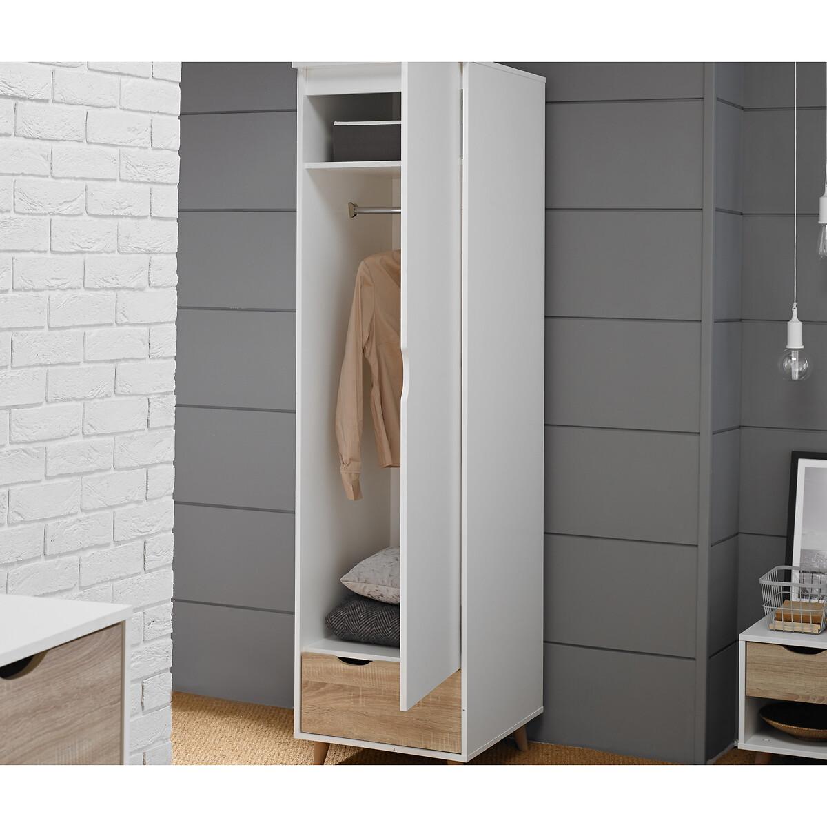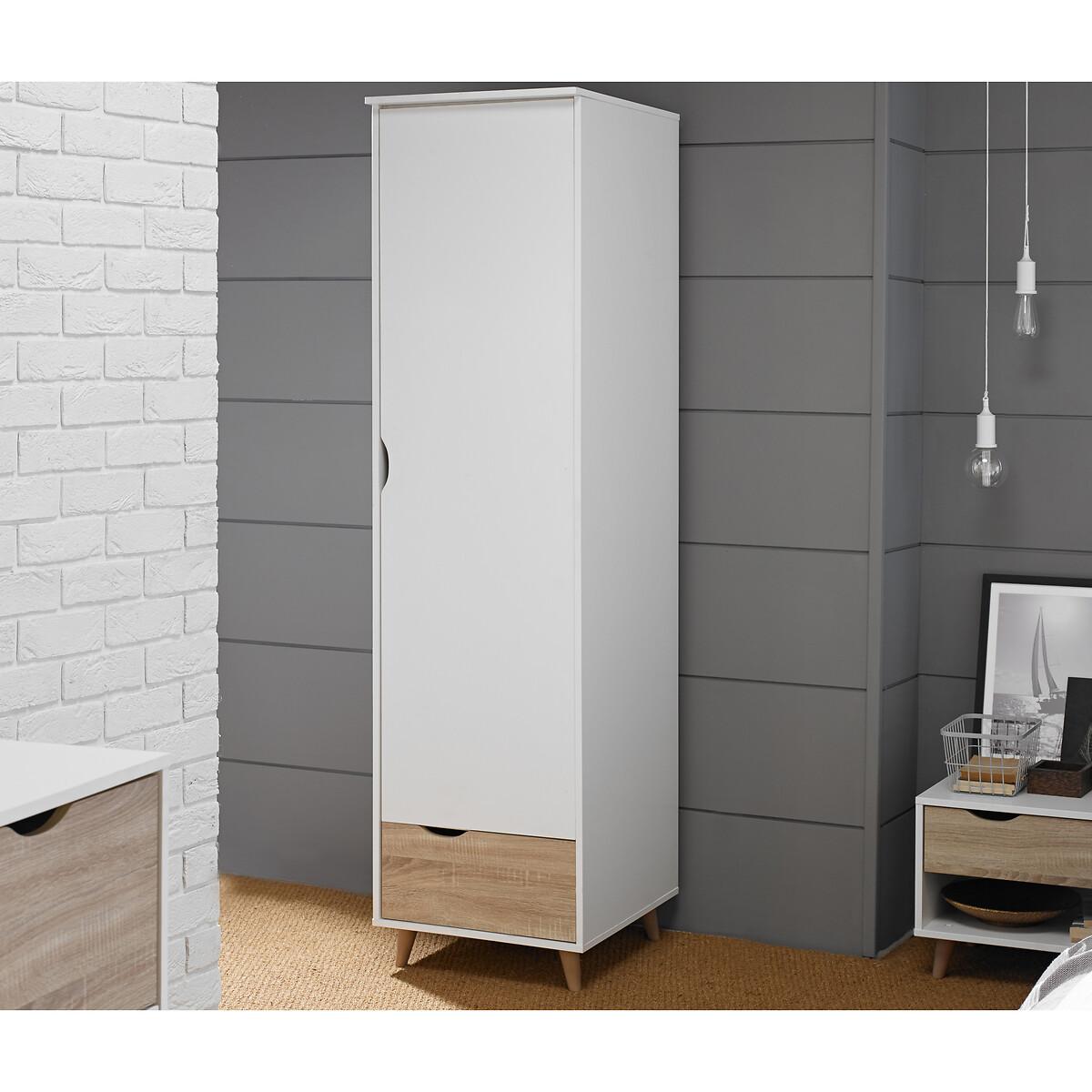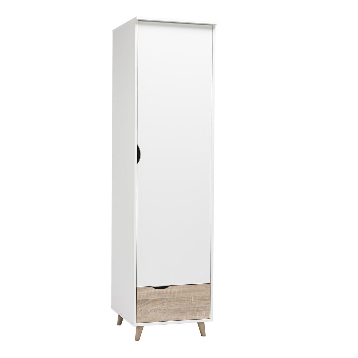 This 1 Door Wardrobe is comprised of a matt white finish carcass resting on delicate legs with a single drawer and door featuring integral handles. The ever popular oak front detail on the drawer coordinates the wardrobe with the rest of the range. Perfect for creating a sleek, retro style, team this piece with the complete bedroom range for a cool and refreshing space. Self Assembly Required. Product Dimensions: 58cmx50cmx190cm. Please remember to measure your available space before ordering. Parcel 1 Packaged Dimensions: 185cmx 60cmx 11cm Weight: 34kg Parcel 2 Packaged Dimensions: 65cmx 55cmx 15cm Weight: 20kg. Composition: MDFPlease note: this product cannot be be delivered to all Offshore Islands Northern Ireland or Republic of Ireland. This product will be dispatched by one of our trusted suppliers. You’ll be contacted by their selected courier about your delivery. LPD01