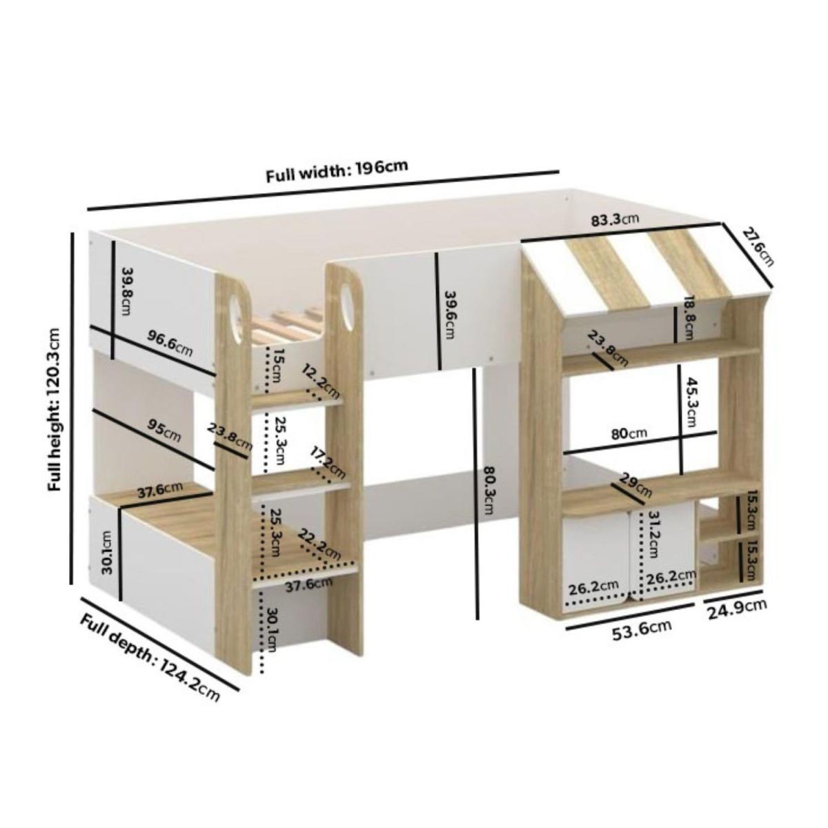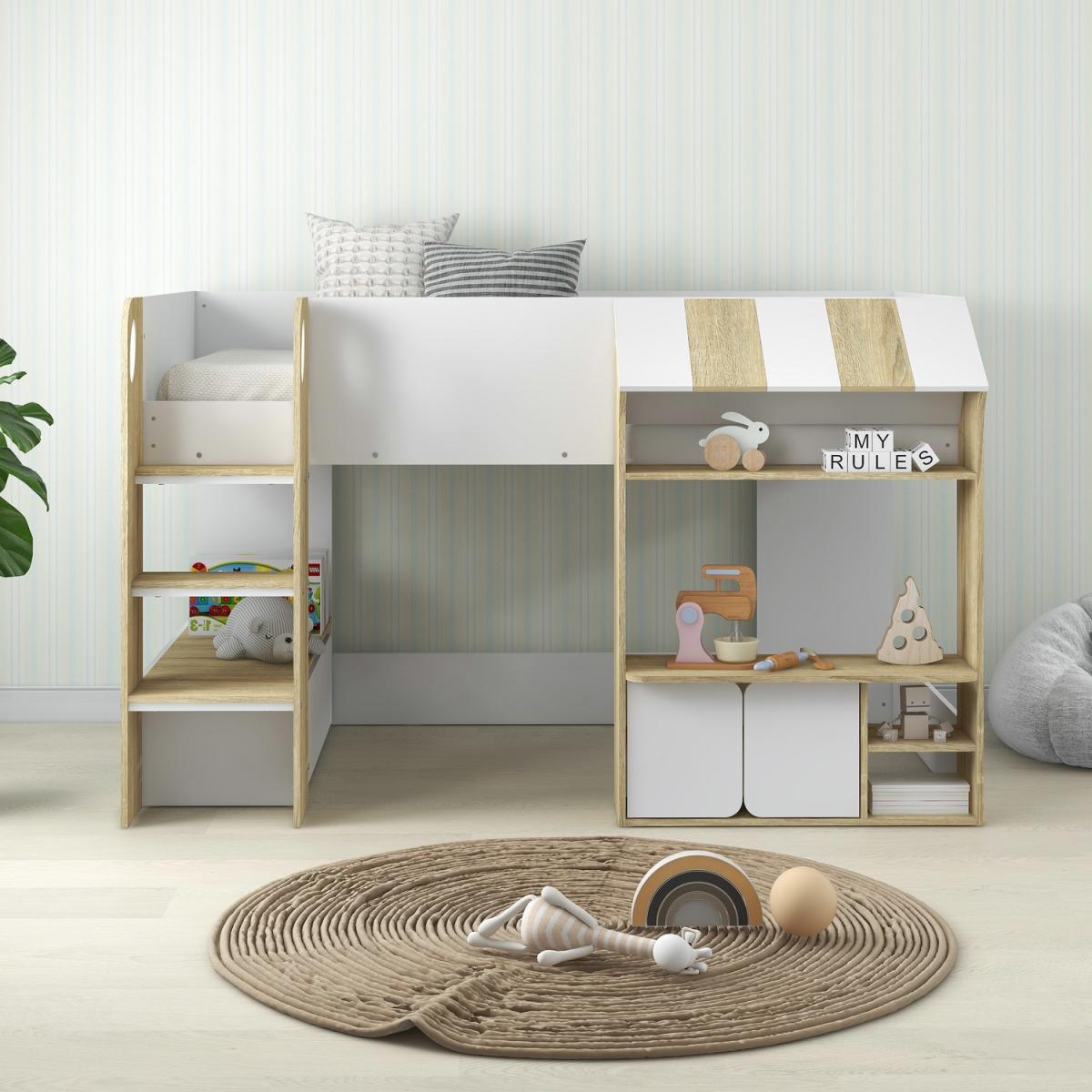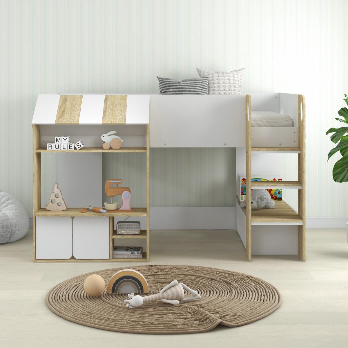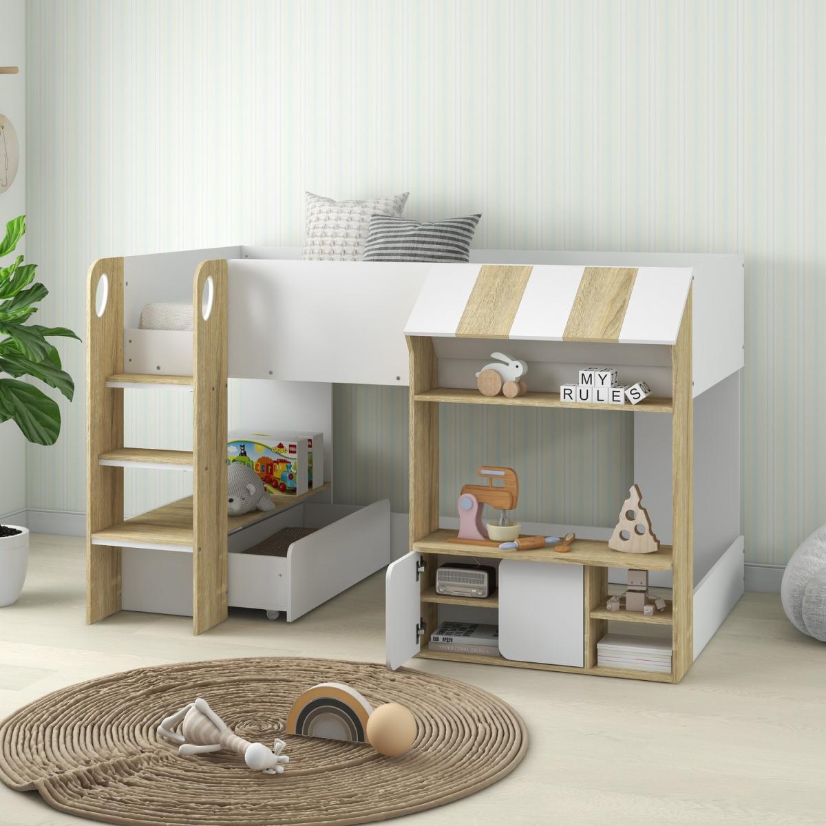 Combining fun and functionality, it creates a cosy, practical space your child will love. Comes with built-in shelves, a handy drawer, and a cupboard to keep everything neat and organised. Features an easy-to-climb, playful ladder that can be fitted on either side to suit your room's layout. The oak and white design blend seamlessly with any kids room decor, adding a touch of charm. Ideal for smaller bedrooms, it maximises space while providing ample storage and comfort. Transform your child’s bedroom into an organised, playful, and stylish space with the Marcel Midsleeper Bed. With built-in shelves, a convenient drawer, and a cupboard, it provides plenty of storage for toys, books, and other essentials to keep the room tidy. The easy-to-climb ladder has a playful design and can be fitted on either side, allowing you to tailor it to your room's layout. Its oak and white finish blends effortlessly with any kids' room decor, adding a touch of charm and versatility. The bed has a wooden slatted base and fits a standard UK single mattress, which is not included giving you the freedom to pair it with a mattress of your choice.