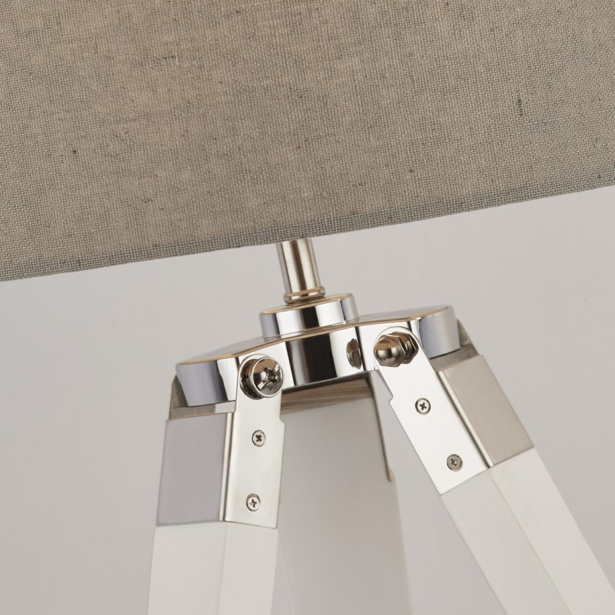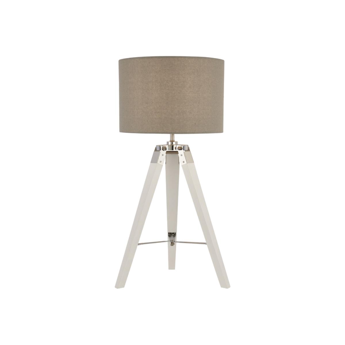 The wooden tripod legs of this table lamp have been whitewashed to give a distressed feel and chrome metal work which works well in modern, light living spaces and offices. The shade is a simple yet stylish pale grey fabric which works perfectly with the wood, leaving a truly modern lamp. Use it by itself or with the matching floor lamp.