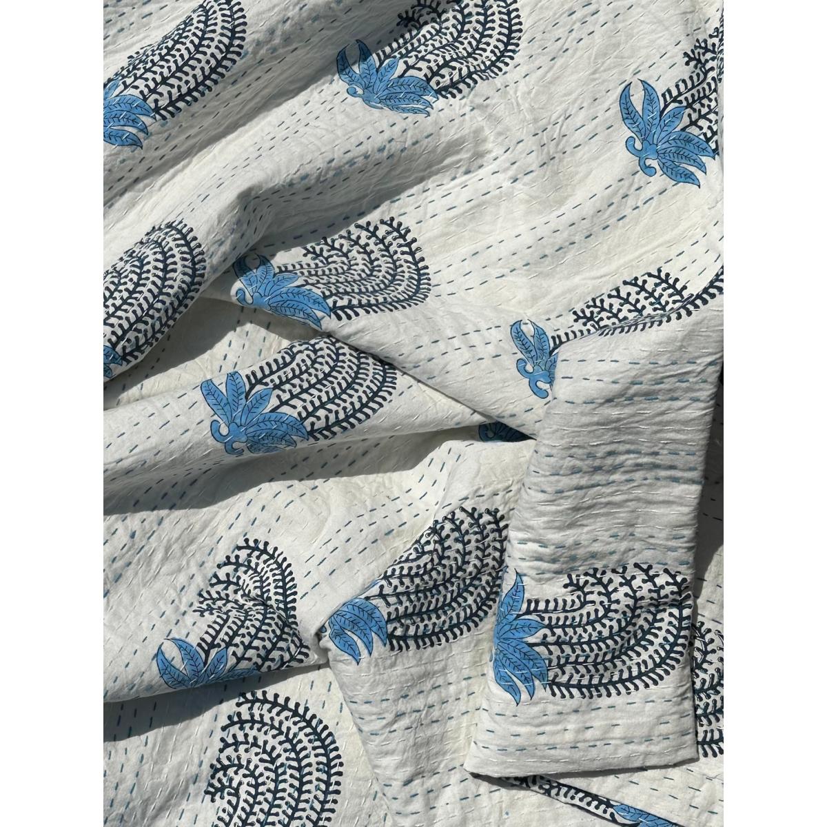 This throw is made from 100% cotton with a hand block print design. Each one is unique. Kantha (meaning: “patched cloth”) refers to both the tradition and craft of producing these unique, quilted blankets (making something useful and beautiful out of discarded items), as well as the stitch itself (a small, straight running stitch in Bengali embroidery). Kantha quilts are layers of cloth stitched together using this regional technique. You can judge the quality of Kantha by the stitch size and by the weight of the product. This is the perfect artisanal addition. Can be used for a sofa cover, blanket, throw or take to the beach.