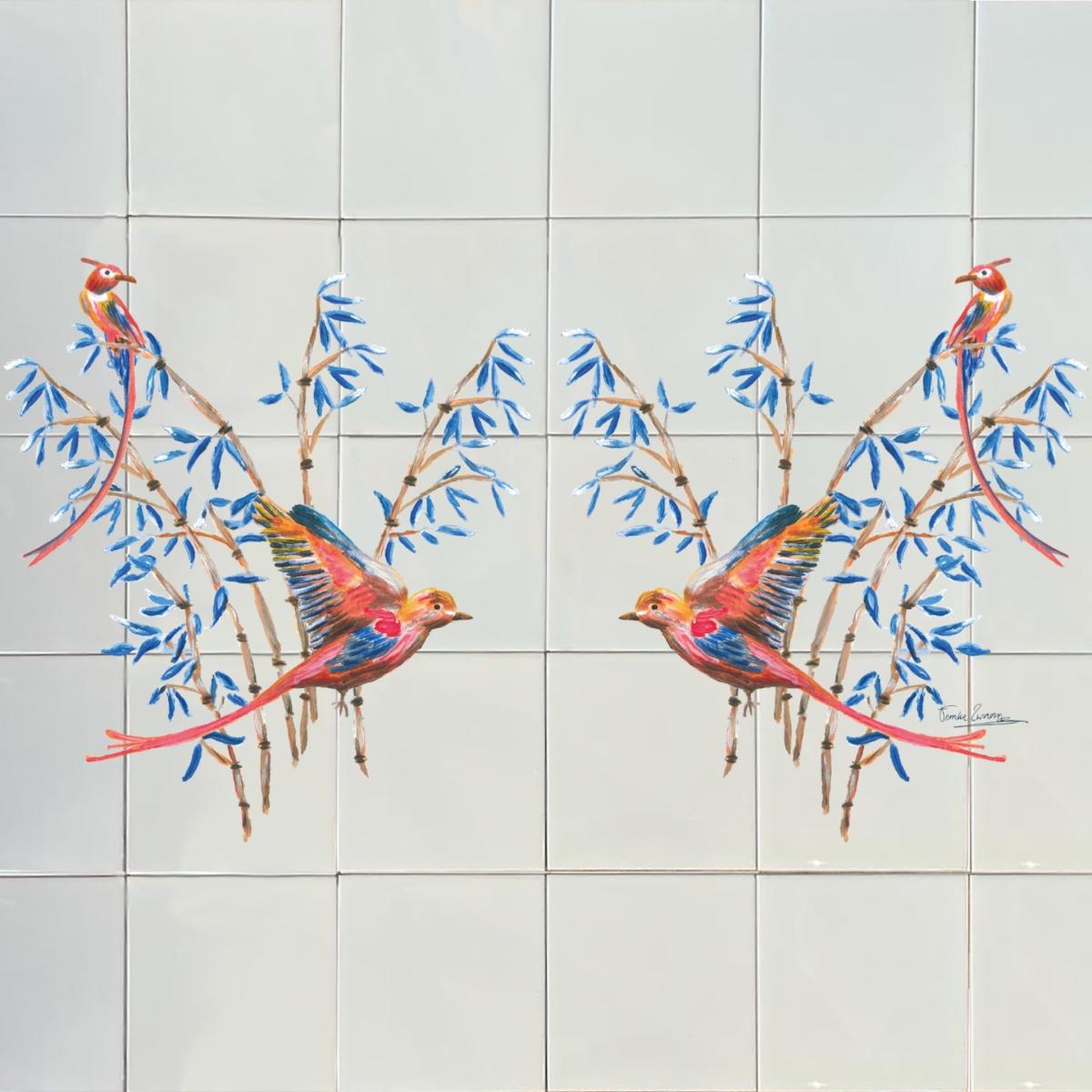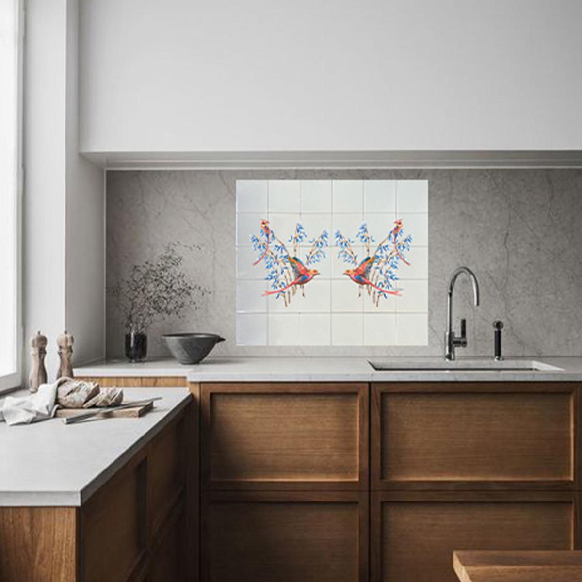 Tiles to love! A tile backsplash in your kitchen or bathroom is an absolute eye-catcher. The backsplash tiles are custom-made with original hand-painted designs by Femke. The drawings are inspired by flora and fauna. Originally hand-painted illustrations printed on ceramic tiles, treated after printing to make them water-repellent. Calculate how many tiles you need. The tiles have a size of 15.2 x 15.2 cm. A tiler can trim the tiles if necessary.
