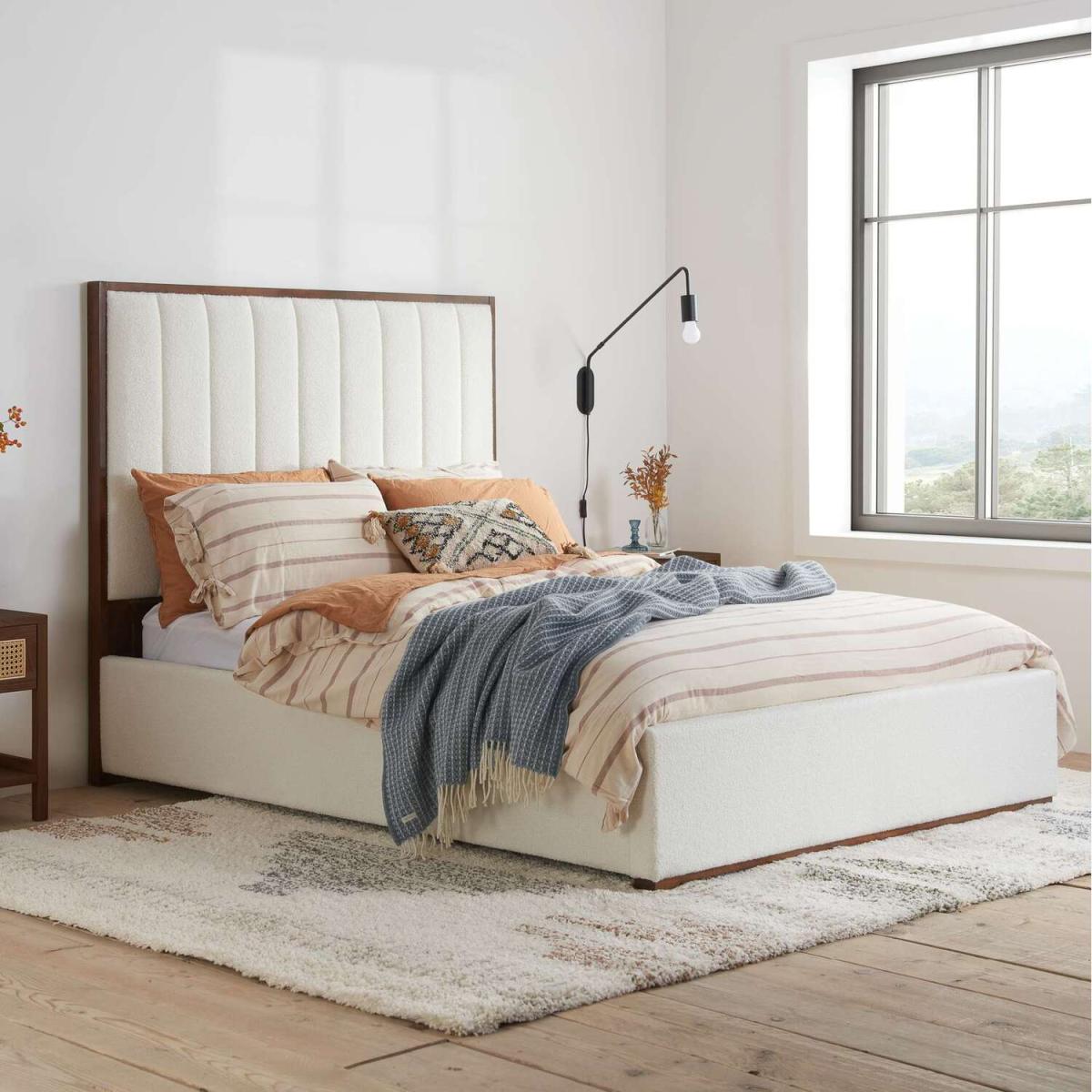 Discover the epitome of comfort and craftsmanship with this bed, a piece that blends classic design with modern flair. Wrapped in a textured boucle fabric, the bed is a testament to understated elegance. The bed's headboard stands tall, upholstered in a clean white boucle fabric that contrasts beautifully with the warm, rich brown of the base, making a striking statement in any bedroom. The design is completed with meticulous attention to detail, including a chic trim that lines the base, giving the bed a bespoke look that's both luxurious and inviting. Please note: All Birlea beds are ideally suited for a UK standard size mattress, with a recommended maximum mattress height of 305 mm, ensuring a perfect fit and an optimal sleeping experience.