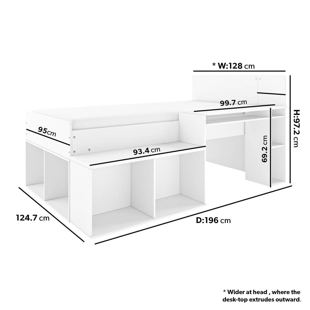 The Ellison white mid-sleeper bed is ideal for studious kids, teens or students, providing them with the perfect spot to do their homework. It's the perfect bedroom space-saving solution thanks to the built-in desk, taking them from study to sleep, with versatile storage options, which include various shelves and compartments. The desk can also double up as a bedside table. It fits a UK single mattress, which isn't included, so you're free to select your perfect mattress.