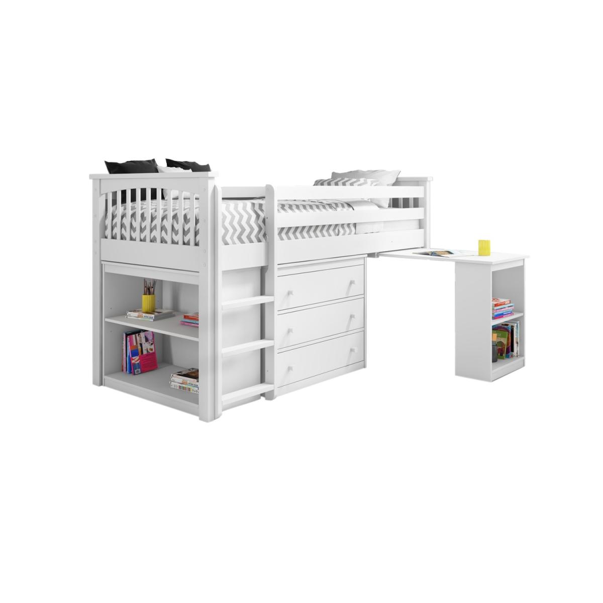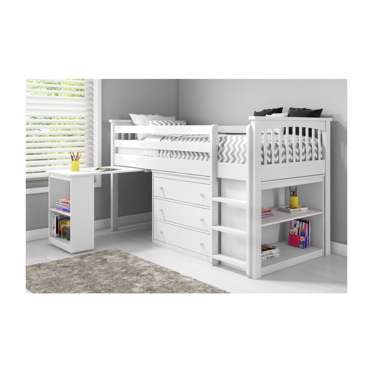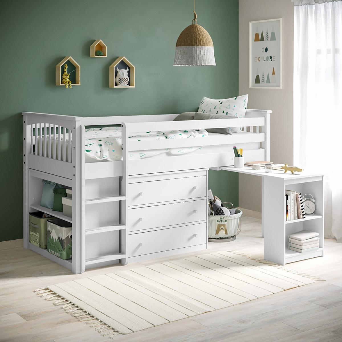 Features we love Simple white finish and unisex design. The compact design is great for saving space. The pull-out desk is ideal for creative projects. Desk is on castors for easy manoeuvrability Ladder can be fitted to either side Use our deal to save 10% on selected mattresses All about me. If you're looking for the perfect solution to save space in your child's bedroom then the Windermere Mid Sleeper is ideal for you. Putting all their bedroom furniture together into one compact piece this convenient design leaves floor space for your kids to play however big their room is. With a simple white finish this bed is great for boys and girls suiting any decoration style and colour. Featuring a raised bed with a reversible ladder this mid sleeper is perfect for any room layout. Underneath it offers a chest of three drawers and a two shelf bookcase which are both freestanding and can be swapped around for easier access. That also means cleaning is less of a chore too!There's also a pull-out desk so your kids can do their homework in peace without permanently taking up vital floor space. With two shelves built-in here too it adds even more storage space. The bed fits a standard UK single mattress (90x190cm) – this isn't included but we've included some recommendations at the bottom of the page. Built using a combination of both solid pine and MDF components the Windermere Mid Sleeper will stand the test of time and handle the vigour of kids at play no matter how boisterous! It is delivered flat-packed meaning self-assembly is required. We'd recommend two people work together to do this due to the item's size. Need to know Dimensions. W200 x D101 x H116.8 cm Chest of drawers. W83.8 x D40.6 x H69 cm Bookcase. W83.8 x D40.6 x H69 cm Desk. W93.5 x D50 x H67.3 cm Max Weight Capacity. 80 kg Material. Wood Finish. White Mattress included. No Mattress size. Standard UK single (3ft/90x190cm)Assembly Required. More info Mattress height should not exceed 18cm Compact space saving design. All the furniture underneath is freestanding arrange it to suit your needs. White finish easily coordinates with all decors. Assemble the ladder to the left or right side to suit your space Desk sits on castors to easily store away when it's not needed. Chest of three drawers with classic round handles. Solid top bunk safety rail Combination of pine and MDF components withstand the test of time Wooden slatted bed base. Fits a standard UK single mattress (3ft/90 x 190cm)Self-assembly required. More colour options available..