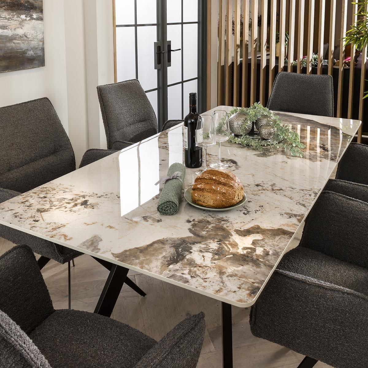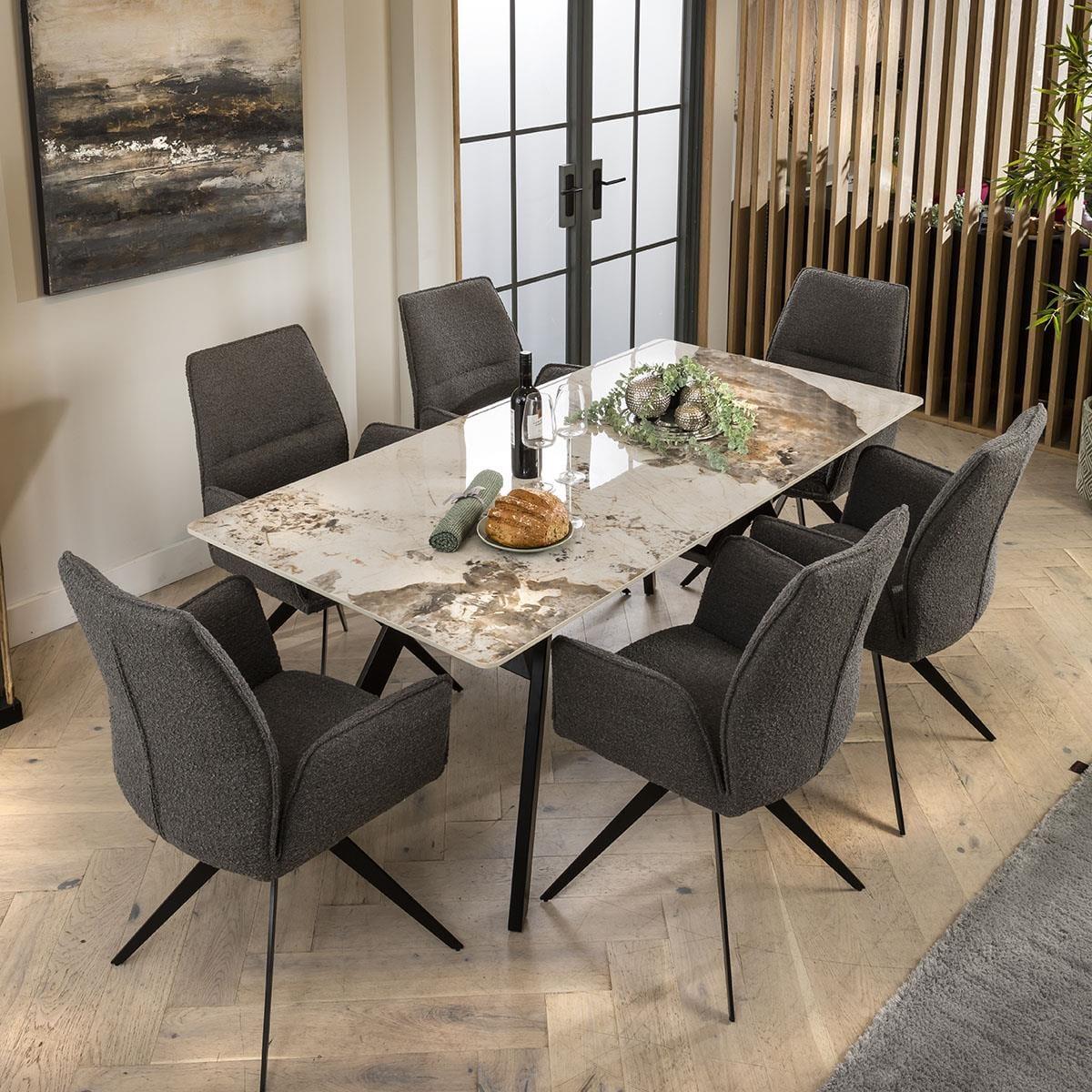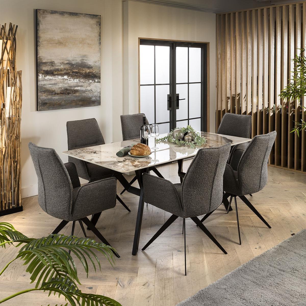 Experience the allure of cutting-edge design meeting opulent charm in our modern dining ensemble. Centred around the Aldgate white ceramic marble dining table are six of our Nova dining chairs, upholstered in contemporary grey boucle fabric. Transform your kitchen or dining space with this modern 6 seater dining set. Our ultra-modern, ultra-luxurious Aldgate marble-effect dining table has a high-quality white ceramic top that is scratch, stain and heat resistant. The black powder coated metal legs have an edgy design, perfect for any contemporary kitchen or dining space. This 180cm dining room table is perfect for this 6 chair dining set. For contemporary elegance and comfort,there is the Nova dining chair. Crafted to perfection, the 6 dining chairs in this set boast a sleek and innovative design, wrapped in a durable grey boucle fabric. With its unique carver style featuring comfortable arms and metal swivel base, this chair is a true testament to modern luxury. This 6 seater dining set combines modern Nova chairs with the stunning Aldgate table. Whether you love the Nova chairs and would like to purchase them individually, or you think the Aldgate table would complete your interior scheme better with another chair, you can easily mix and match our modern dining tables and chairs to curate something truly unique. Table Size W180cm D90cm H76cm Chair Size W64cm D64cm H92cm Dining Table And Chair Set For 6