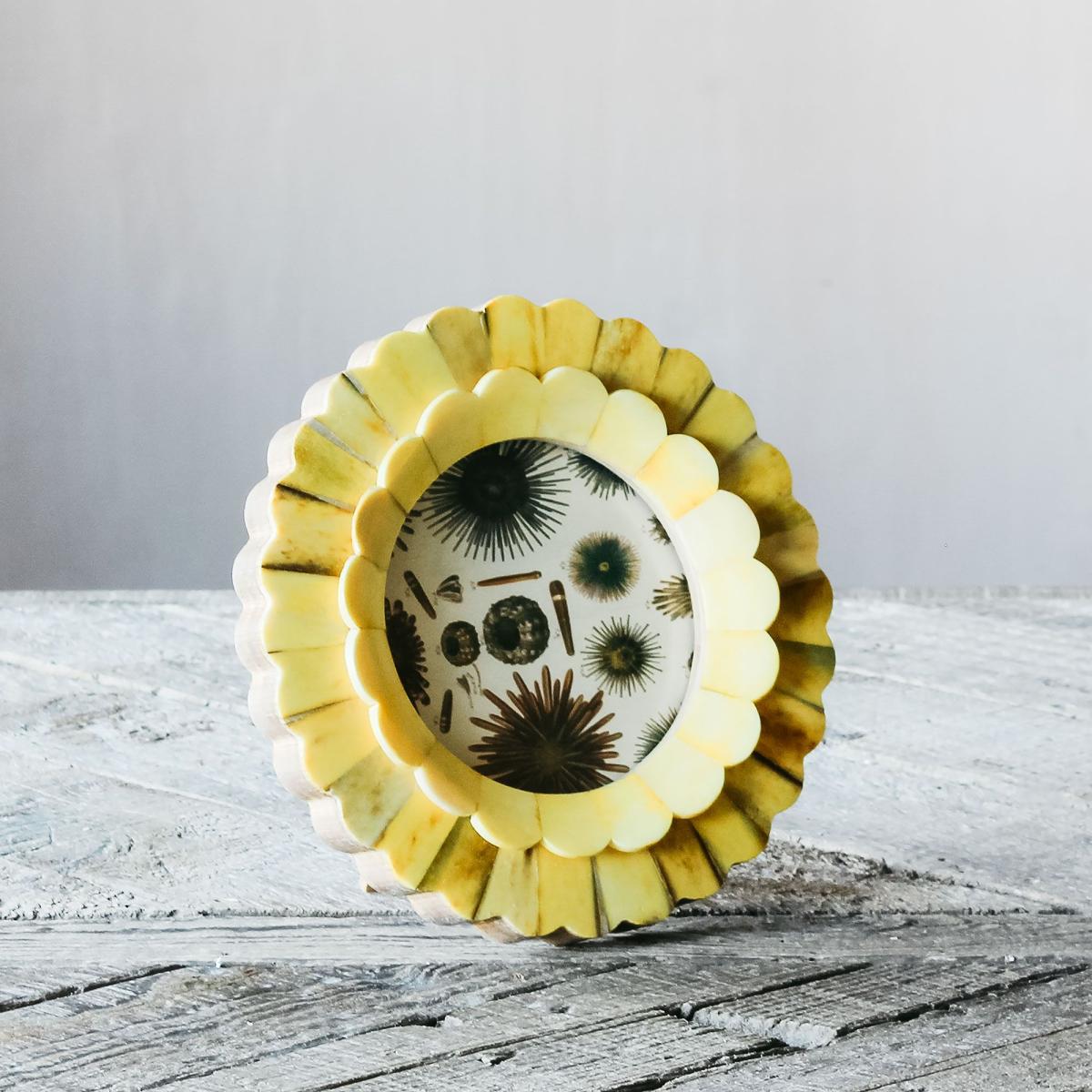 A dainty bone frame in the shape of a daisy with layers of pretty scalloped petals for portraits of friends and family.
