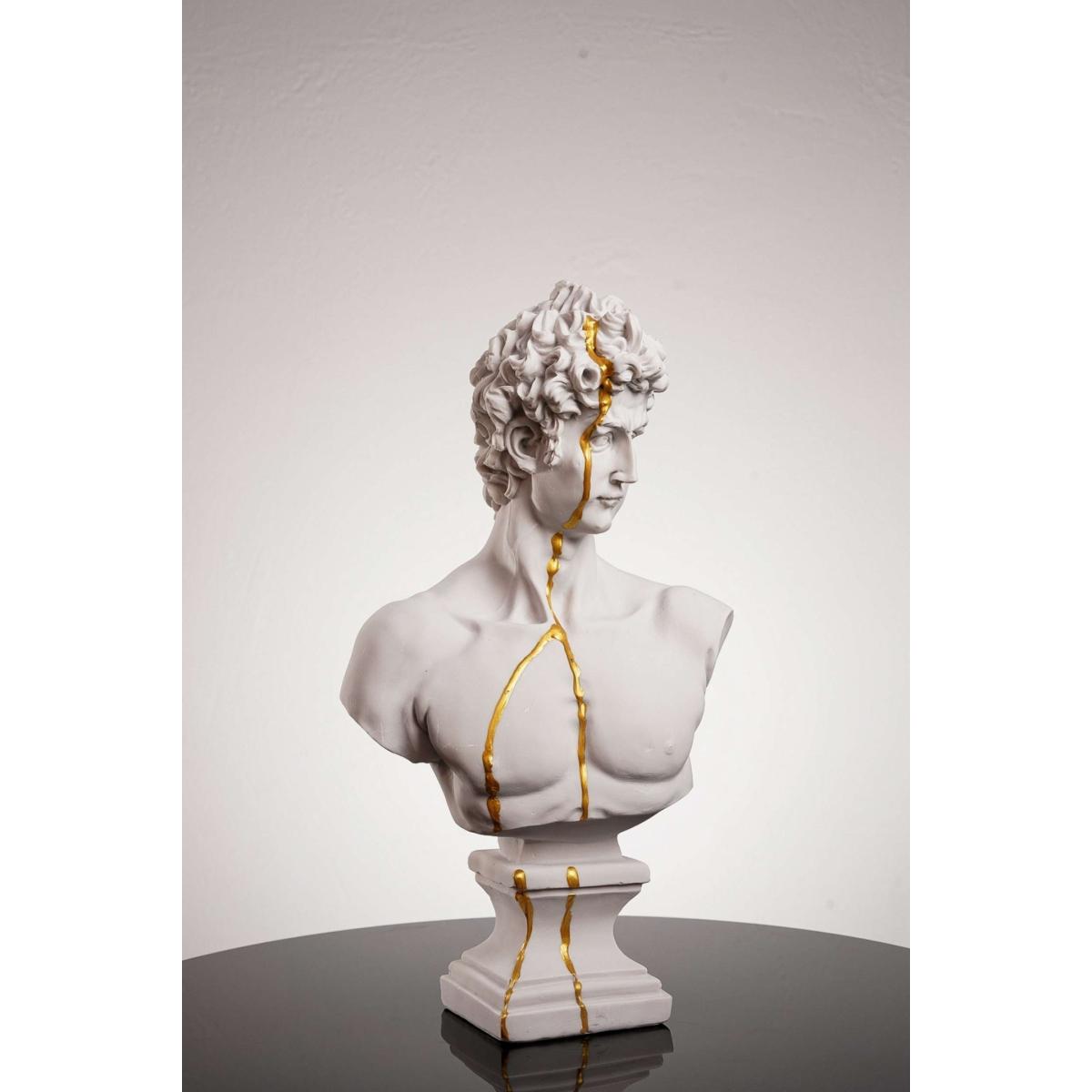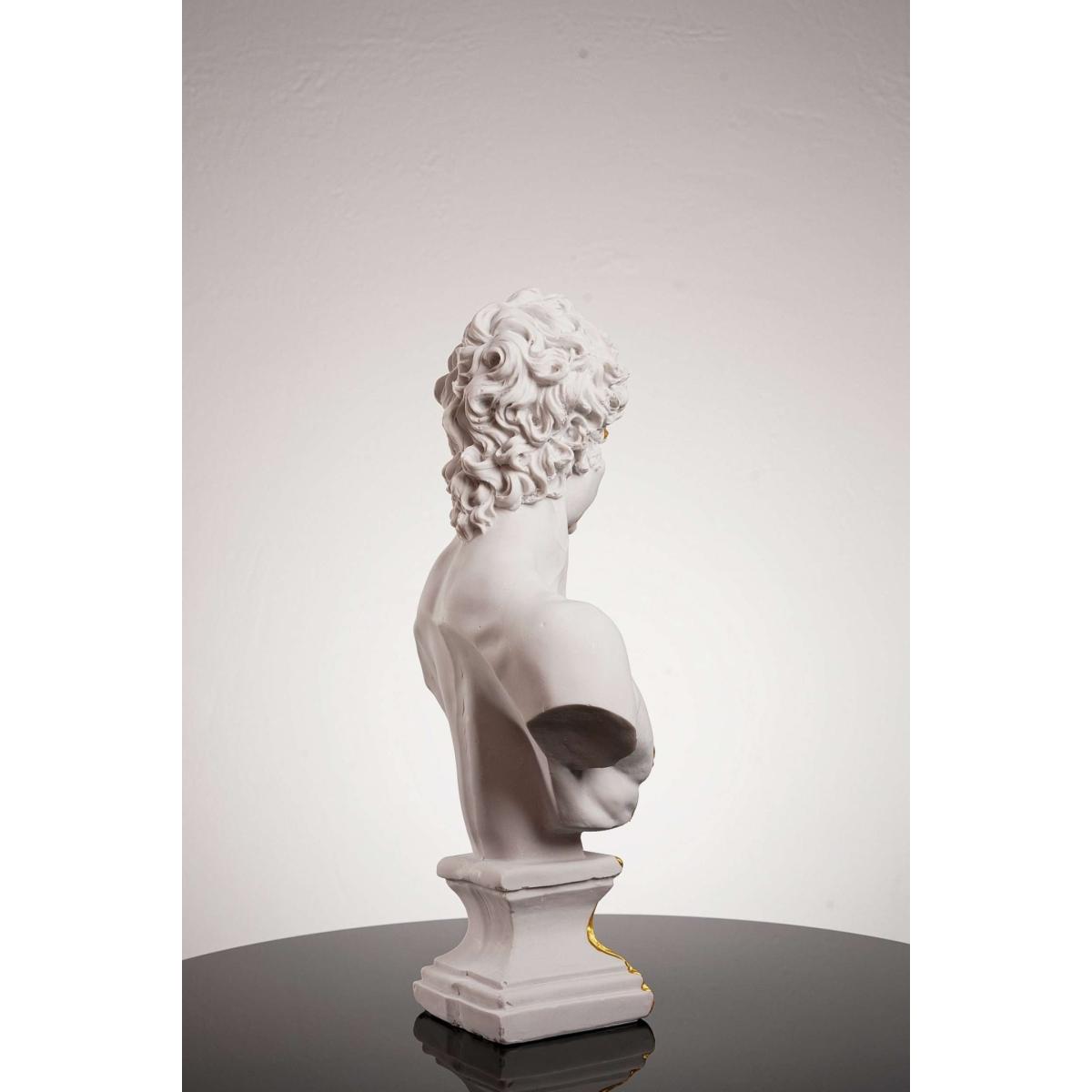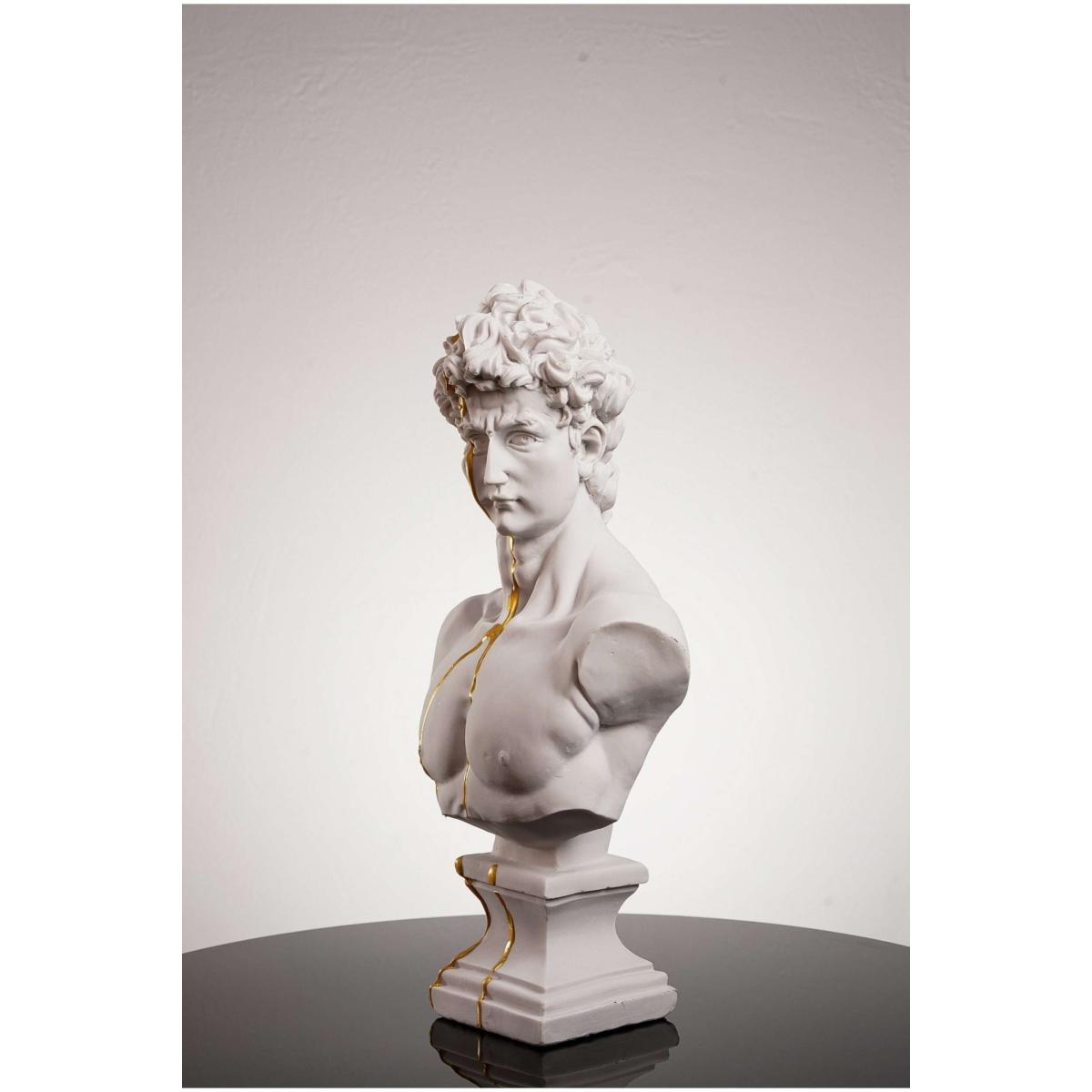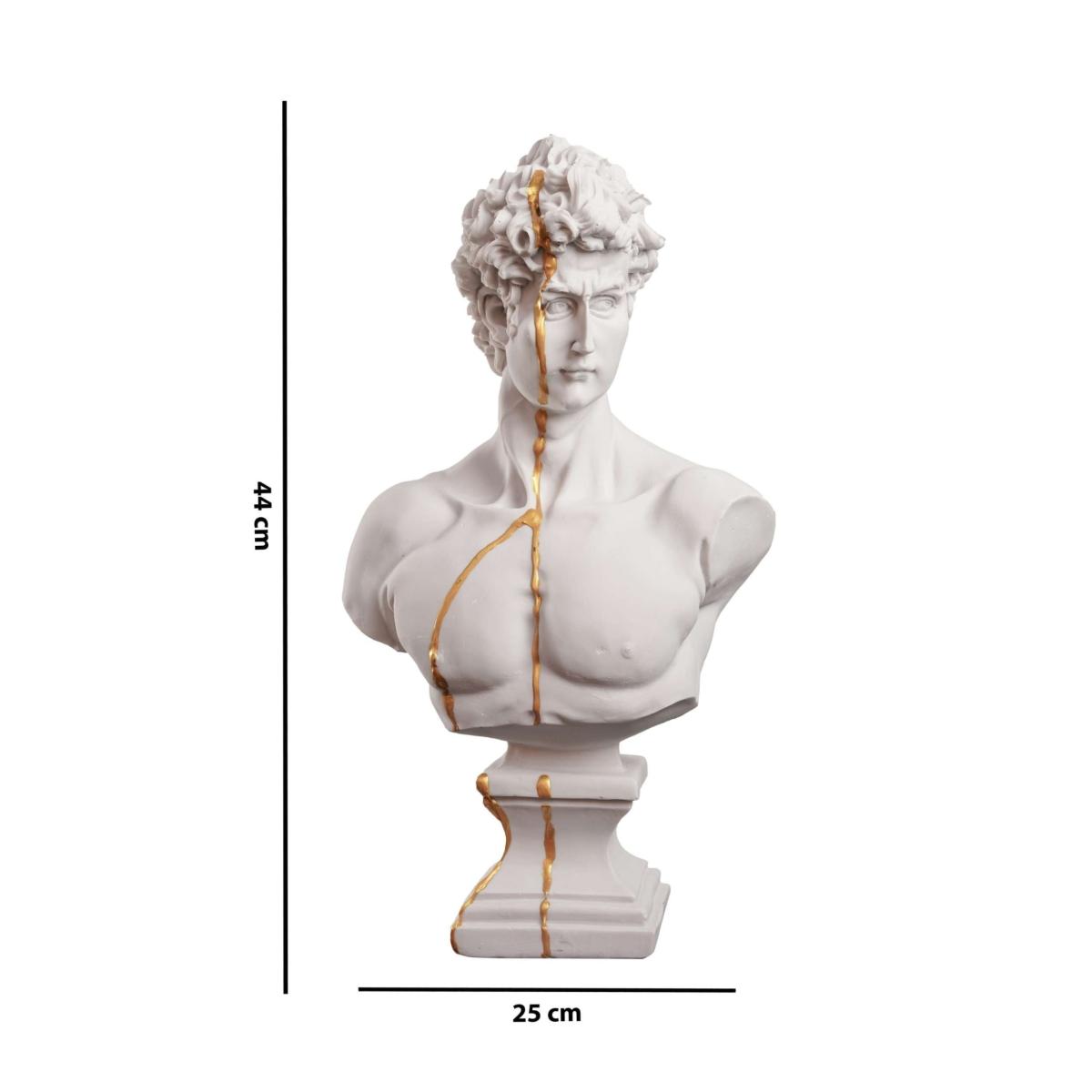 You can never have too much true beauty in your home. David, one of the most beautiful figures in the world, is here to complete your decor. This David bust is crafted to mimic Michaelangelo’s David on a smaller scale. From his signature curls to his chiseled face, this bust brings Renaissance art to life. Plus, it features a delicate stream of gold for a modern take on the figure. This David bust is handmade for perfection. Made with high-quality plaster, David’s Beauty is yours to keep. Note that the gold is not authentic gold.