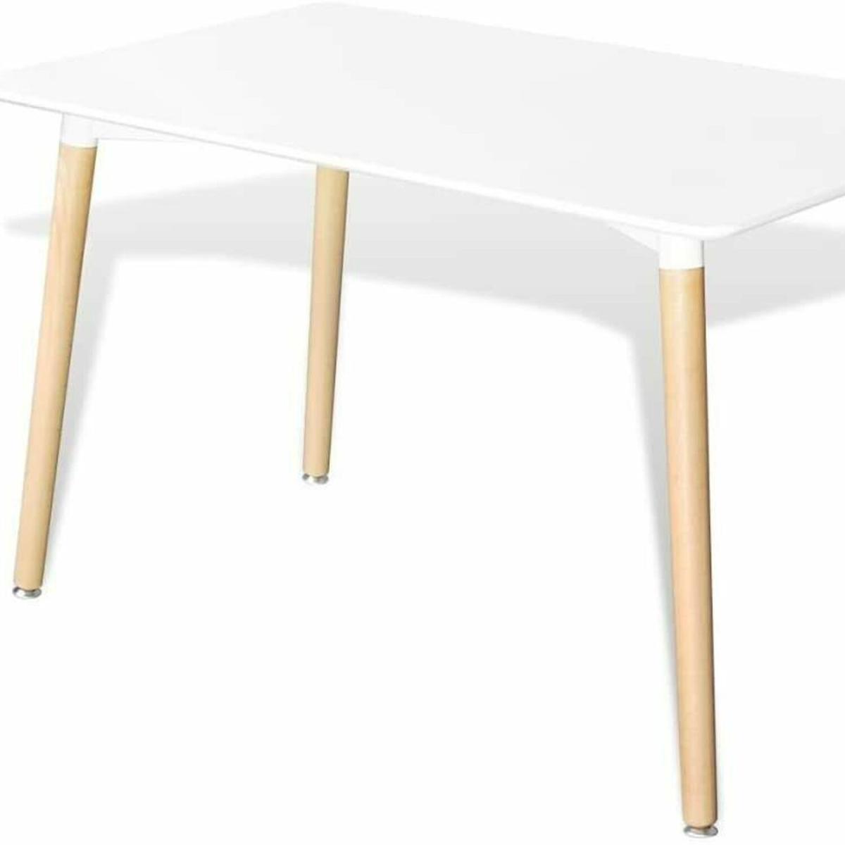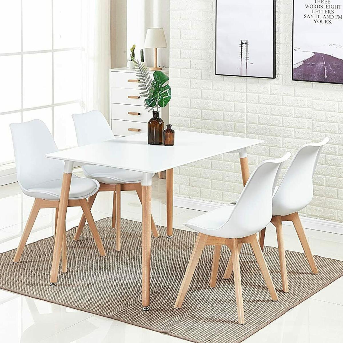 White Wood Style rectangle Dining Table comes with 4 White Chairs. Strong Sturdy Made of premium plastic, wood and PU leather seat, high quality and durable. Both chairs and table come with Plastic glides for floor protection. Basic assembly is required, The White colour in our selection complements any decor. Ultra-stylish and surprisingly comfortable, the iconic chair is made from a moulded shell that's designed for every 'body', All fittings and instructions are included.