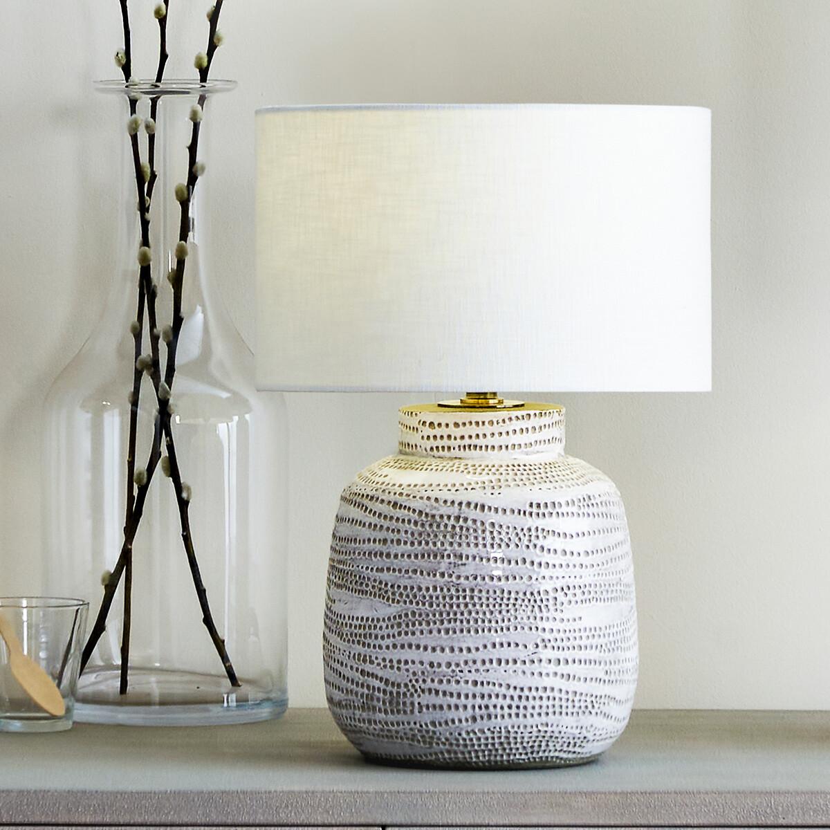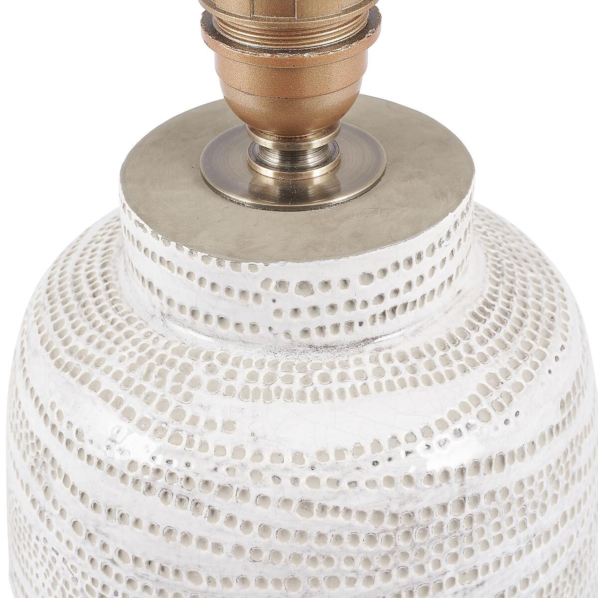 A delicate spot design adorns this petite pot making it the perfect addition to a side table or console. Finished in a matt white which allows the grey textured spots to stand out. This table lamp base is sold without a shade so that you can personalise your space and make it your own. Recommended lampshade size: 30cm dia. Product Dimensions: 18x18x27cm Bulb Type:E27 Gold plastic Maximum Wattage:60W Bulb Included?:No. Number of Bulbs Required:1Cable/ Switch Info:Black plastic, 2x0.75mm², 2m, Black in-line switch (40cm from base)This product will be dispatched by one of our trusted suppliers. You’ll be contacted by their selected courier about your delivery.