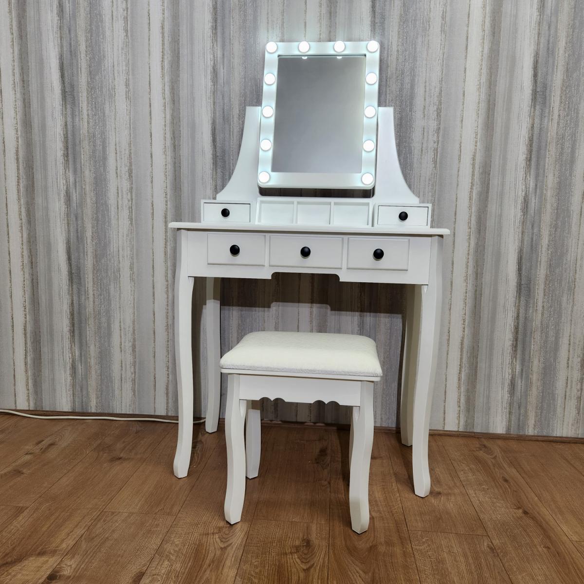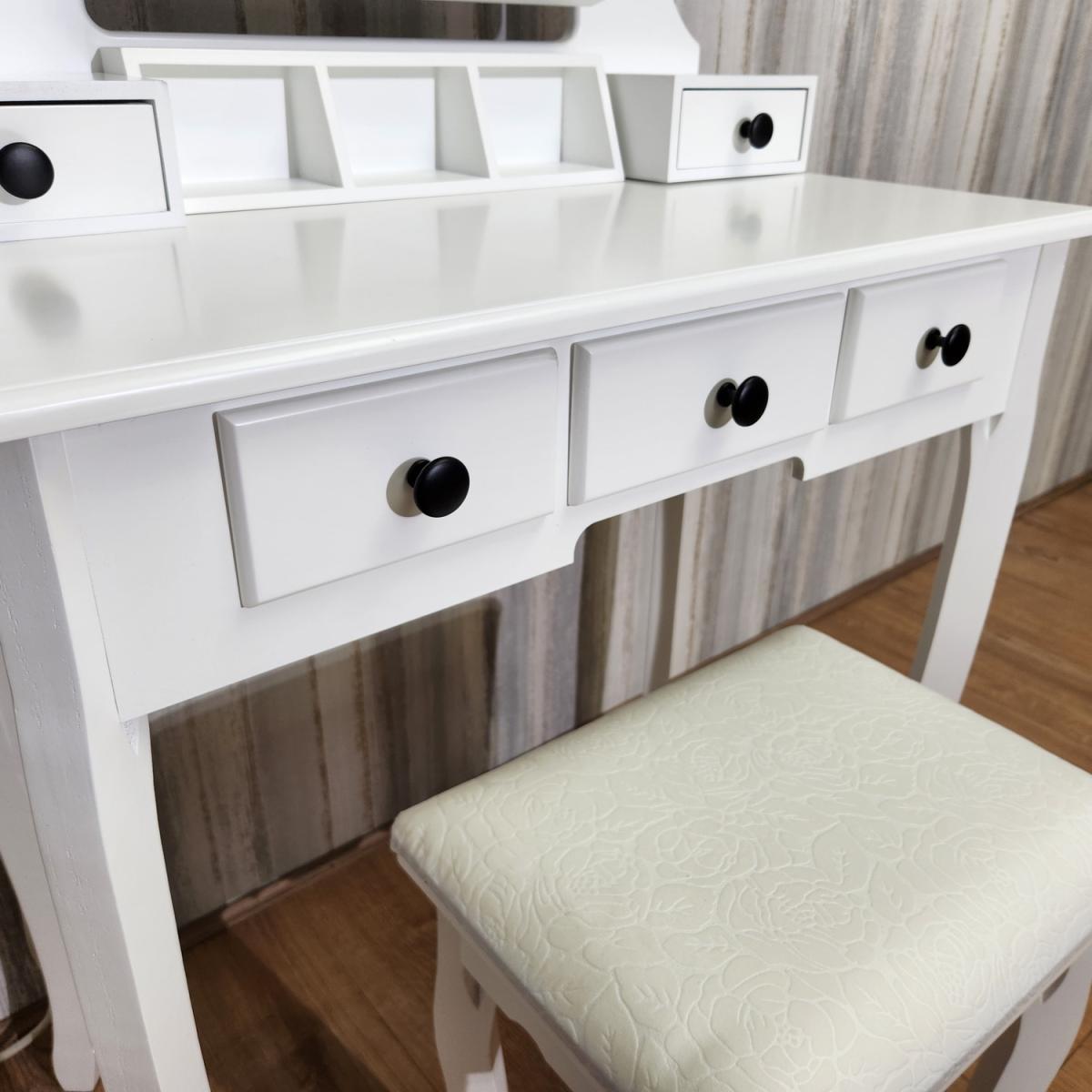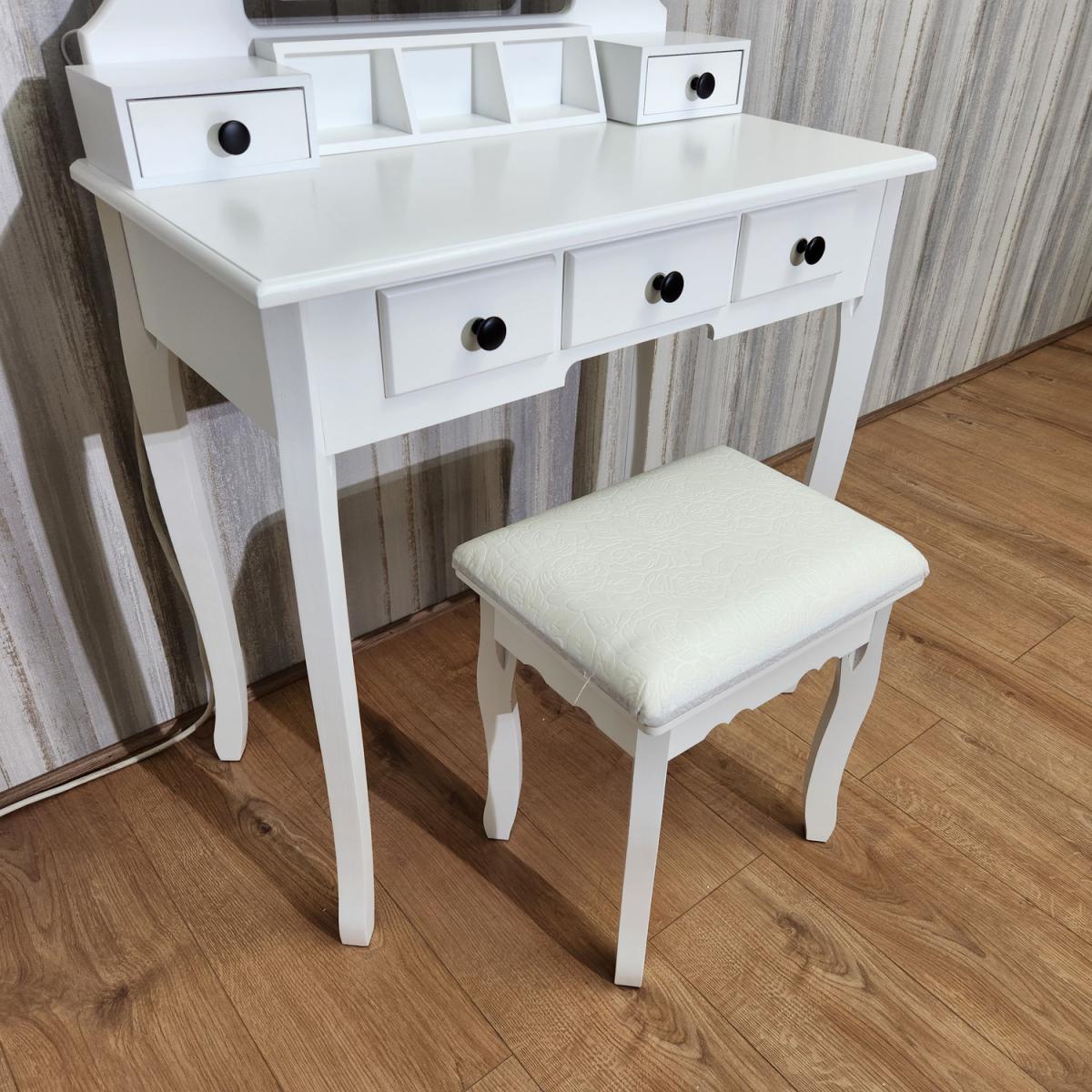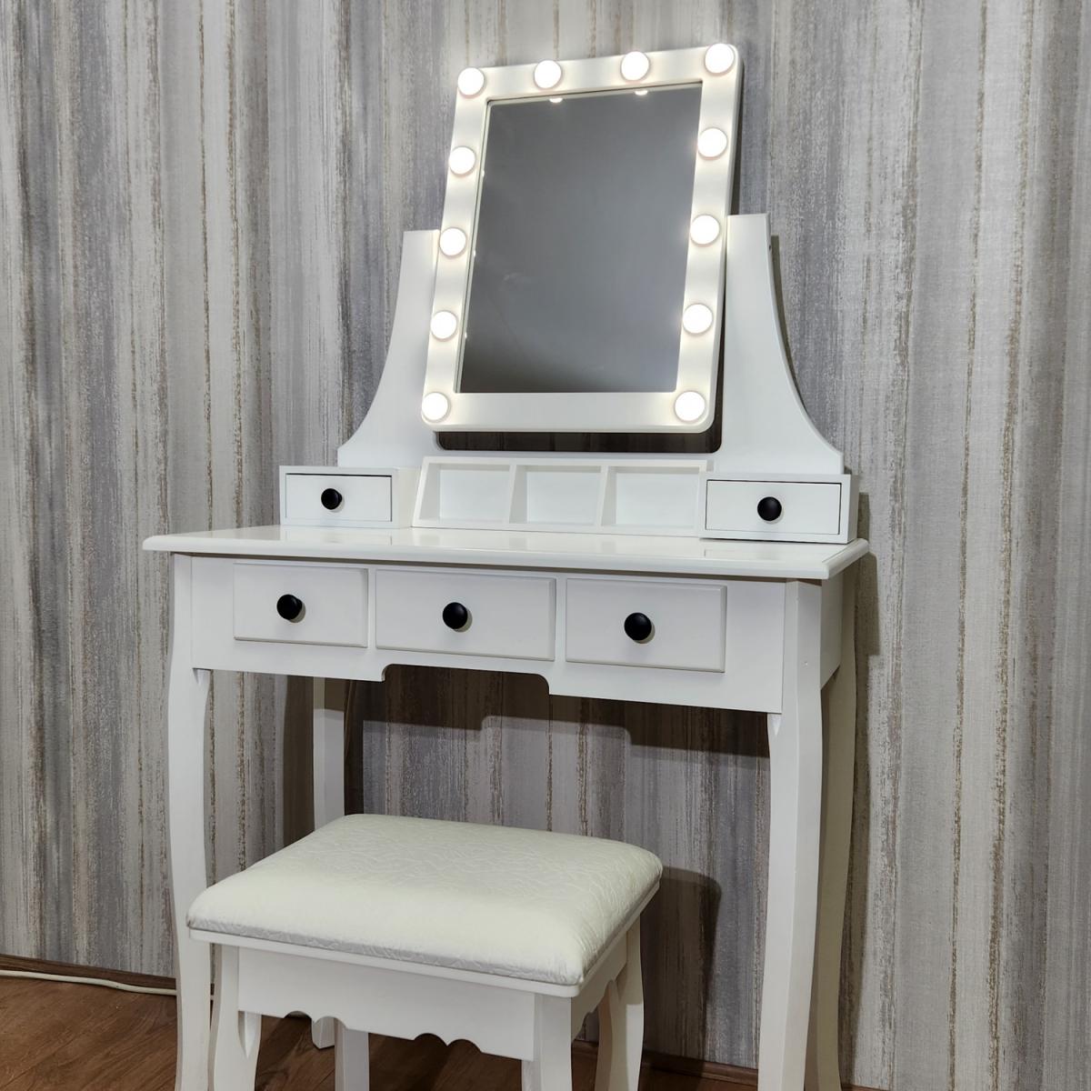 Introducing our exquisite dressing table that emanates timeless elegance with its flawless white finish and impeccable coating. The intricate carved and hollow details bestow a touch of sophistication, transforming it into a captivating decorative centerpiece that perfectly complements any home decor. Preparing your makeup at this vanity is an enchanting experience that will elevate your mood and create a tranquil ambiance. Equipped with adjustable lighting options, this dressing table comes with 12 LED bulbs, offering three distinct modes: cool white, warm white, and warm yellow. Effortlessly customize the brightness to suit various lighting scenarios, enhancing the versatility of the table. The soft and graceful illumination provided by these lights will accentuate your flawless makeup application, boosting your confidence and allure. Designed with both style and functionality in mind, this dressing table features a generously sized 360-degree rotating mirror, allowing for convenient angles and optimal viewing. It boasts five small drawers designed with anti-slip features, providing ample storage space for your essentials. The accompanying printed stool features a comfortable seat cushion made of flame-retardant material. To ensure stability, non slip stickers are thoughtfully included for secure attachment of the table and chair legs. Moreover, when the mirror is detached, the table effortlessly transforms into a versatile surface suitable for a range of uses. Crafted with utmost attention to detail, this dressing table is constructed using premium materials. The body and top plate are made of high quality E1 MDF panels, ensuring durability and safety. Assembly is a breeze, as the main components of the dressing table come pre-assembled. Simply follow the detailed manual and utilize the user-friendly kit provided to attach the table legs, chair legs, mirror, and drawers. Dimensions:Table top dimensions L:75cm, W:40 cm H:73 cm Mirror dimension: 37cm x 50cm. Stool dimensions:L:37x W:30 x H:40 Drawers Dimensions:X2 drawers 15cm x 11cm, X2 Drawers: 14cmx28cm , X1 Drawer: 18cmx28cm Approximate full size: L:75cm , W:40cm, H:137cm