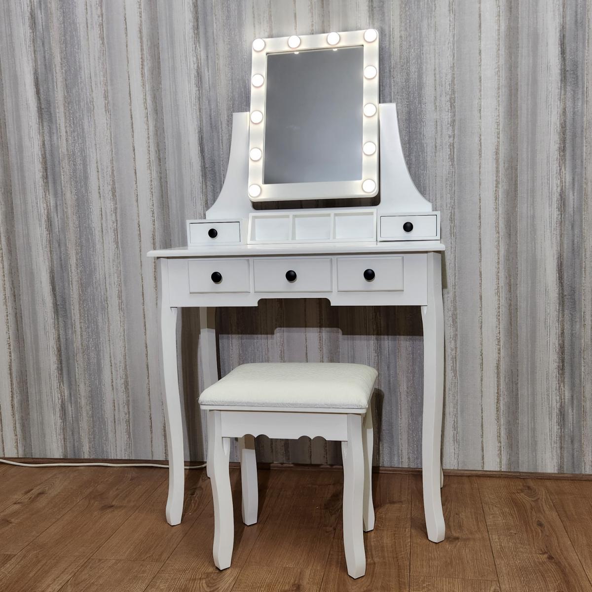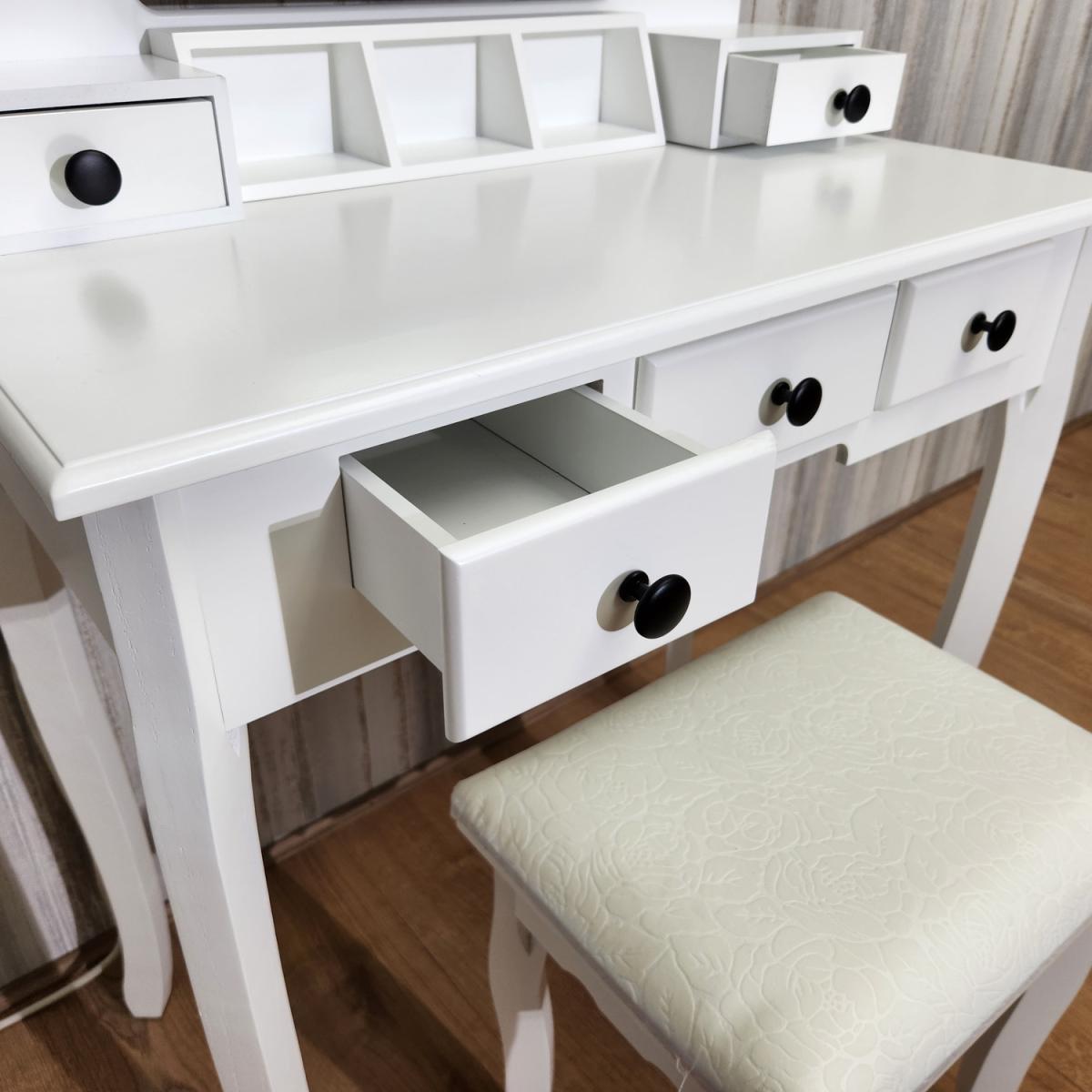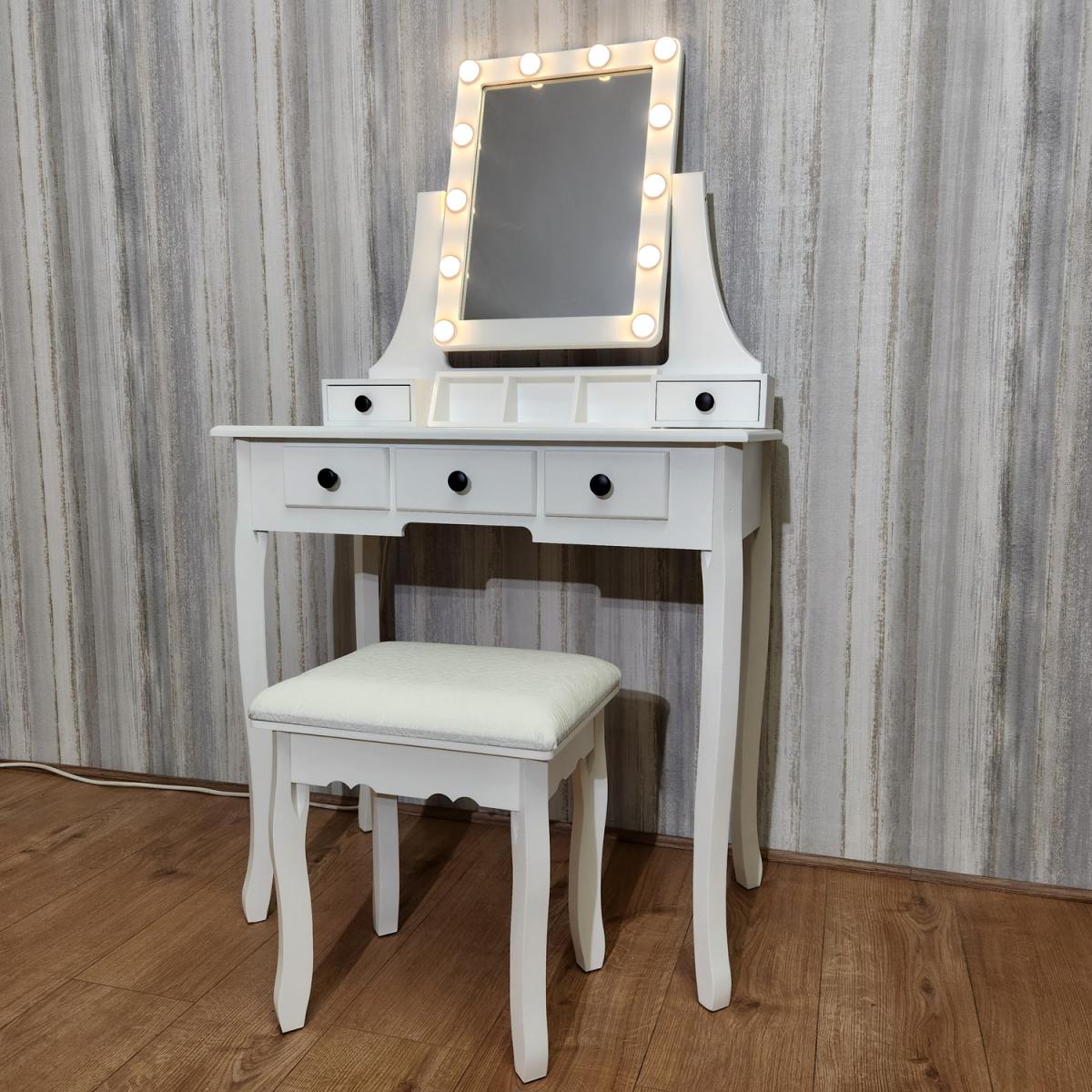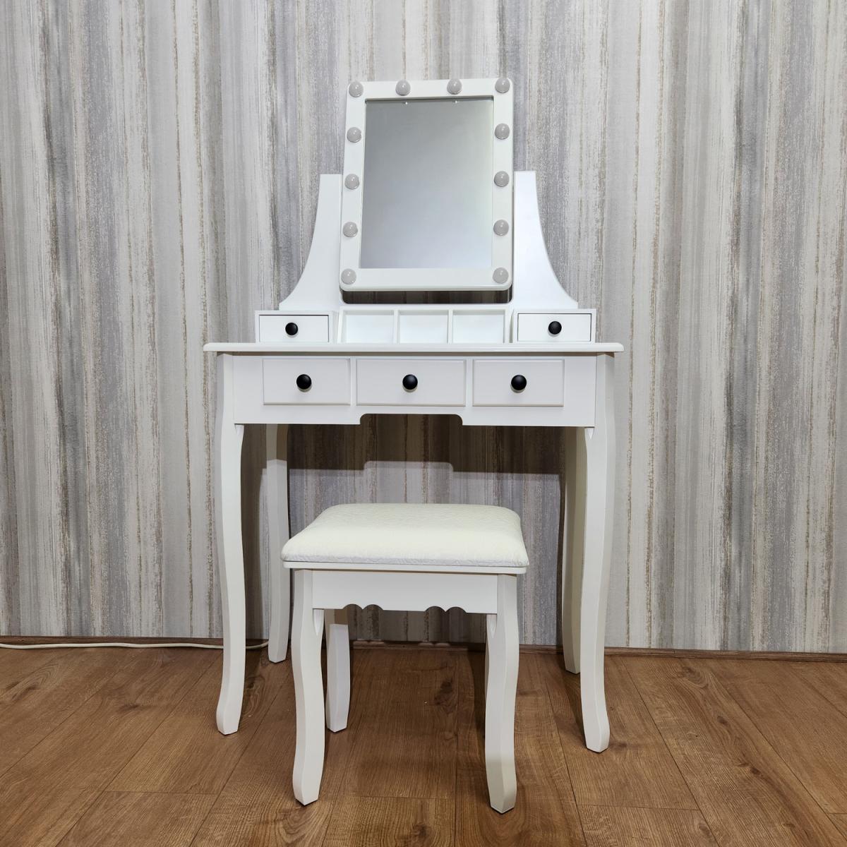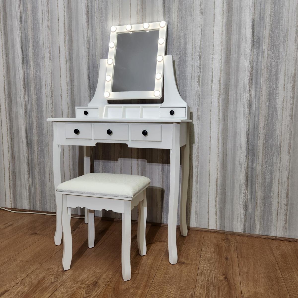 Introducing our exquisite dressing table that emanates timeless elegance with its flawless white finish and impeccable coating. The intricate carved and hollow details bestow a touch of sophistication, transforming it into a captivating decorative centerpiece that perfectly complements any home decor. Preparing your makeup at this vanity is an enchanting experience that will elevate your mood and create a tranquil ambiance. Equipped with adjustable lighting options, this dressing table comes with 12 LED bulbs, offering three distinct modes: cool white, warm white, and warm yellow. Effortlessly customize the brightness to suit various lighting scenarios, enhancing the versatility of the table. The soft and graceful illumination provided by these lights will accentuate your flawless makeup application, boosting your confidence and allure. Designed with both style and functionality in mind, this dressing table features a generously sized 360-degree rotating mirror, allowing for convenient angles and optimal viewing. It boasts five small drawers designed with anti-slip features, providing ample storage space for your essentials. The accompanying printed stool features a comfortable seat cushion made of flame-retardant material. To ensure stability, non slip stickers are thoughtfully included for secure attachment of the table and chair legs. Moreover, when the mirror is detached, the table effortlessly transforms into a versatile surface suitable for a range of uses. Crafted with utmost attention to detail, this dressing table is constructed using premium materials. The body and top plate are made of high quality E1 MDF panels, ensuring durability and safety. Assembly is a breeze, as the main components of the dressing table come pre-assembled. Simply follow the detailed manual and utilize the user-friendly kit provided to attach the table legs, chair legs, mirror, and drawers. Dimensions:Table top dimensions L:75cm, W:40 cm H:73 cm Mirror dimension: 37cm x 50cm. Stool dimensions:L:37x W:30 x H:40 Drawers Dimensions:X2 drawers 15cm x 11cm, X2 Drawers: 14cmx28cm , X1 Drawer: 18cmx28cm Approximate full size: L:75cm , W:40cm, H:137cm