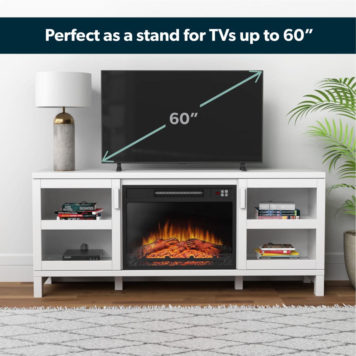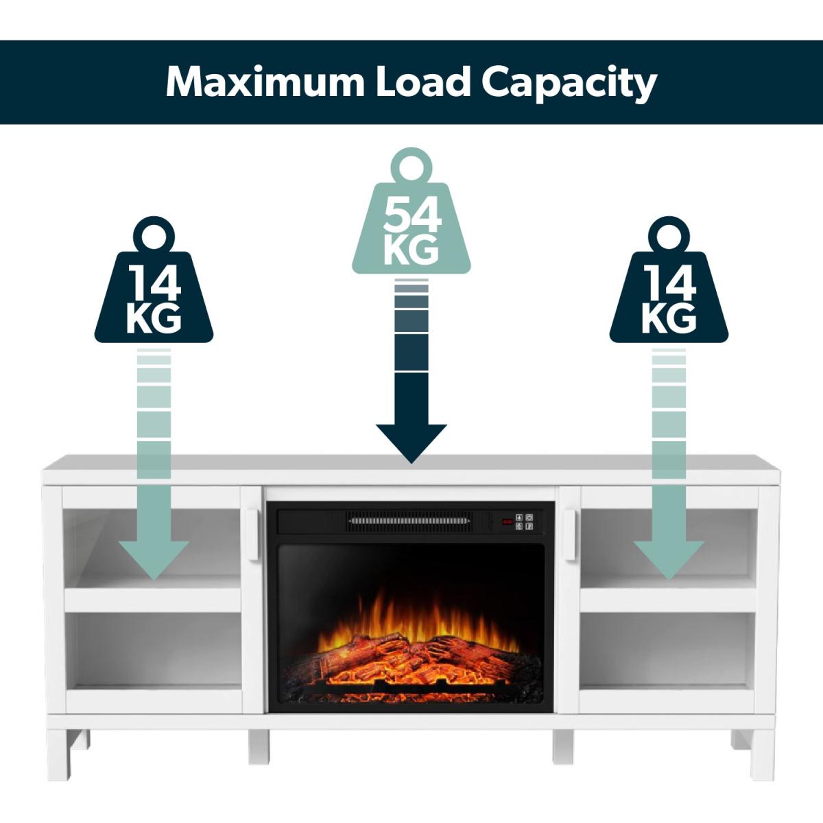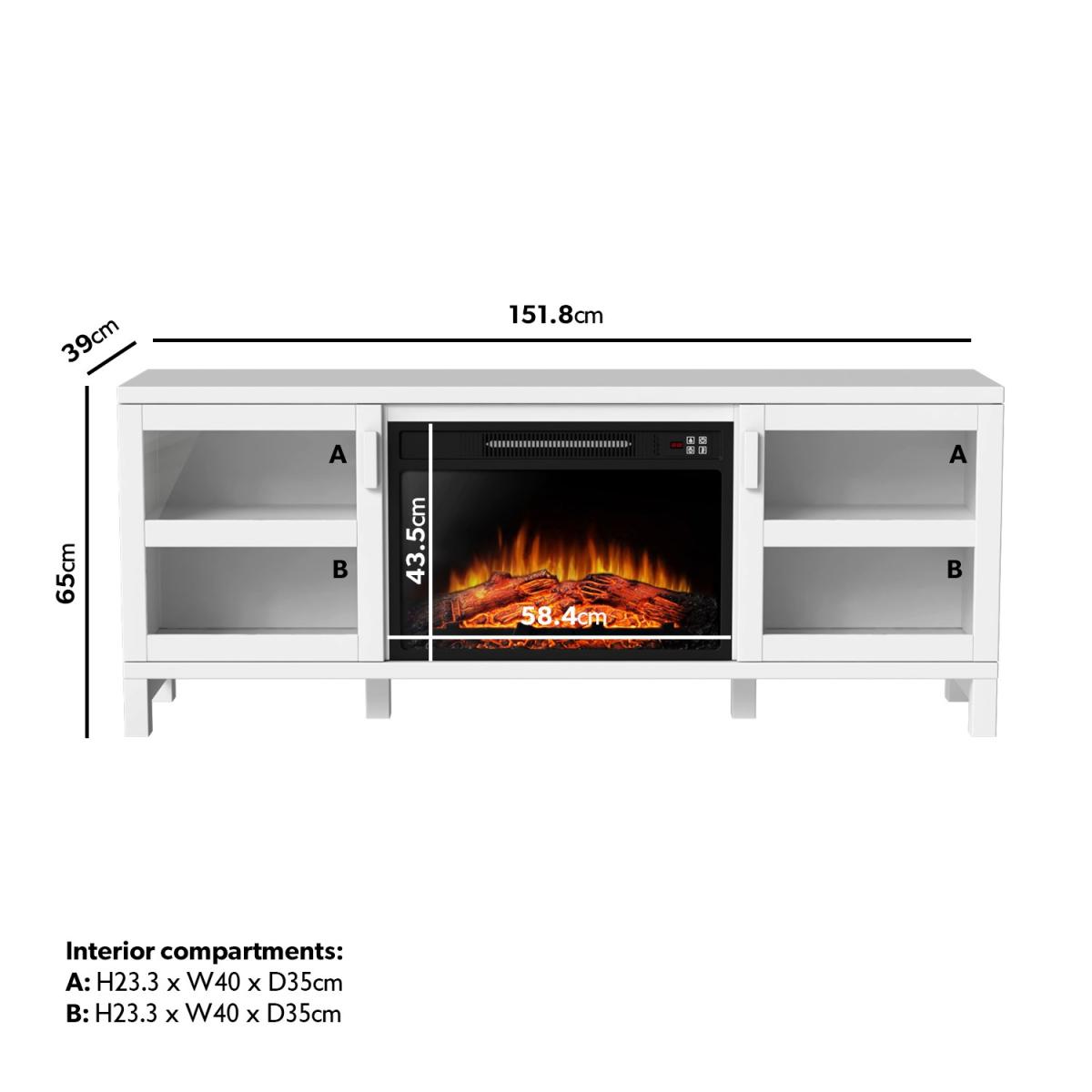 Features we love TV stand built-in fireplace and; storage all in one place. Modern matt white finish will look good in any room. Store your media devices neatly using the cable holes. It comes with a handy remote control for ease of use. Three level LED flame adjustments to choose from All about me. Update your living room with this modern TV stand which includes a built-in fireplace and plenty of storage space. The top surface fits TVs up to 60 there's a cupboard at either side each with a central shelf and closing door and a fireplace which is perfect for when the temperature drops. Alter your settings without even getting up from your sofa with the included remote control. There's a timer too so you can set your fire to turn on just in time for when you get home. Add a warm feel to your space with or without heat thanks to three brightness settings on the fire. Need to know. Dimensions. H65 x W151.8 x D39 cm Top left and right interior compartment. W40 x D35 x H23.3cm Bottom left and right interior compartment. W40 x D 25 x H23.8cm Number of cupboards . 2 Number of shelves. 2 Number of legs. 4 TV size. Up to 60 Colour. White Finish. Painted Material. MDF glass doors and metal Fireplace cable length. 1.6m Flame settings. 3 LED levels Temperature range. 17-27°C Power settings. 1800-2000W Rated voltage. 220V Controls. Hidden switch manual controls and remote control included Assembly required. Yes.