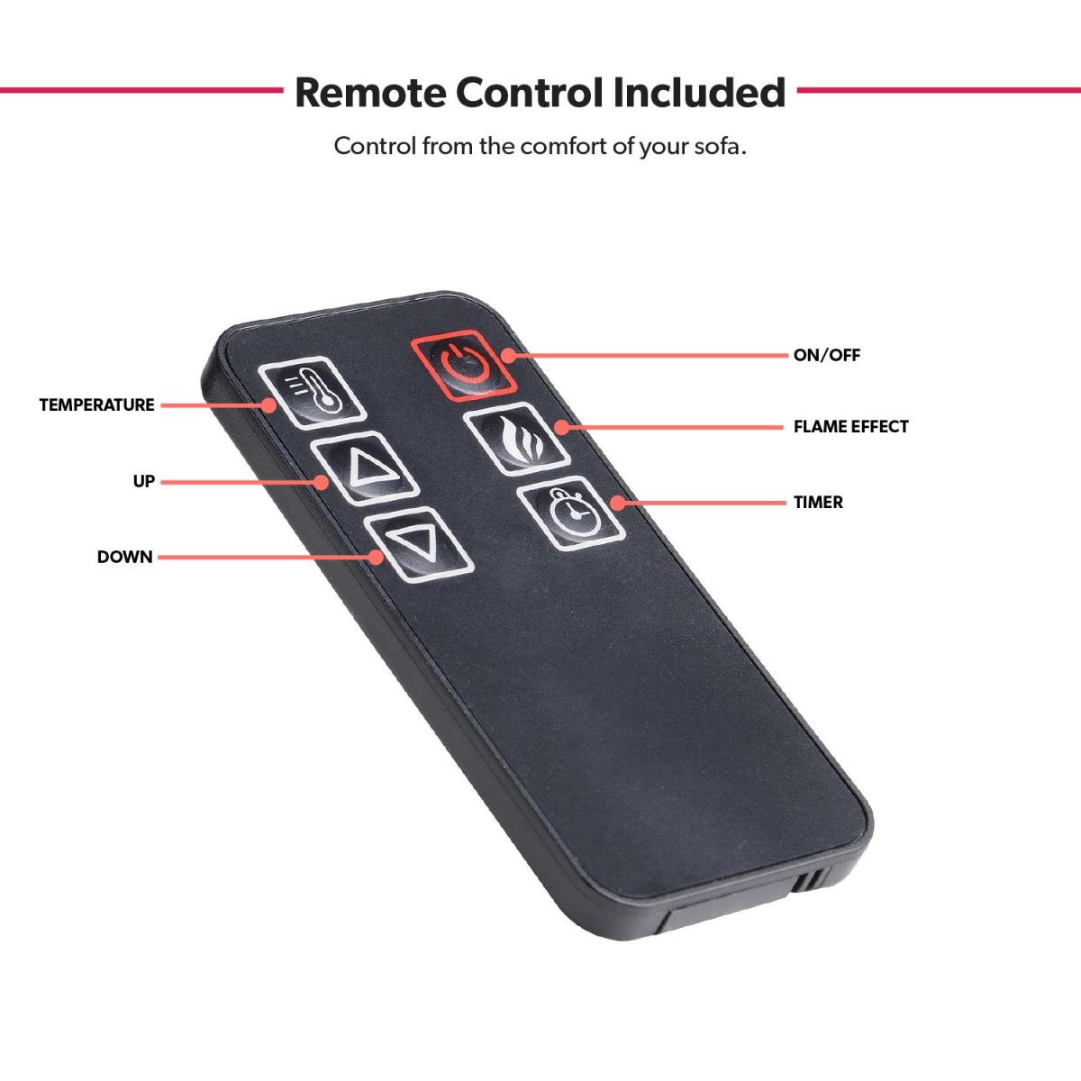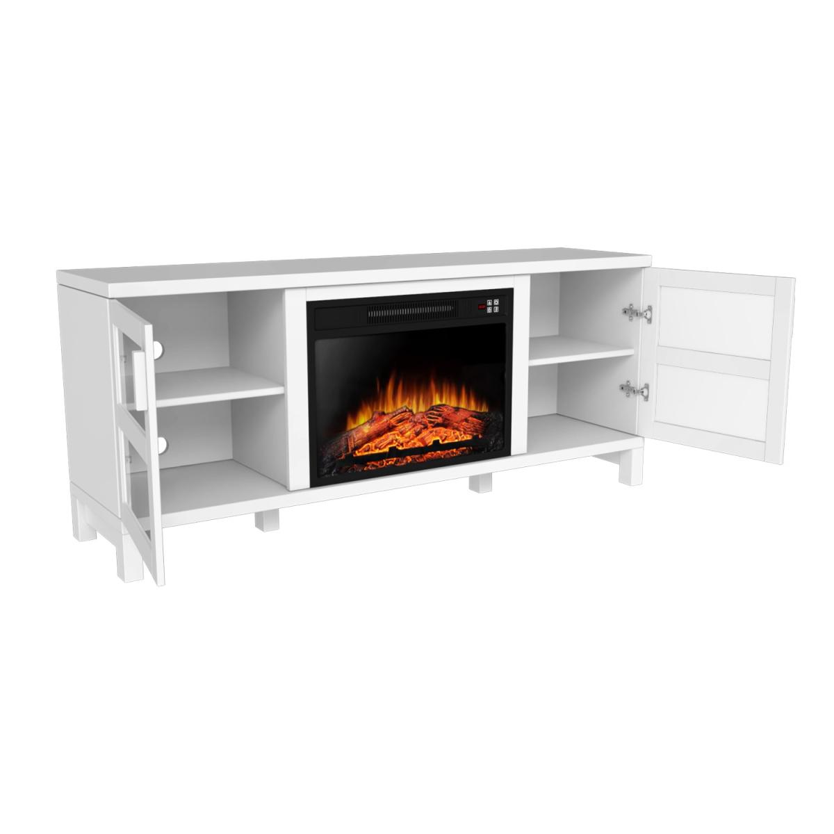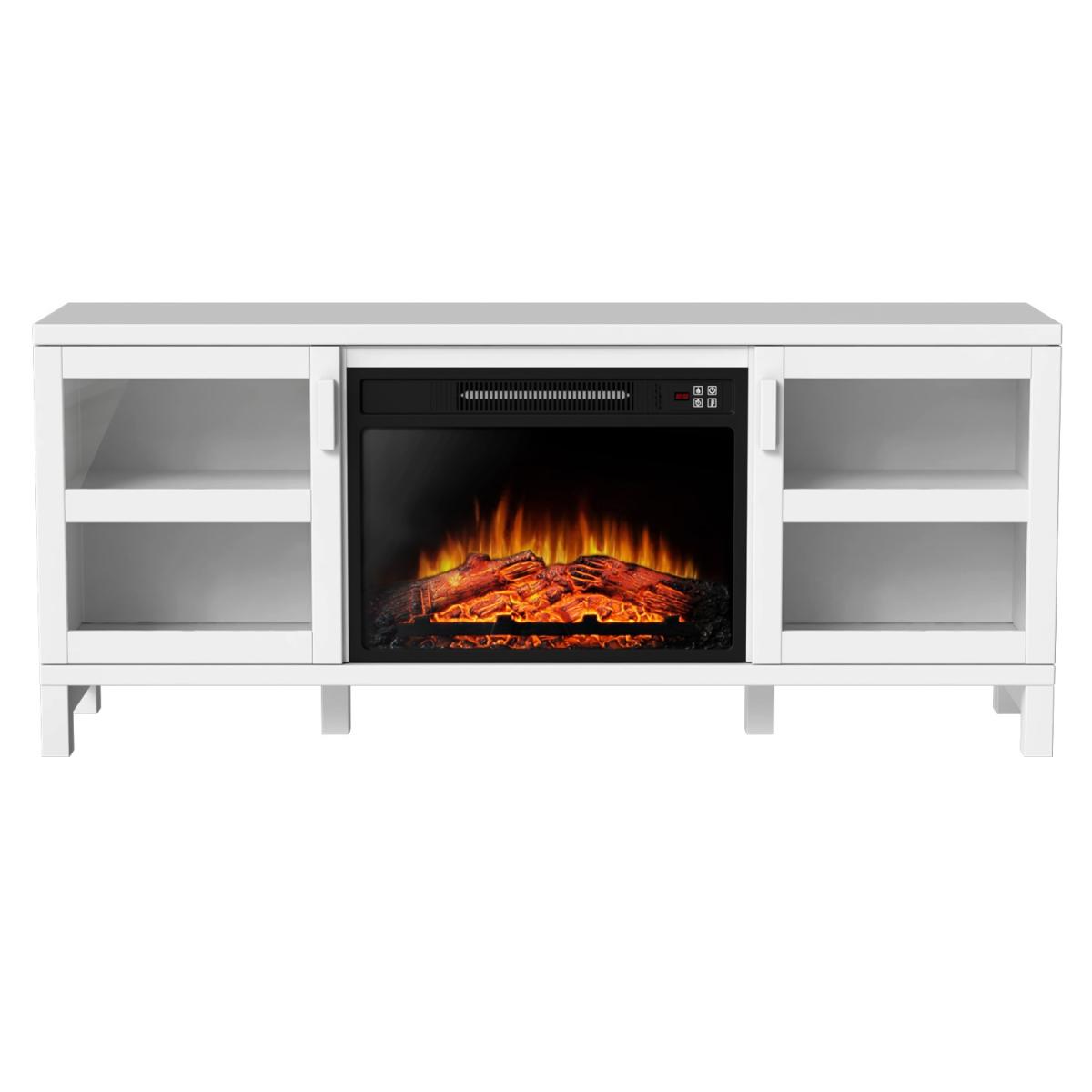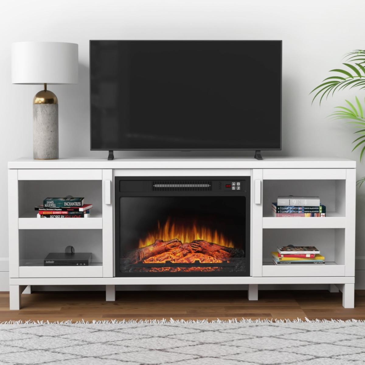 Features we love TV stand built-in fireplace and; storage all in one place. Modern matt white finish will look good in any room. Store your media devices neatly using the cable holes. It comes with a handy remote control for ease of use. Three level LED flame adjustments to choose from All about me. Update your living room with this modern TV stand which includes a built-in fireplace and plenty of storage space. The top surface fits TVs up to 60 there's a cupboard at either side each with a central shelf and closing door and a fireplace which is perfect for when the temperature drops. Alter your settings without even getting up from your sofa with the included remote control. There's a timer too so you can set your fire to turn on just in time for when you get home. Add a warm feel to your space with or without heat thanks to three brightness settings on the fire. Need to know. Dimensions. H65 x W151.8 x D39 cm Top left and right interior compartment. W40 x D35 x H23.3cm Bottom left and right interior compartment. W40 x D 25 x H23.8cm Number of cupboards . 2 Number of shelves. 2 Number of legs. 4 TV size. Up to 60 Colour. White Finish. Painted Material. MDF glass doors and metal Fireplace cable length. 1.6m Flame settings. 3 LED levels Temperature range. 17-27°C Power settings. 1800-2000W Rated voltage. 220V Controls. Hidden switch manual controls and remote control included Assembly required. Yes.