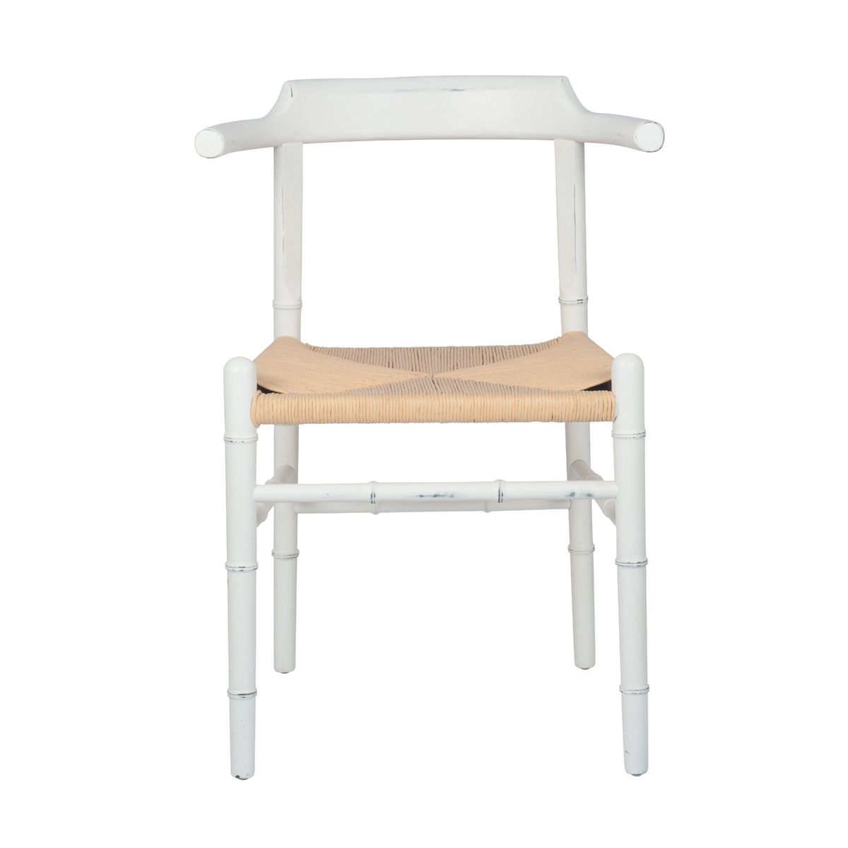 A retro take on a classic chair, crafted from elm wood with a chic white finish and a natural woven seat. Featuring a sweeping back and carved, bamboo-shaped legs for a kitsch twist.