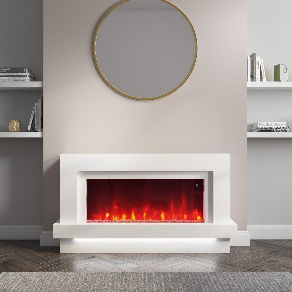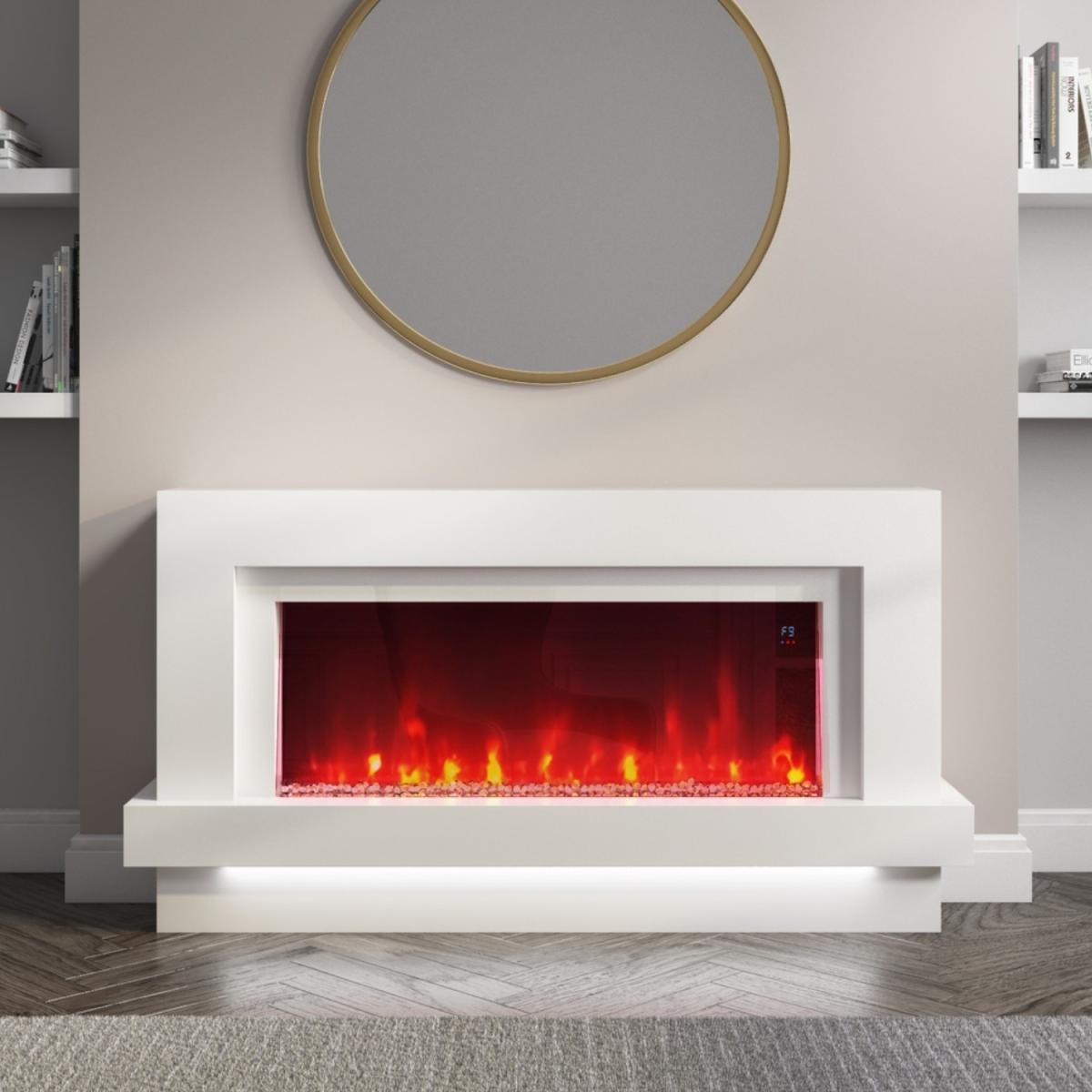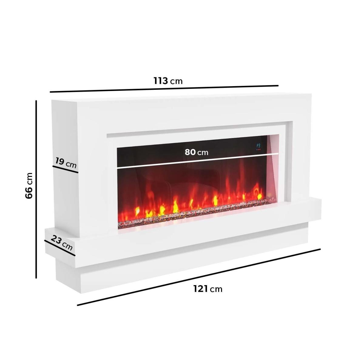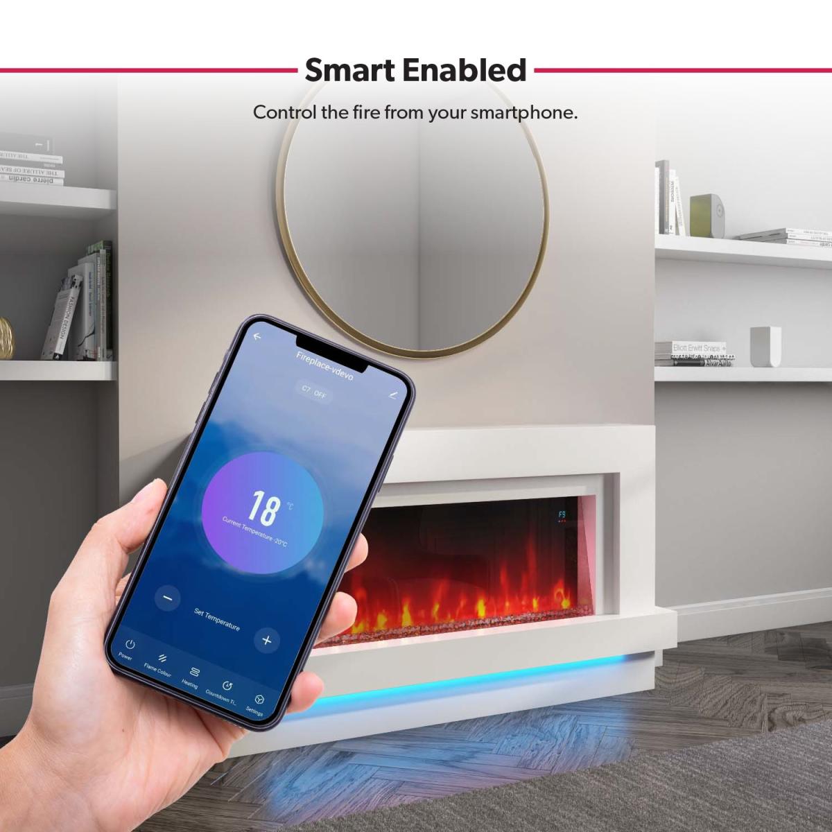 Features we love Freestanding fireplace suite in a sleek white finish. Various LED colour lighting effects and; flame adjustments. Decorative pebbles and; crystals sit behind a glass front Control from your smartphone by Wi-Fi or remote control Alexa and Google Home enabled powered by the Tuya App All about me. Create the perfect centrepiece with this elegantly designed freestanding fireplace. It features seven flame colour effects with five flame adjustments eight stunning colour changing effects under the lower mantle plus heat settings and a timer. You can use the remote control included to make changes without getting up from your sofa Use the remote control to make adjustments from the comfort of your sofa or use the integrated switch manual control. Why not use the innovative technology it has to offer and connect to your smartphone or even Alexa or Google? It comes already assembled too so you can plug it in right away and it’s ready to use. The TUYA Wi-Fi App. To control the fire using your phone you will need a stable wifi connection. To enabled this feature you need to download the Tuya app; this controls the Wi-Fi and smart element. It can be download via the Apple App Store or Google Play Store. You can even control via your voice-controlled smart speaker (e.g. Alexa Google) to turn it on and off ensuring that this is enabled first. Please note the fire is not voice activated unless connected to a smart speaker. Downlight Controls. Use the remote control to control the downlights. Simply hold down the timer button for three seconds and then use the arrow keys to scroll through the colours. Need to know. Overall dimensions. H66 x W121 x D23 cm Weight. 28kg Style. Freestanding Finish. White Material. MDF metal glass and electric components Heat levels. 2 (1kW and; 2k. W) Temperature range. 2 heat settings which range from 16⁰C-30⁰C Rated voltage. 220-240V LED flame settings. 7 colours Flame adjustments. 5 LED shelf light settings. 8 colours Assembly required. No (just fix to the wall and plug in)Child safety lock function for your peace of mind Open window detection function a great energy saver..