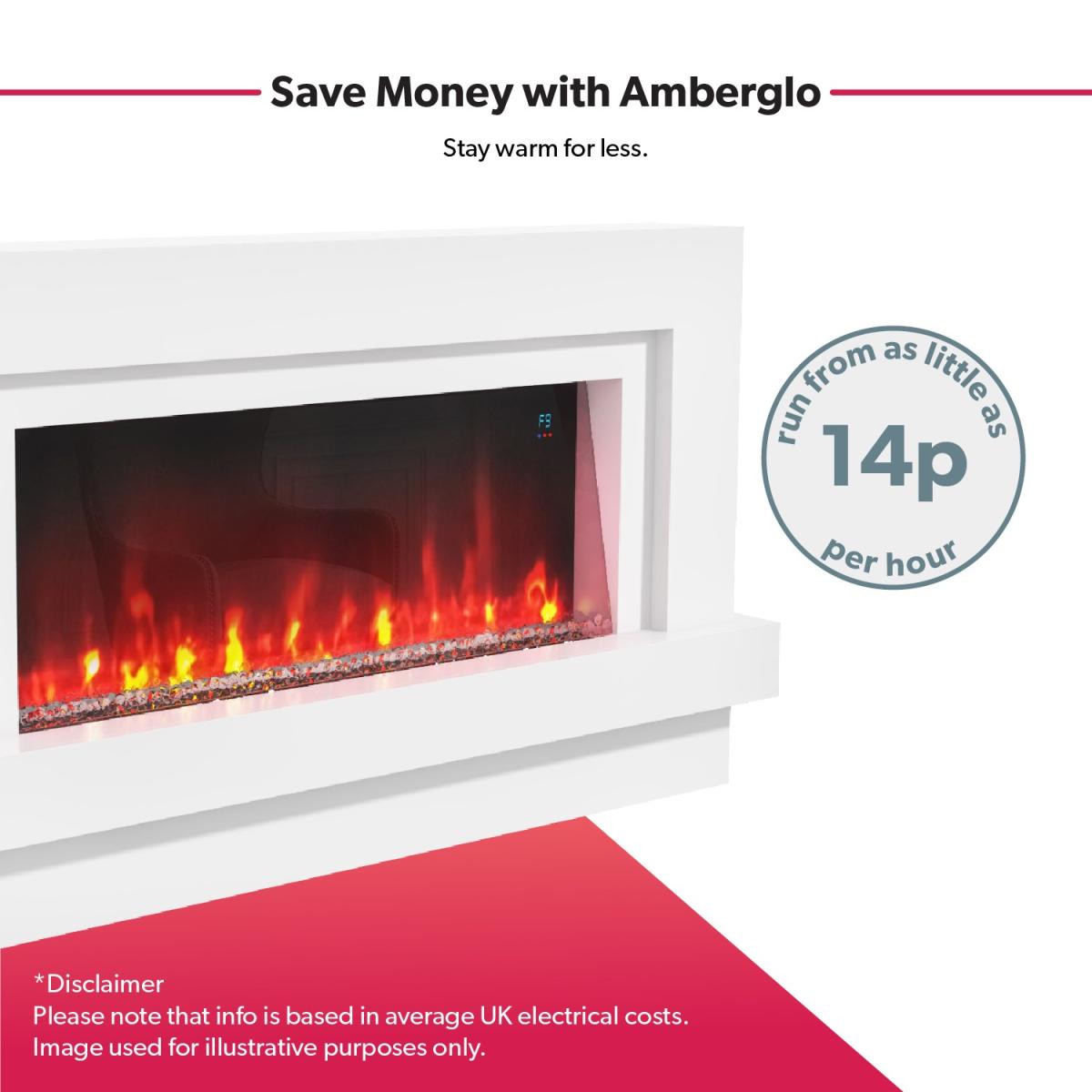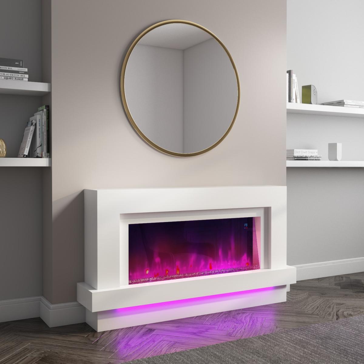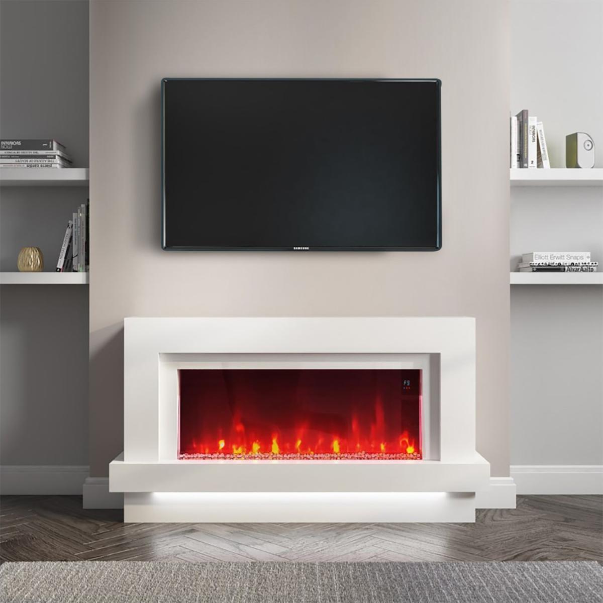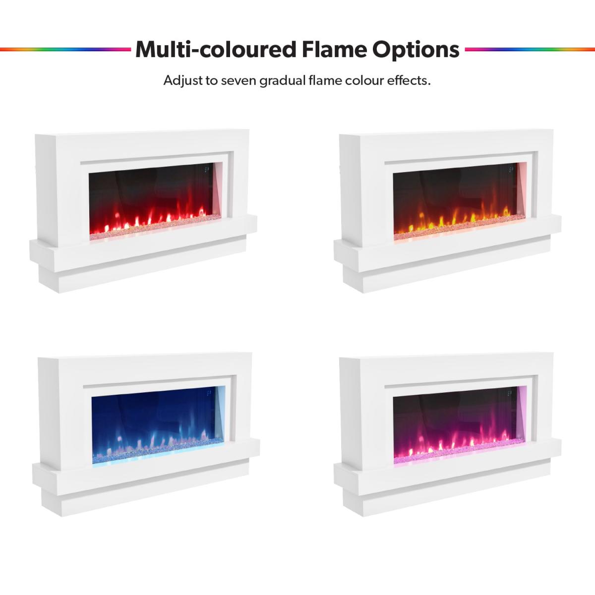 Features we love Freestanding fireplace suite in a sleek white finish. Various LED colour lighting effects and; flame adjustments. Decorative pebbles and; crystals sit behind a glass front Control from your smartphone by Wi-Fi or remote control Alexa and Google Home enabled powered by the Tuya App All about me. Create the perfect centrepiece with this elegantly designed freestanding fireplace. It features seven flame colour effects with five flame adjustments eight stunning colour changing effects under the lower mantle plus heat settings and a timer. You can use the remote control included to make changes without getting up from your sofa Use the remote control to make adjustments from the comfort of your sofa or use the integrated switch manual control. Why not use the innovative technology it has to offer and connect to your smartphone or even Alexa or Google? It comes already assembled too so you can plug it in right away and it’s ready to use. The TUYA Wi-Fi App. To control the fire using your phone you will need a stable wifi connection. To enabled this feature you need to download the Tuya app; this controls the Wi-Fi and smart element. It can be download via the Apple App Store or Google Play Store. You can even control via your voice-controlled smart speaker (e.g. Alexa Google) to turn it on and off ensuring that this is enabled first. Please note the fire is not voice activated unless connected to a smart speaker. Downlight Controls. Use the remote control to control the downlights. Simply hold down the timer button for three seconds and then use the arrow keys to scroll through the colours. Need to know. Overall dimensions. H66 x W121 x D23 cm Weight. 28kg Style. Freestanding Finish. White Material. MDF metal glass and electric components Heat levels. 2 (1kW and; 2k. W) Temperature range. 2 heat settings which range from 16⁰C-30⁰C Rated voltage. 220-240V LED flame settings. 7 colours Flame adjustments. 5 LED shelf light settings. 8 colours Assembly required. No (just fix to the wall and plug in)Child safety lock function for your peace of mind Open window detection function a great energy saver..