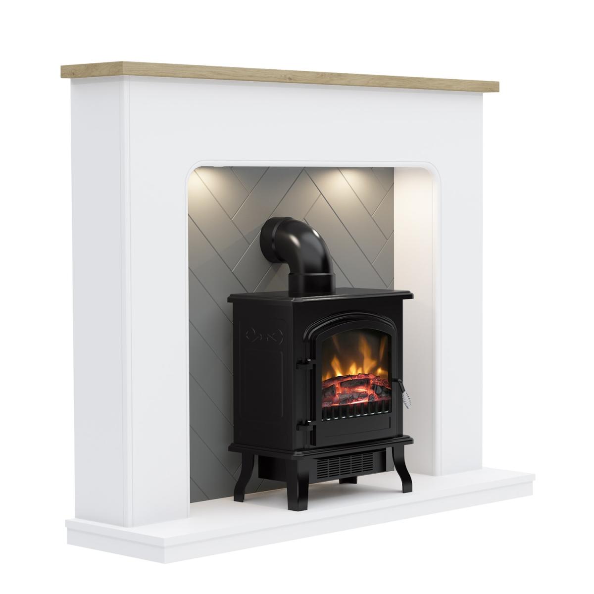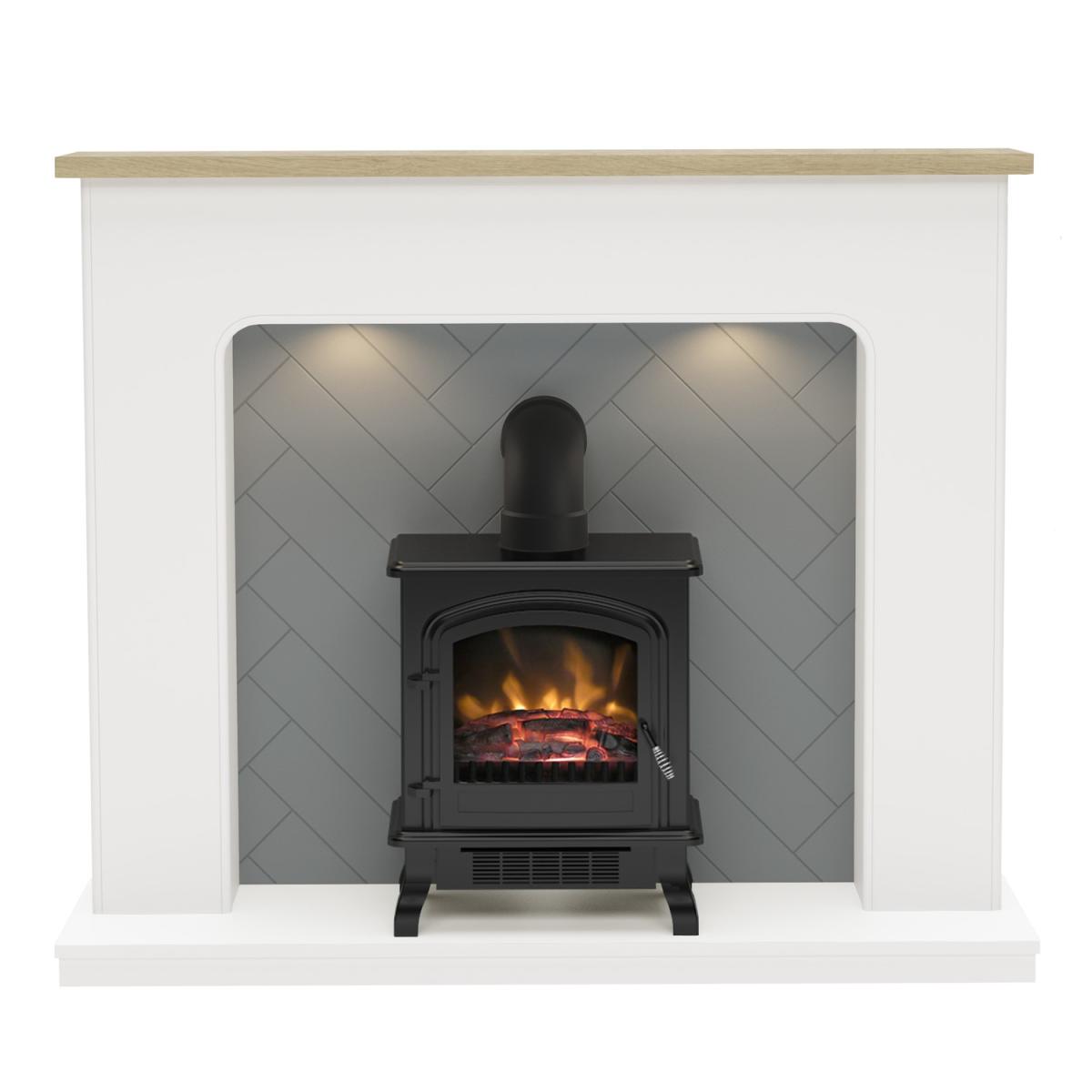 White Freestanding Log Effect Electric Fireplace Suite With Grey Herringbone - Be Modern Sennen