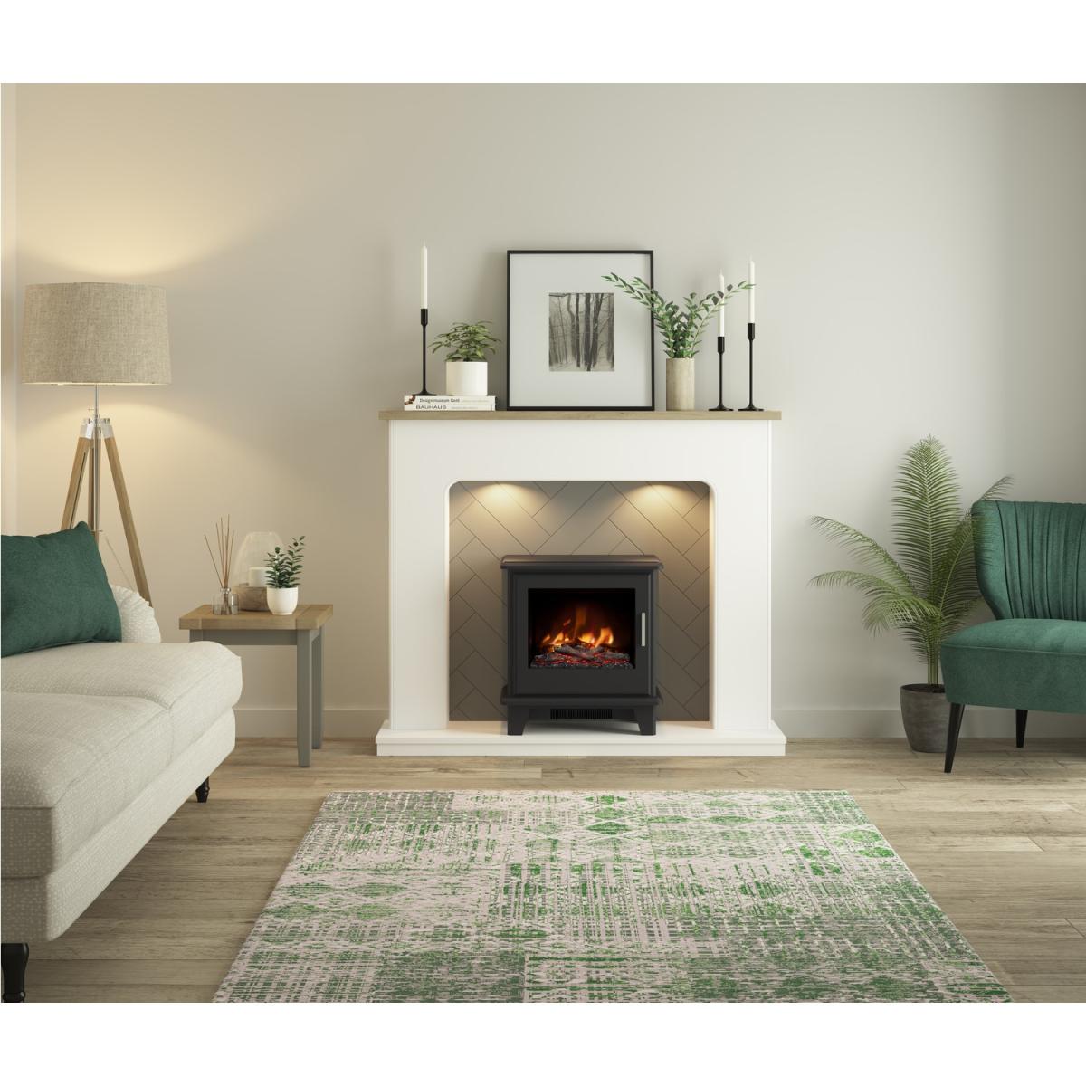 The Be Modern Sennen is a versatile fireplace suite that works particularly well in contemporary and Scandinavian-inspired interiors due to its clean lines, neutral white finish, and subtle grey herringbone accents. I love how it balances practicality with style, making it a focal point without overwhelming the room. It’s ideal for adding warmth and atmosphere to living spaces with minimalist or modern decor, especially when paired with neutral or muted tones. To style it effectively, consider keeping surrounding furniture light and uncluttered, and introduce texture with soft furnishings or plants to complement the grey herringbone detail. The simplicity of this piece means it can seamlessly adapt to various interior styles, whether you're aiming for cosy elegance or understated modernity.