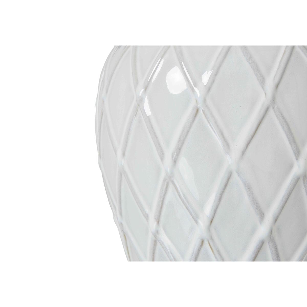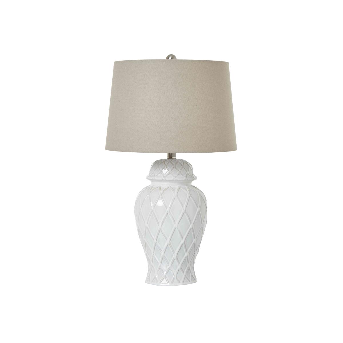 The Ginger Jar table lamp will elevate any style of interior – from modern minimalist to more traditional spaces. It's the perfect touch of understated luxury. Why you'll love it An equally elegant and eye-catching design. Clean, classic silhouette. Its diamond-pattern base adds gorgeous texture. Comes with a crisp linen shade. Versatile styling potential. What you need to know Ceramic base. Lamp shade included. Requires 1 x E27 max. 40W bulb, not included. To clean, simply dust with a dry cloth. Dimensions Height: 64 cm (26 in). Width: 38 cm (15 in). Depth: 38 cm (15 in).