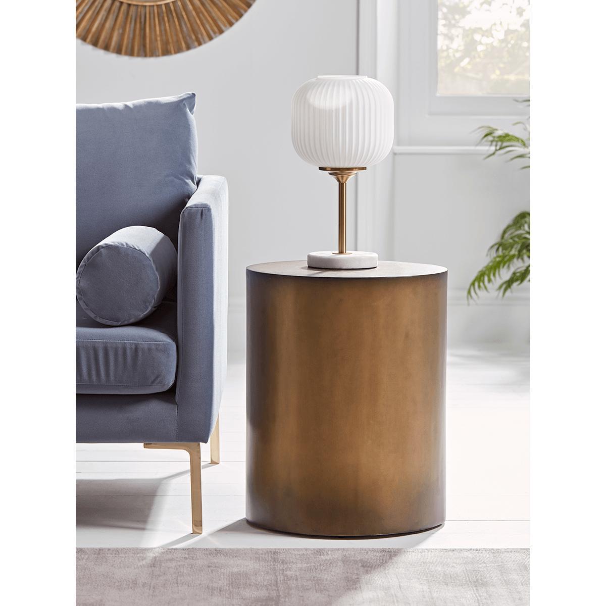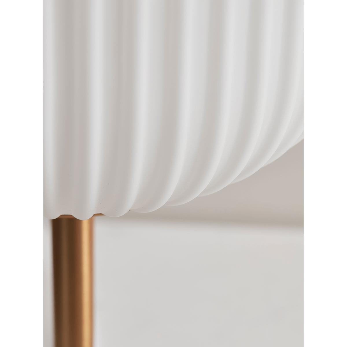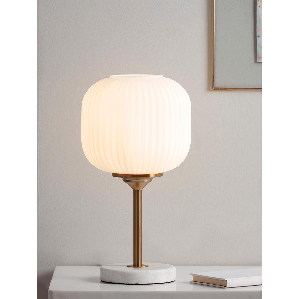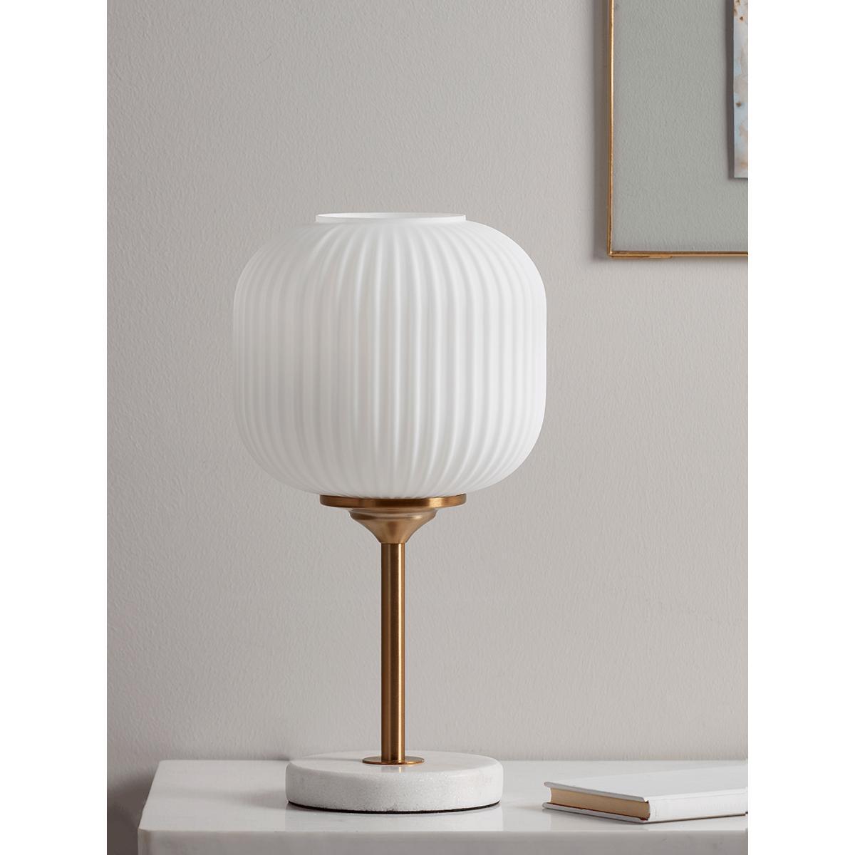 With a fluted milk white shade and slender brass stand and marble base, our lamp has all the design nostalgia of the glamorous deco era. Place on any surface in the home to deliver statement style; whether to soften an ultra modern space or to add atmosphere by layering the decorative element with added luxe.