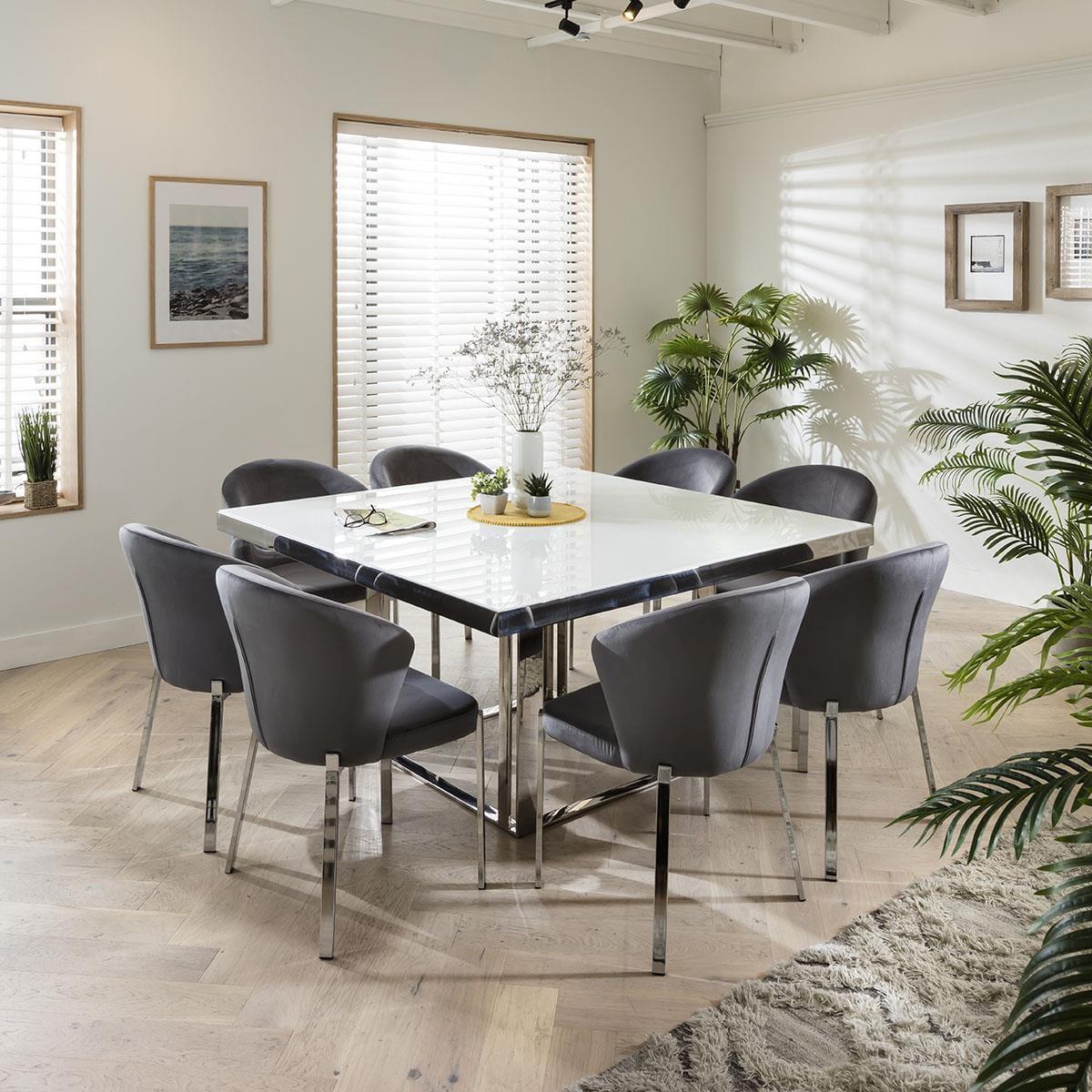 The Sophie white square dining table has a large 150cm tabletop allowing plenty of room for dining with guests and is easy to maintain with an easy wipe surface thanks to the super white tempered glass top. The slick stainless steel support means that as well as looking the part this table is also extremely sturdy. A lustrous band of shiny stainless steel adds a unique finishing touch to the table design. Revitalise your dining room decor with the JLA Luxury Grey Velvet Upholstered Dining Chairs. Graceful, minimalist lines draw inspiration from the signature silhouettes of mid-century dining chairs that blend seamlessly with the luxe comfort of the JLA Collection's soft and stain-resistant performance velvet upholstery. Cleverly proportioned, its curved back is designed to cocoon around you. W150cm D150cm H76cm Features modern velvet dining chairs Set includes Sophie dining table and 8 JLA chairs