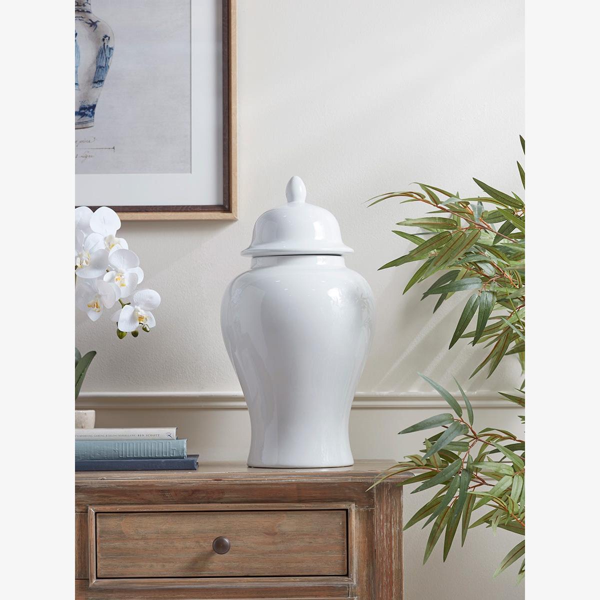 I love this white glaze ginger jar for its versatility and timeless elegance. It works beautifully in both traditional and contemporary interiors, adding a touch of refined charm without overpowering a space. Styling it on a mantelpiece, sideboard, or even as a standalone piece on a bedside table provides an understated focal point. For added visual interest, try pairing it with natural elements like greenery or florals for contrast, or placing it among other glazed ceramics for a curated, gallery-style display. Its classic shape and neutral tone make it a practical choice that can easily adapt to various colour schemes and decorating styles.