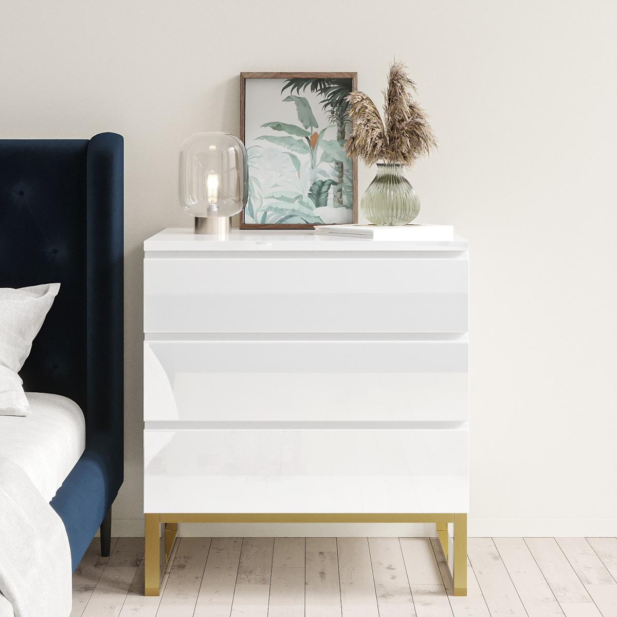 High-gloss chest of drawers finished with gold legs 3 drawers provide ample storage for any folded items Modern integrated handles add to the seamless design Sleek and linear design will look great in any bedroom Solid construction made with high-quality materials Easy to assemble Need to know Number of drawers: 3 Weight: 36kg Colour: White and gold Cabinet finish: Lacquered Leg finish: Gold plated metal Material: MDF and metal Assembly required: Yes