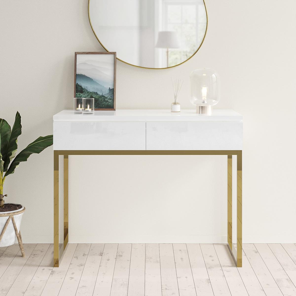 White dressing table finished in a high-gloss lacquer 2 drawers are the perfect size for storing makeup Gold legs and integrated handles add a modern feel Sleek and linear design will look great in any bedroom Solid construction made with high-quality materials Easy to assemble Need to know Number of drawers: 2 Weight: 23.5kg Colour: White and gold Cabinet finish: Lacquered Leg finish: Gold plated metal Material: MDF and metal Assembly required: Yes