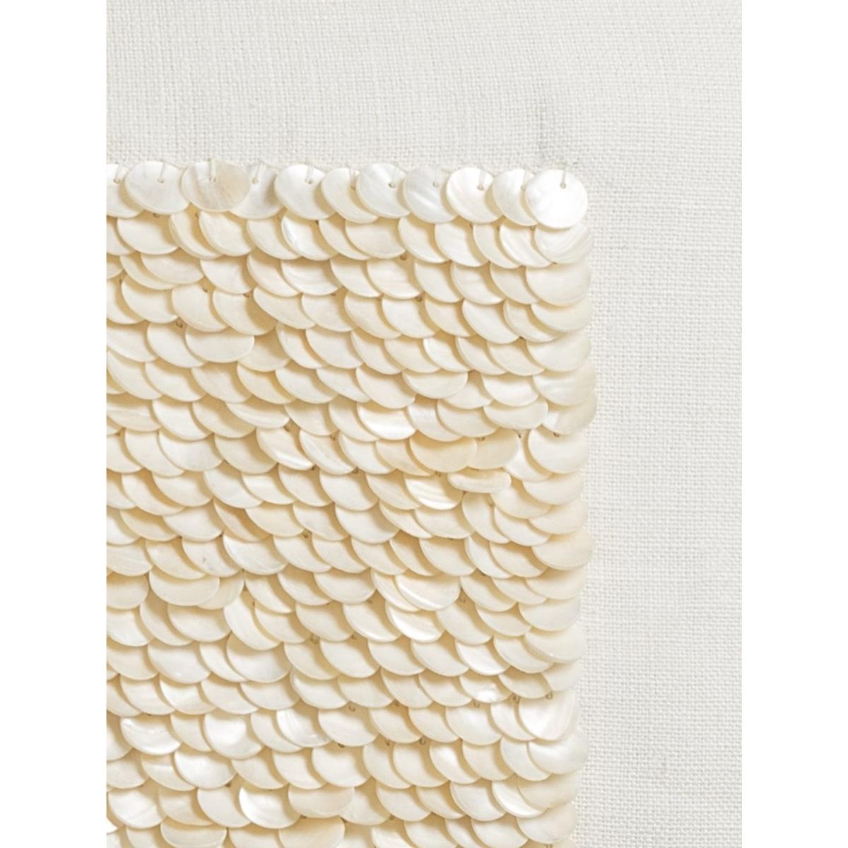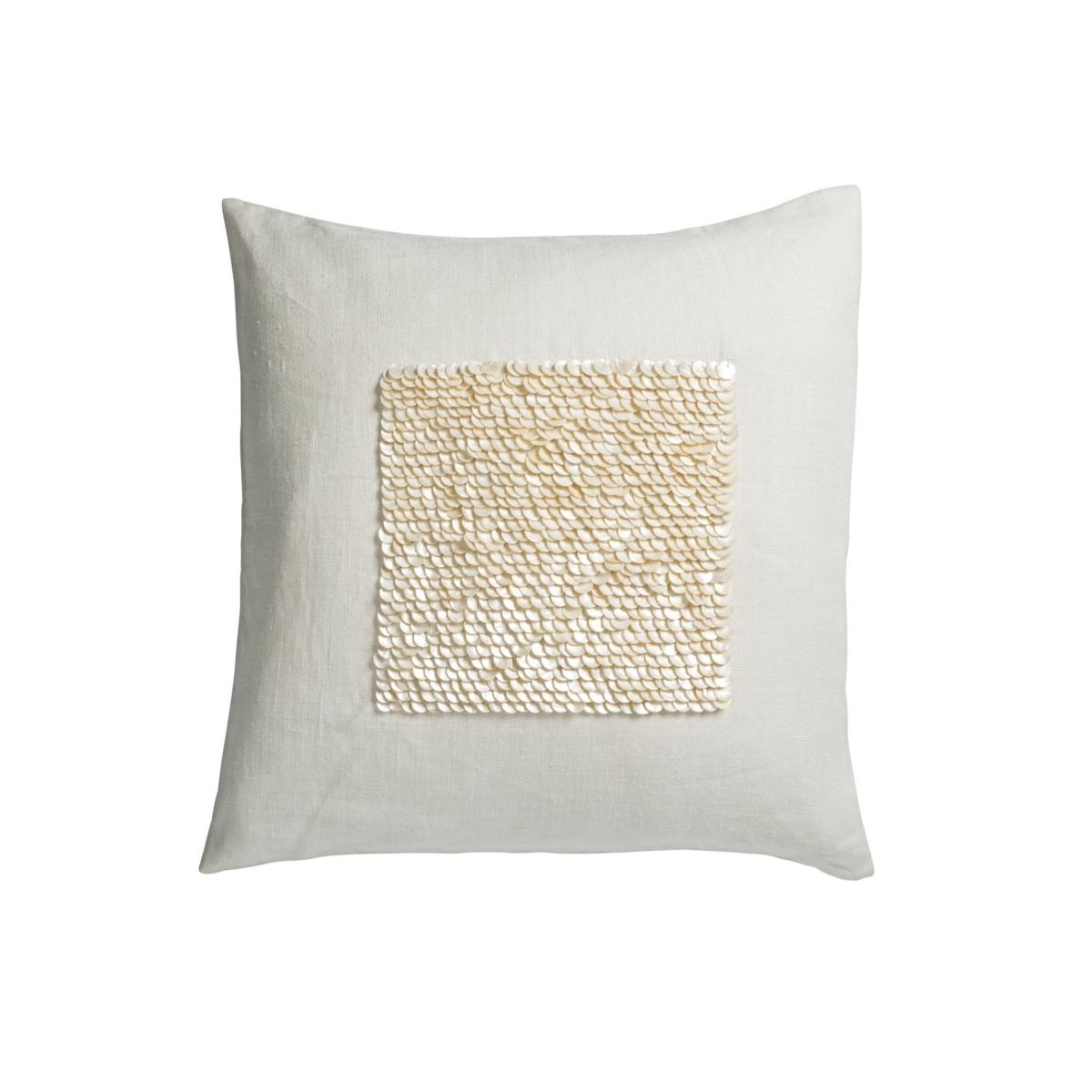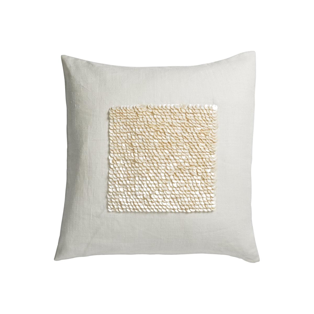This delicately embellished cushion is crafted from white linen, a fabric with natural slubs (or raised threads) that give it an organic feel. The central panel is hand-embroidered in India with hundreds of mother-of-pearl discs, which catch the light from every angle. This cushion makes an ideal partner for more complex geometric patterns, or pick up on its textural appeal by combining with knits and woven finishes. This cushion is embroidered on the front only with a plain back, so it sits better on furniture. Size: 40x40cm Colour: Cream Material: Linen & Mother of Pearl Your shipping cost and any customs or duties charges will be added to your order at checkout. Please add your items to the basket and complete your delivery information for details of your shipping charges.