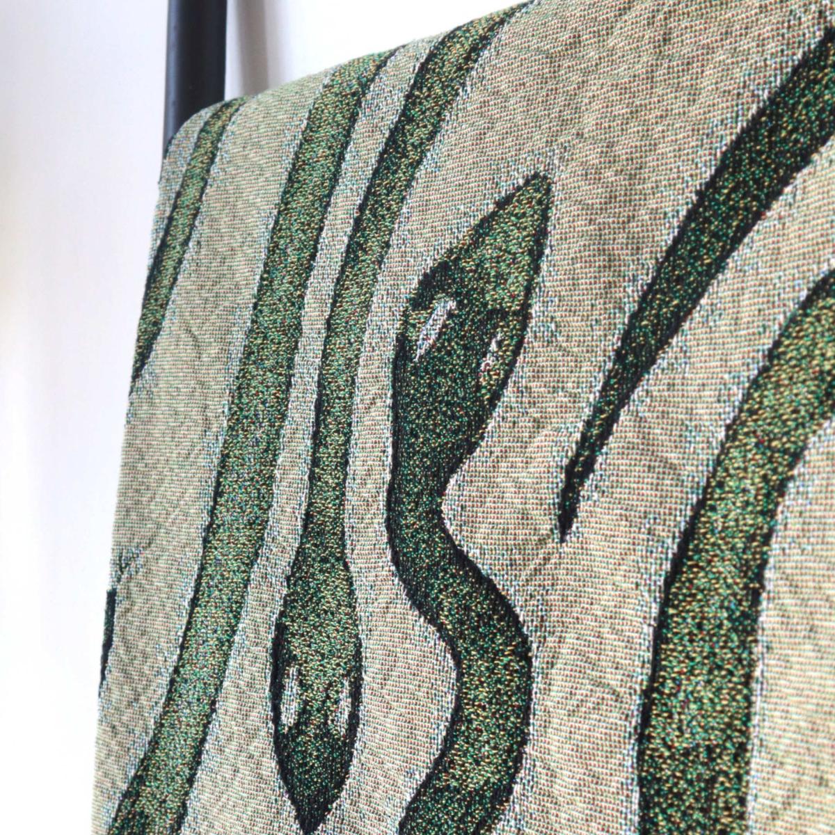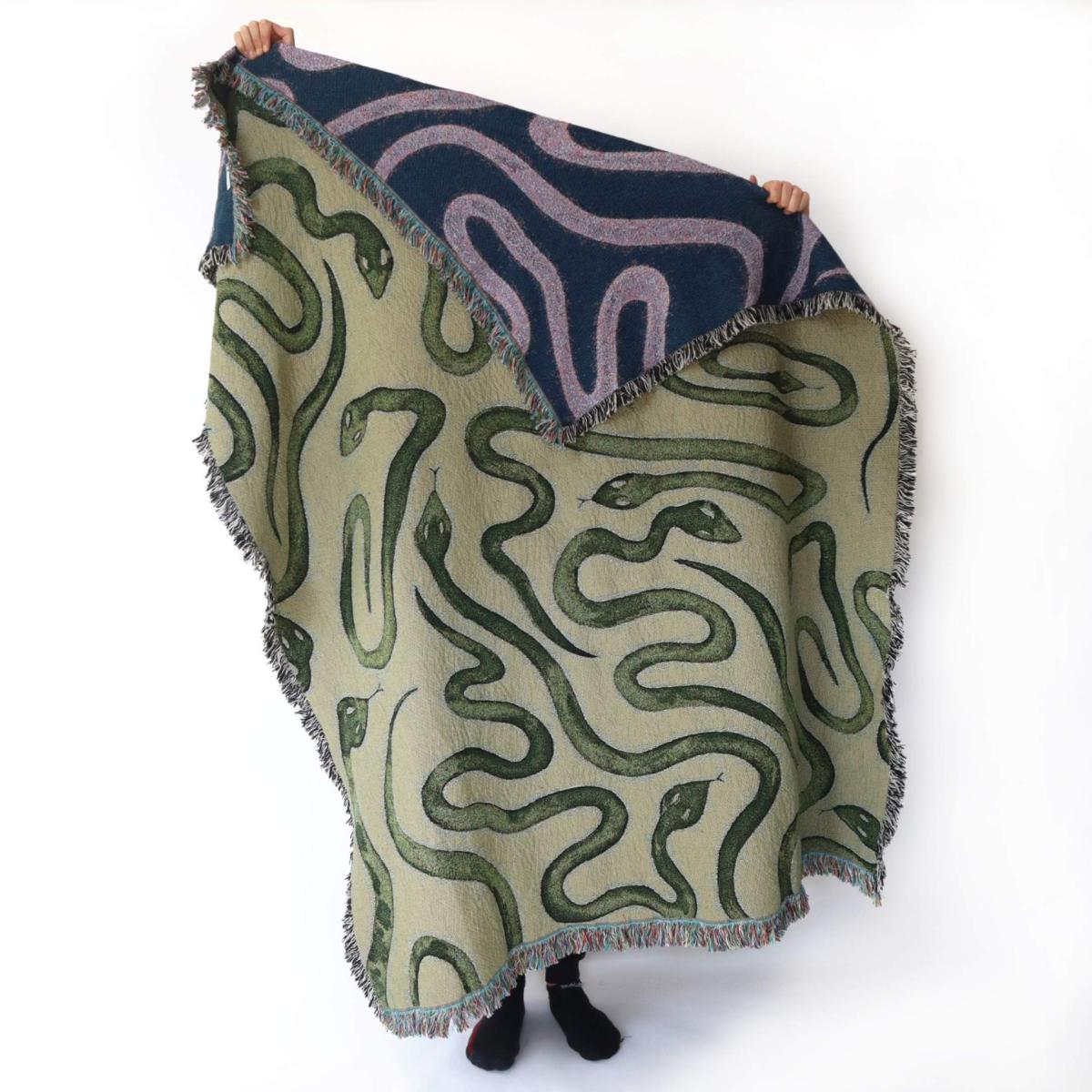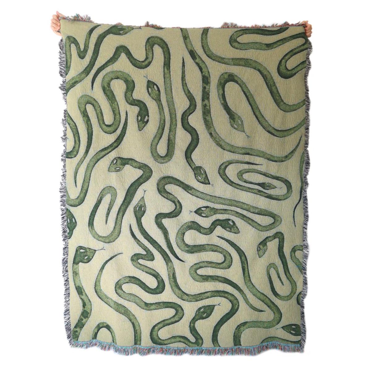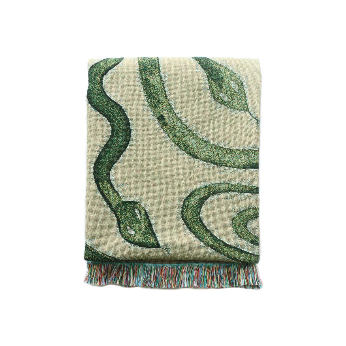 A bold and striking recycled cotton woven throw featuring a unique green snake pattern. Perfect for your sofa or bedding or even hang on your wall as a large tapestry art.