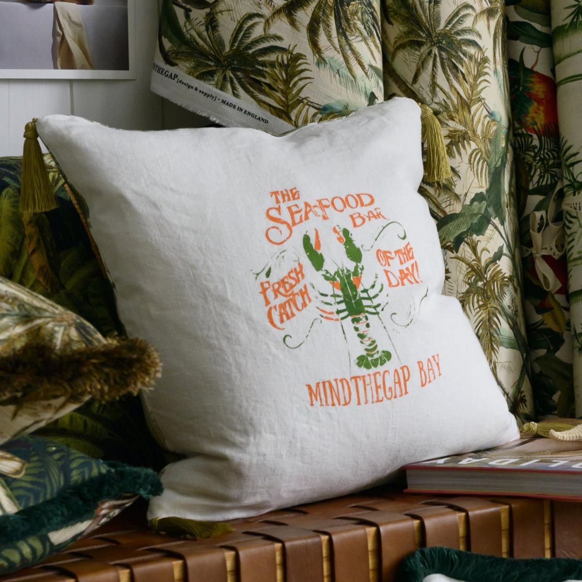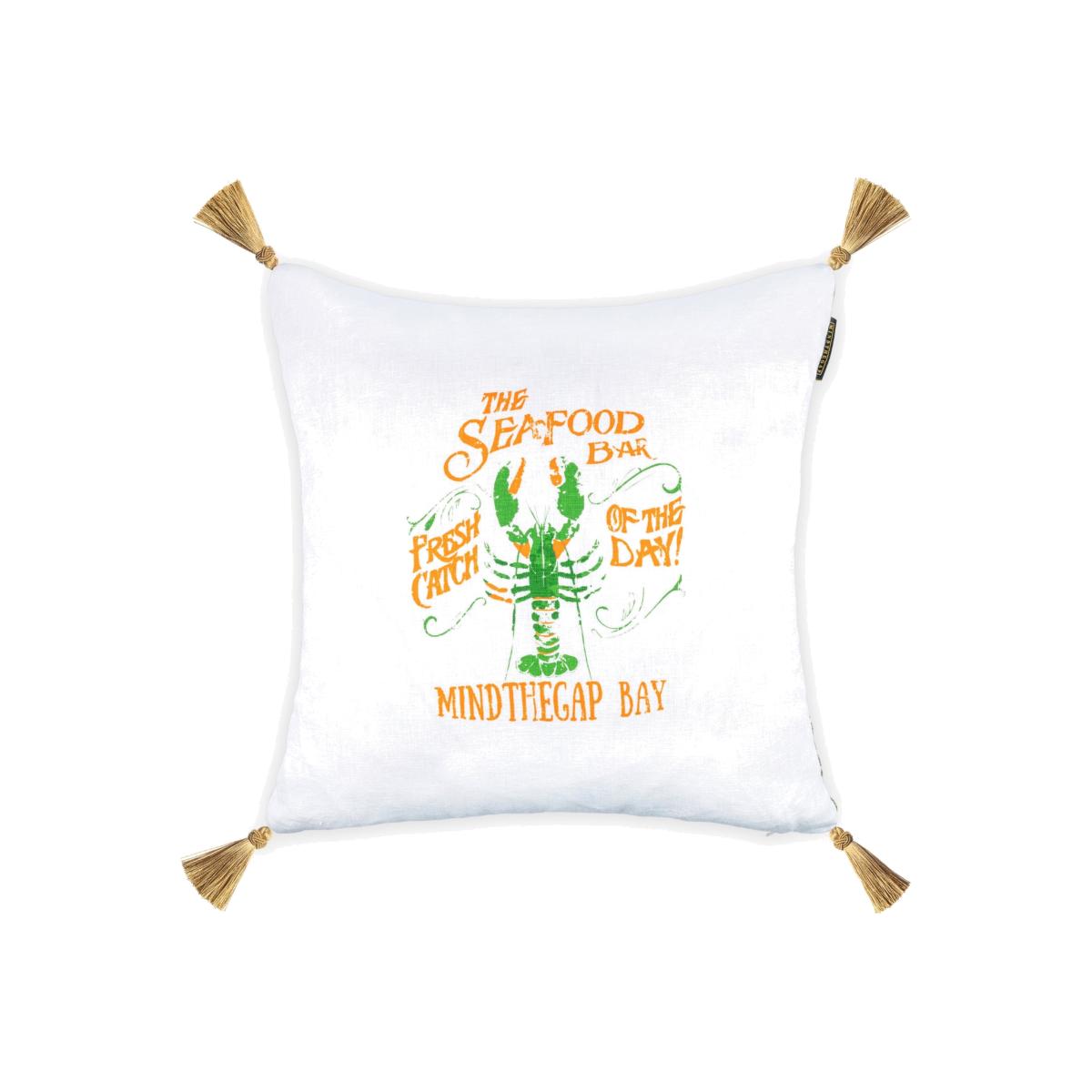 Inspired by the lifestyle of the Caribbean seaside, The Seafood Bar cushions shows a large vintage seafood bar sign screen printed on the front side and Madagascar linen fabric on the back side. The cushion is finished with golden tassels and comes with 100% duck feathers filling.