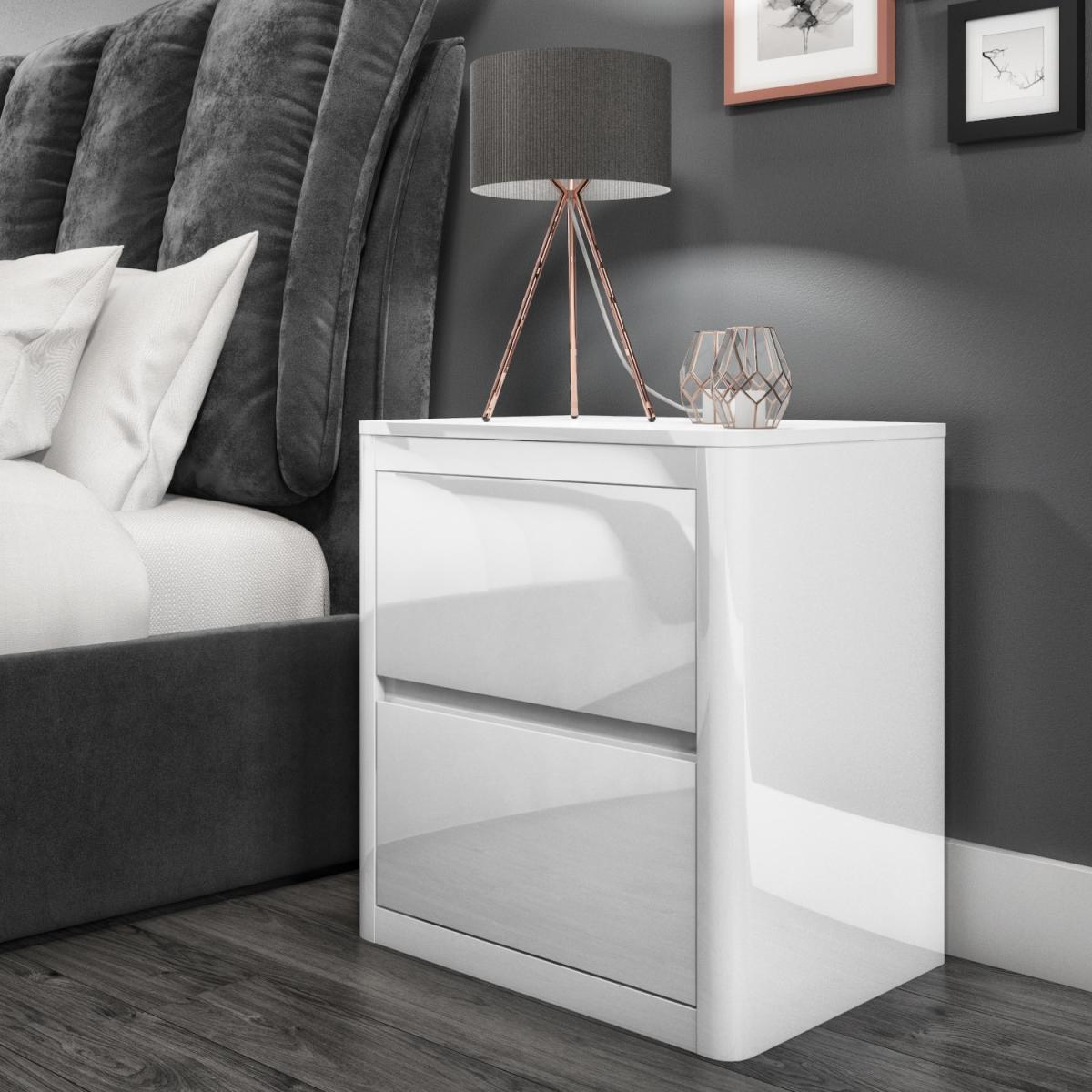 White High Gloss Bedside Table with 2 Drawers and Curved Edges - Lexi