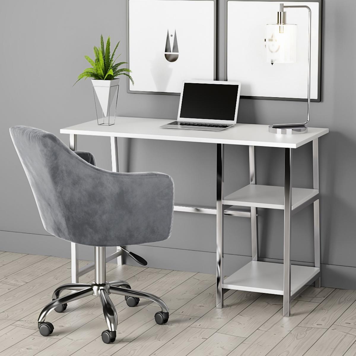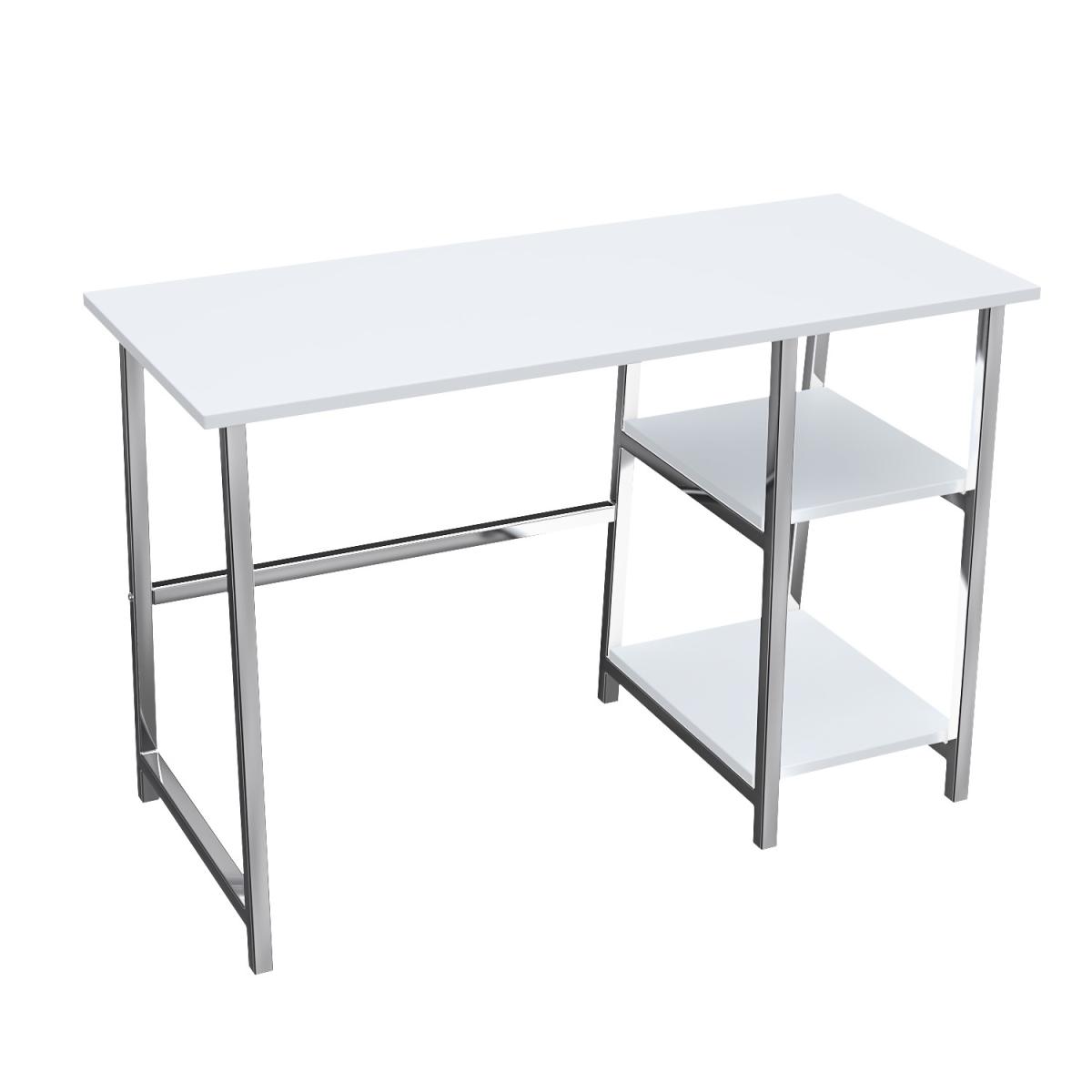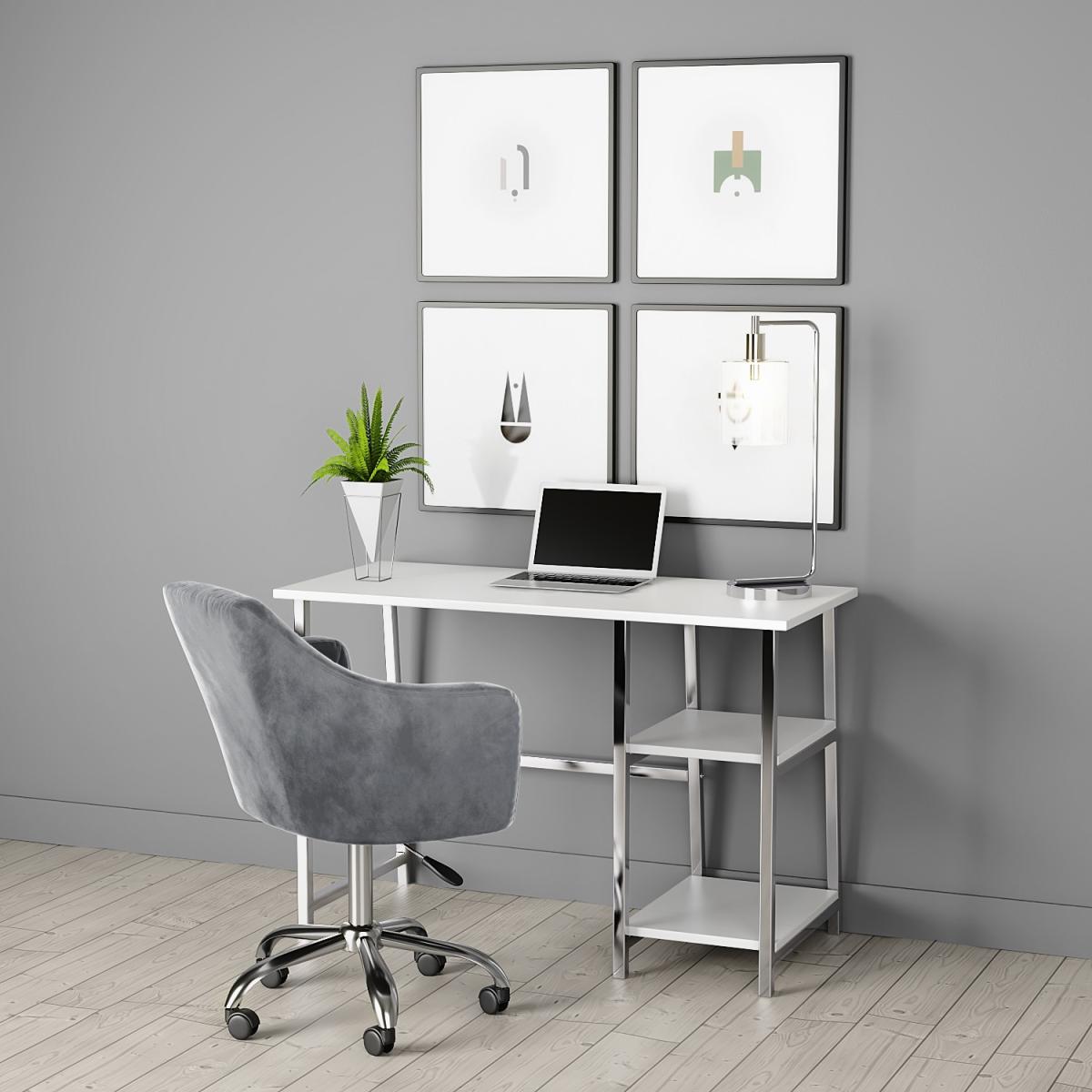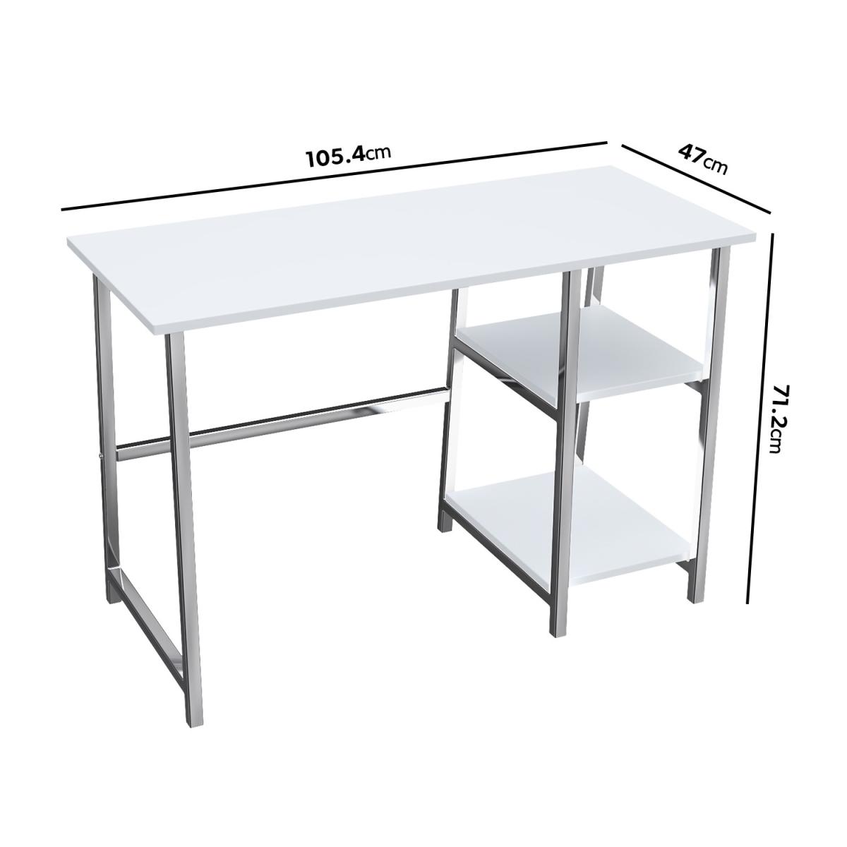 Features we love Seamless modern desk perfect for your home office. Features two shelves to store your work essentials. High gloss and chrome finish will suit any decor style Versatile open shelves keep your desk clutter-free. Features a 360-degree finish so it can be freestanding. Need to know. Dimensions. H71.2 x W105.4 x D47cm Number of shelves. 2 Colour. White and chrome Finish. High-gloss Material. MDF board and metal frame Assembly required. Yes..