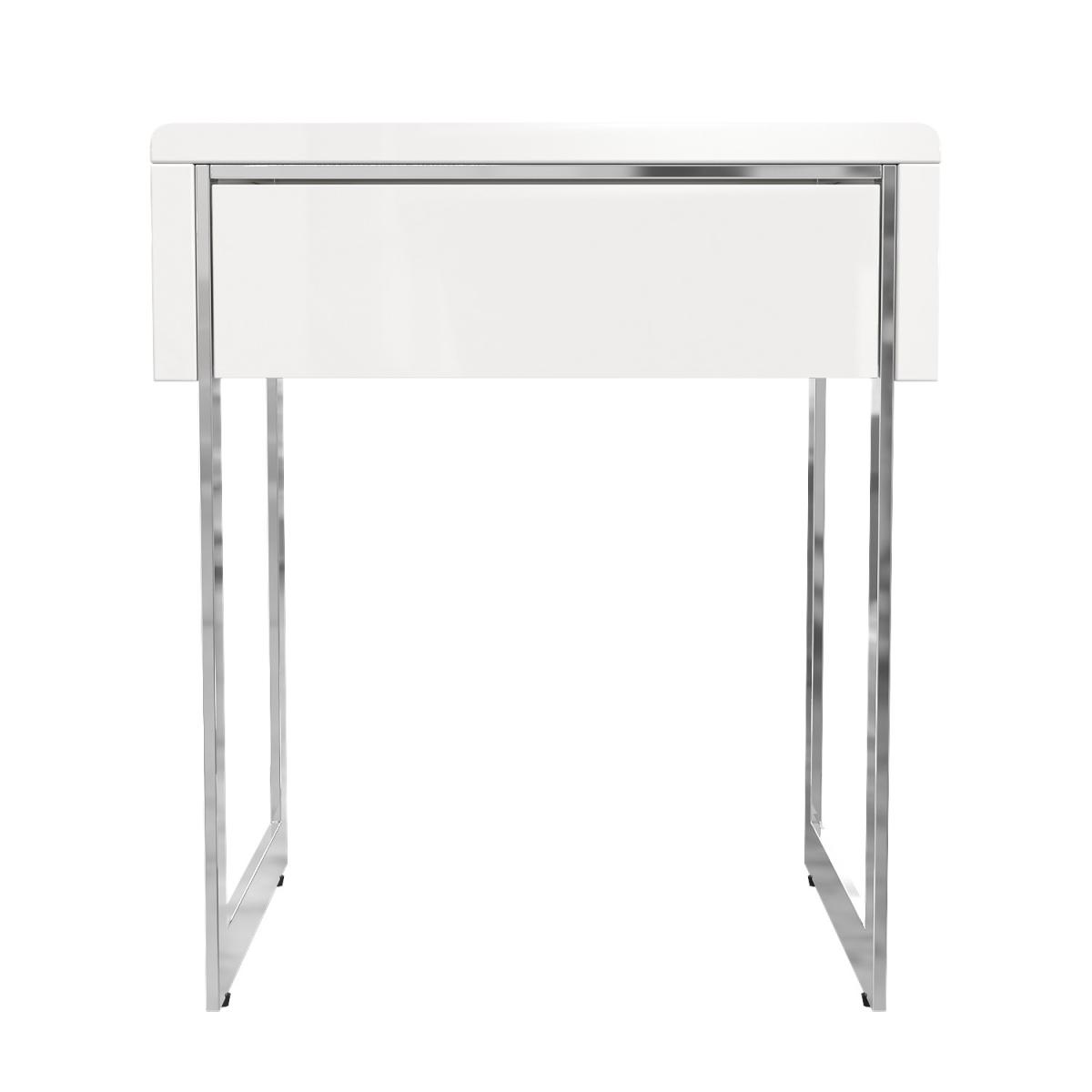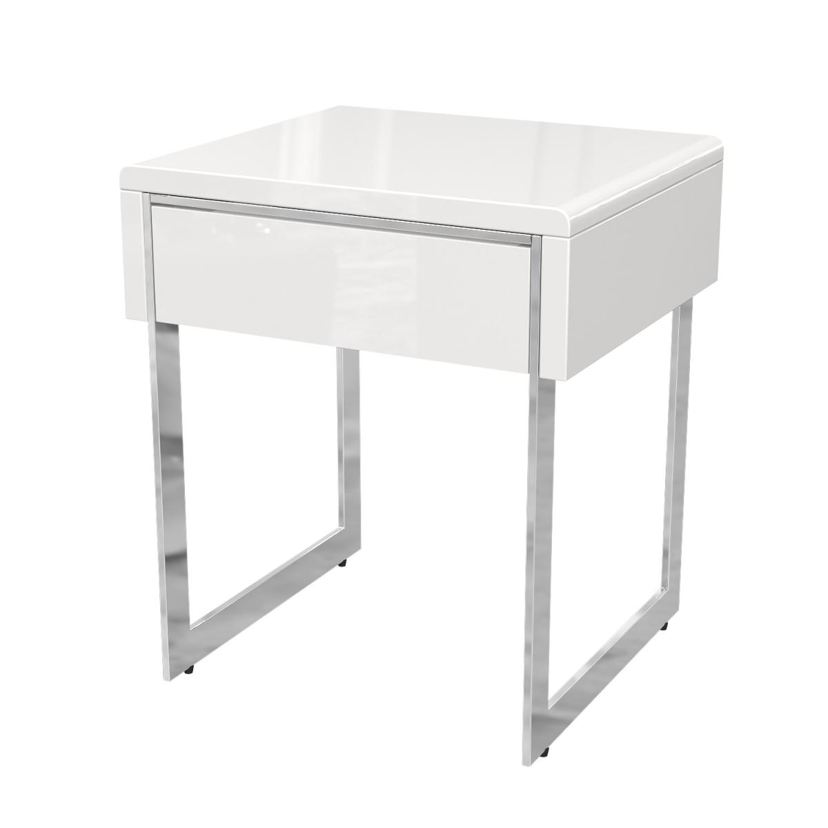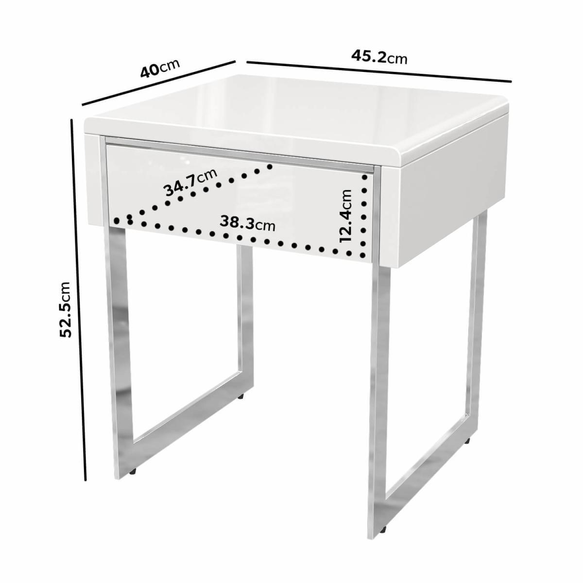 White high-gloss side table in a contemporary design High-quality construction with beautiful curved edges Drawer for storage with simple push to open mechanism Sleek and minimalistic design with chrome ski legs Matching items available in the Tiffany range Need to know Number of drawers: 1 Weight: 9kg Colour: White and silver Finish: High gloss Material: MDF and metal Assembly required: Yes