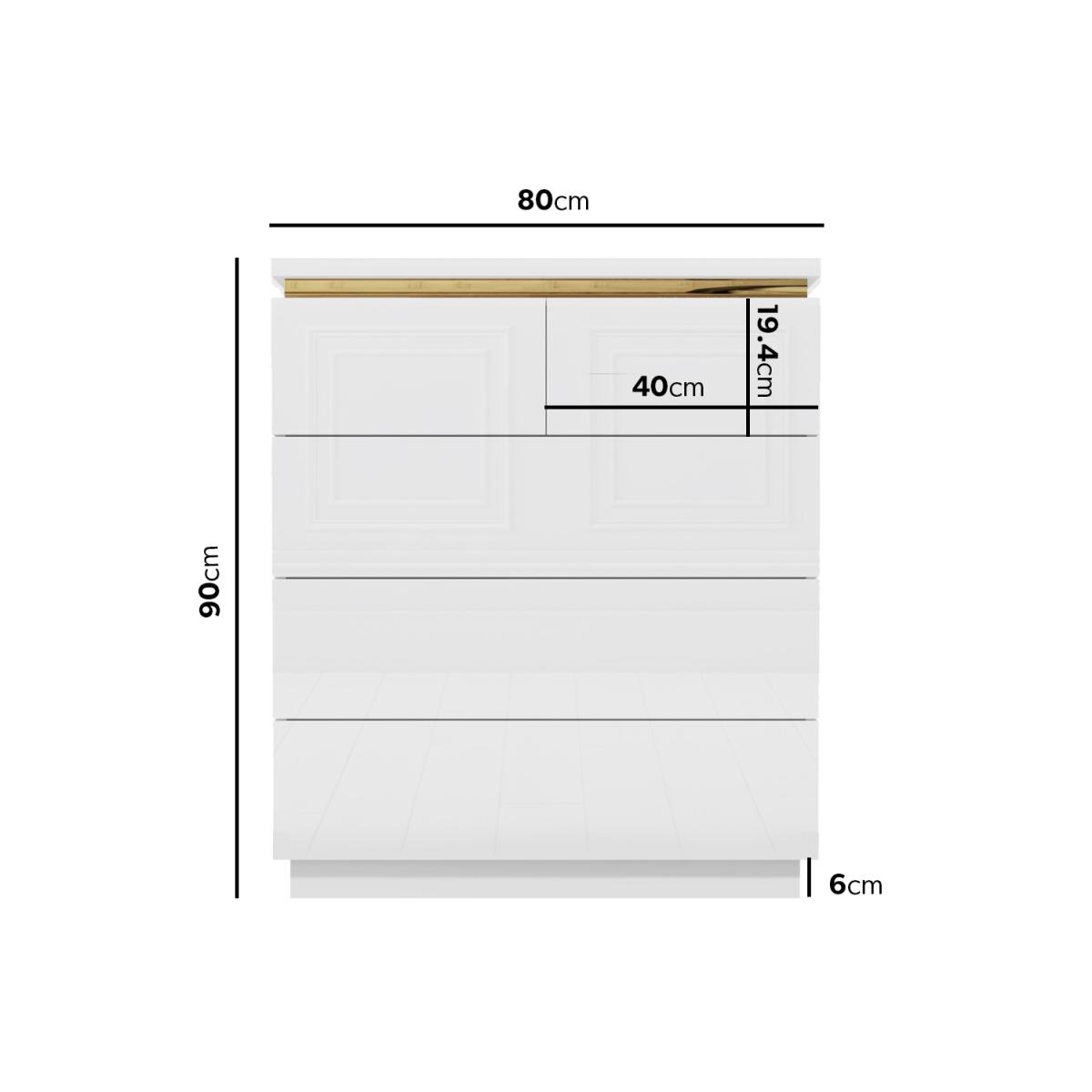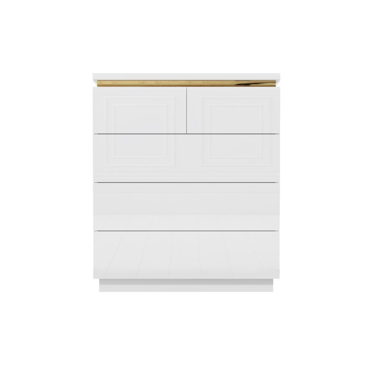 Give your bedroom a fresh look with this Isabella chest of drawers. Beautifully styled thanks to the high-gloss white finish and painted gold trim detailing, it'll make a great addition to any sleep space. There are three large drawers which are perfect for folded items and two smaller drawers for other bits and bobs. The top provides plenty of room for keeping your personal belongings, standing a fresh vase of flowers or even a TV. With a handle-less opening, a single touch anywhere on the drawer's front is all that's required, making it wholly effortless as well as seamlessly good looking. Why not combine it with the matching pieces to create a complete set.