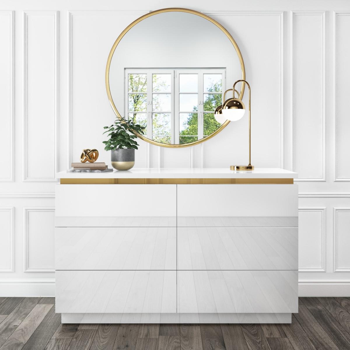 Dimensions W120cm x D45cm x H75cm. Features we love Contemporary design perfect for updating your space with a chic look. The white gloss finish with gold painted trim makes a striking contrast. Six spacious drawers with push-open mechanism great for storing all your folded items. The sleek high-gloss finish gives it a natural shine and it reflects beautifully. Full Isabella bedroom furniture collection available All about me. Give your bedroom a fresh look with this Isabella wide chest of drawers. Beautifully styled thanks to the high-gloss white finish and painted gold trim detailing it'll make a great addition to any sleep space. There are six roomy drawers perfect for your folded items and other bits and bobs. The wide top surface is ideal for standing a fresh vase of flowers ornaments photos; you could even fix a mirror above to help you get ready in the morning. With a handle-less opening a single touch anywhere on the drawer's front is all that's required making it wholly effortless as well as seamlessly good looking. Why not combine it with the matching pieces to create a complete set. Need to know. Overall dimensions. H75 x W120 x D45 cm Number of drawers. 6 Colour. White and gold Finish. High gloss and painted (trim) Material. MDF and metal (trim) Assembly required. Yes.