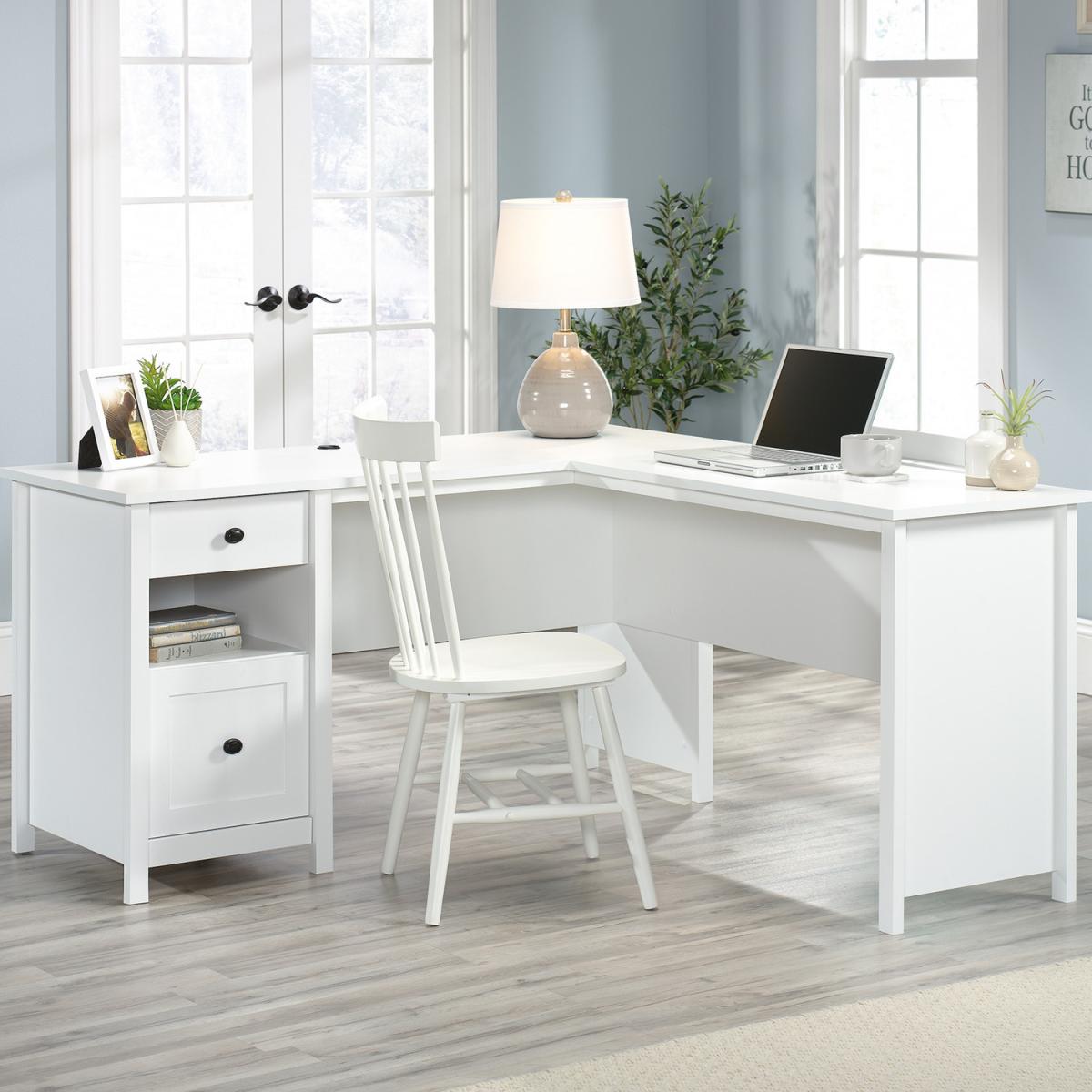 Teknik Office White Home Study L-Shaped desk with large desktop and return, full extending letter sized filer drawer, stationery drawer and open shelf.