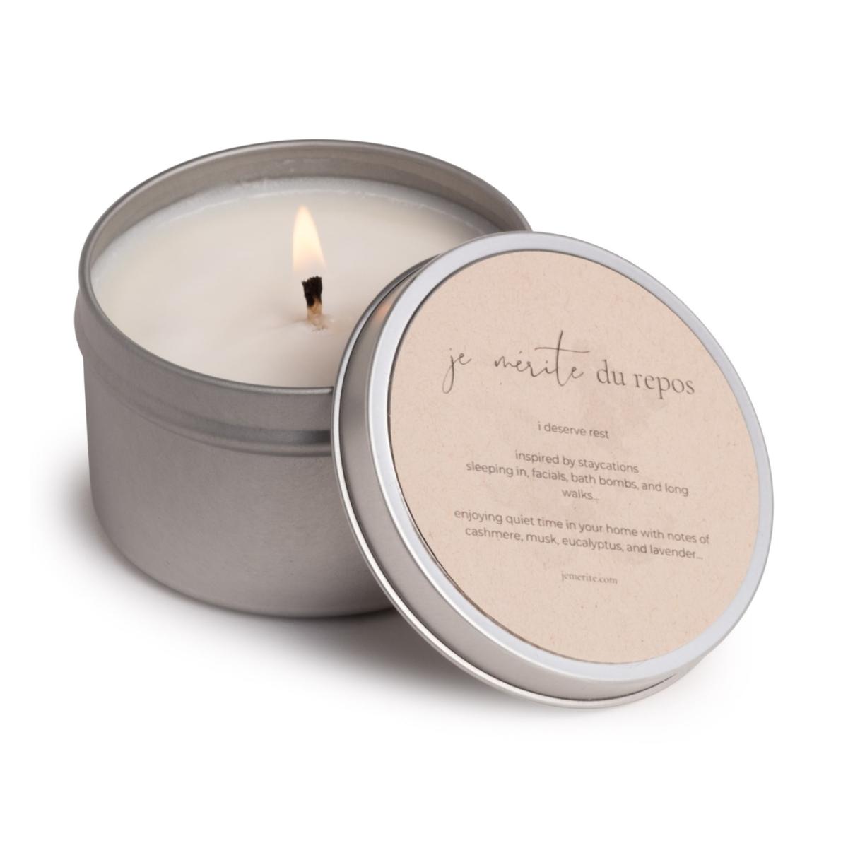 Je Mérite Du Repos (I Deserve Rest) is an aromatherapy candle bringing about the connection of heart and mind, with notes of cashmere, musk, eucalyptus, & lavender Inspired by staycations, sleeping in, facials, bath bombs, & long walks May our sensual fragrances invite you to indulge and pamper yourself You deserve it!