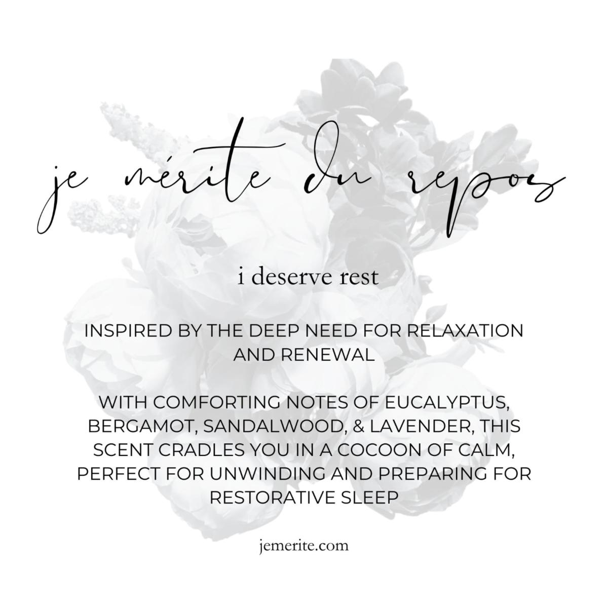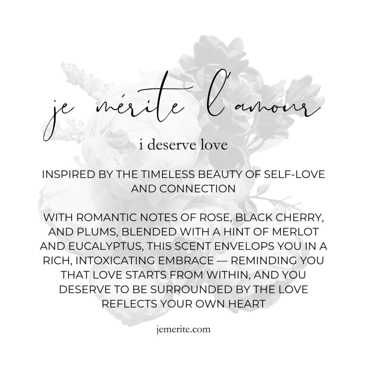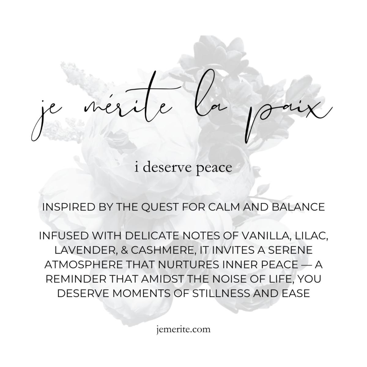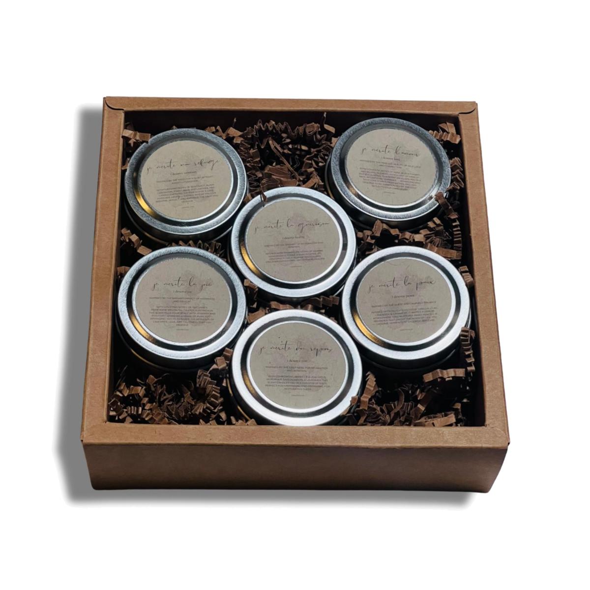 Empower your journey with the Je Mérite, I Deserve Weekly Affirmation Journal—featuring 52 handpicked “I Deserve” affirmations, this journal is crafted to affirm and uplift women and femmes throughout the year. Set of (6) 2 oz candles include: I Deserve Love - with romantic notes of rose, black cherry, plums, and a hint of merlot and eucalyptus I Deserve Peace - with delicate notes of vanilla, lilac, lavender, & cashmere I Deserve Rest - with comforting notes of eucalyptus, bergamot, sandalwood, & lavender I Deserve Healing - with therapeutic notes of jasmine, honeysuckle, tonka, & baby powder I Deserve Joy - with uplifting notes of cucumber, honeydew melon, saltwater, & petrichor I Deserve Sanctuary - with soothing notes of bergamot, black cardamom, tonka bean, and leather