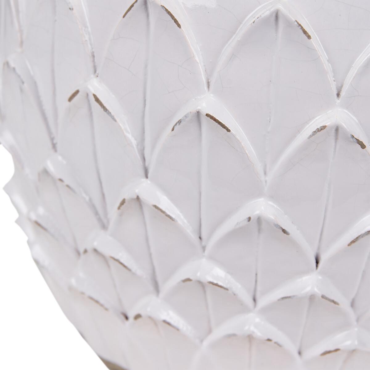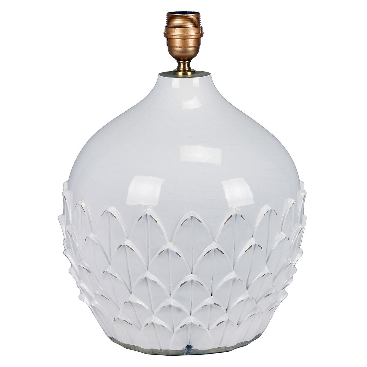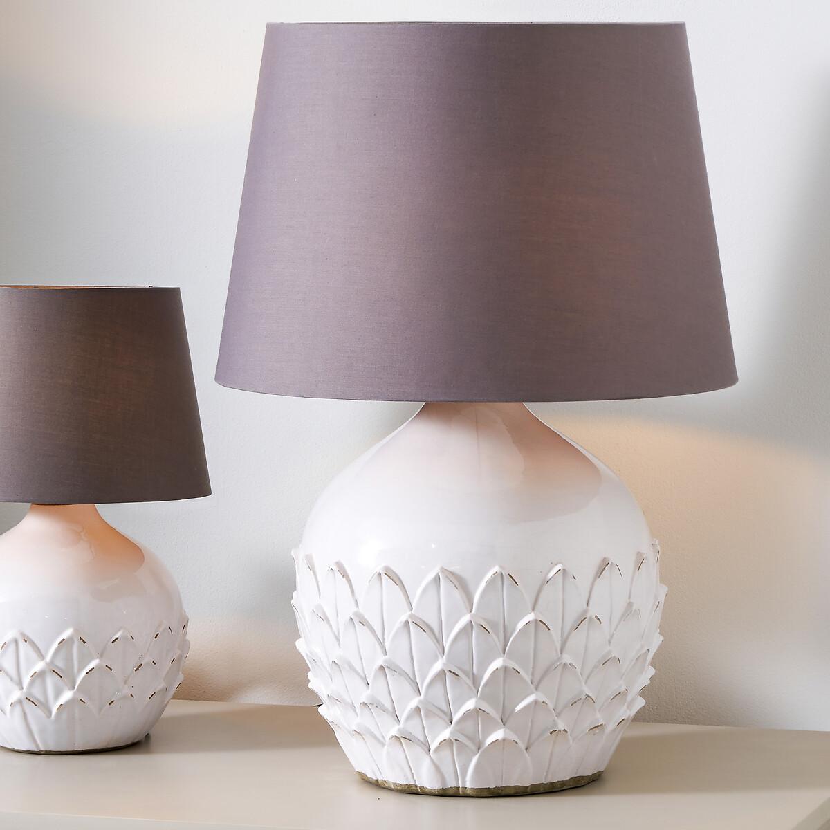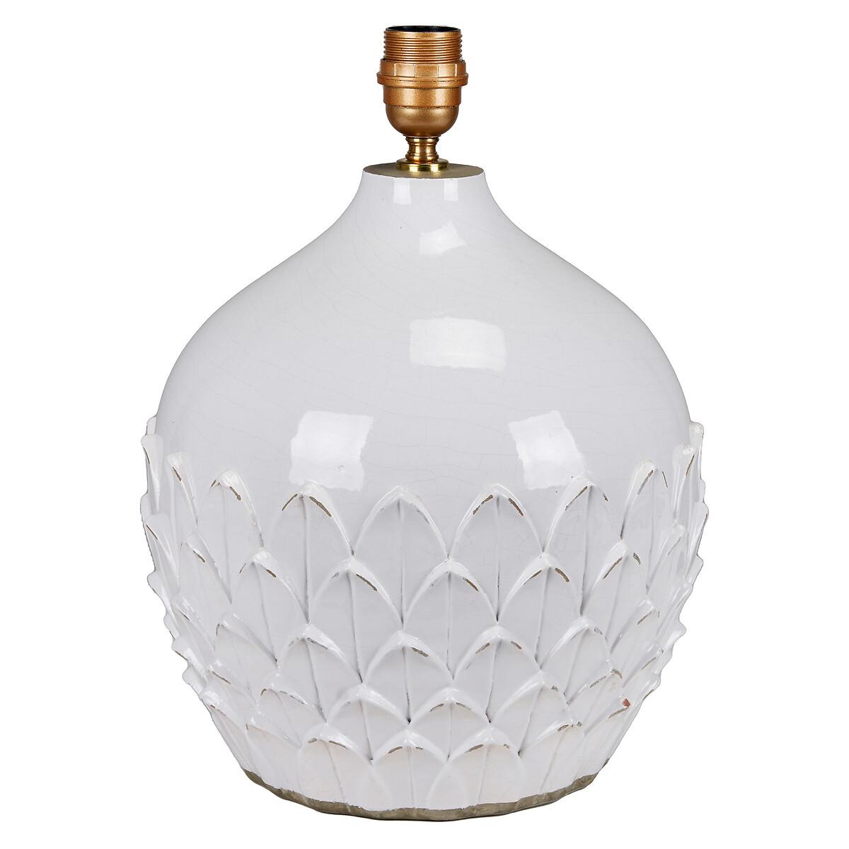A delicately curved terracotta pot which has been finished in a crackle white finish. Adorning the bottom half of the pot are textured 3D leaves which have been lovingly hand crafted and added one by one making each piece truly unique. To highlight these beautiful leaves a light distressing has been added to the edges. Pair with a neutral or natural cylinder shade. Recommended lampshade size: 35cm dia. Product Dimensions: 30x30x39cm Bulb Type:E27 Gold plastic Maximum Wattage:60W Bulb Included?:No. Number of Bulbs Required:1Cable/ Switch Info:Black plastic, 2x0.75mm², 2m, Black in-line switch (40cm from base)This product will be dispatched by one of our trusted suppliers. You’ll be contacted by their selected courier about your delivery.