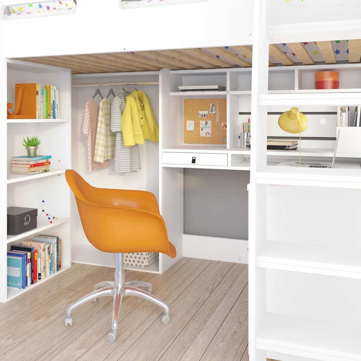 Features we love High sleeper bed increases functional floor space. Ample storage solutions with shelves and clothes rail Moveable desk on castors is the perfect homework spot. Multi-functional corkboard spins around into a mirror. Chunky ladder with handholds is easier to climb. Need to know. Dimensions. W196.6 x D135 x H178.5cm Max mattress depth. 90cm Weight. 35kg Colour. Snow white Finish. Painted Material. Plywood and particle board Bed base. Plywood LVL slats Mattress included. No Assembly required. Yes..