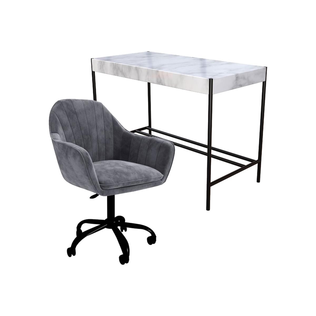Faux-marble desk with contrasting black metal frame Practical and stylish set perfect for any home office Office chair provides comfort with curved backrest 360-degree swivel and adjustable seating height ensures practicality while you work or study Minimal assembly required for the desk, just secure the legs Need to know Office Desk Information Colour:White and black Finish: Faux marble top and black metal legs Material:MDF and metal Assembly required:Yes Office Chair Information Colour: Grey & black Finish: Velvet and matt (legs) Material: Velvet upholstery and metal For use: Indoors Weight: 8.45kg Assembly required: Yes (just the legs) Range: Logan