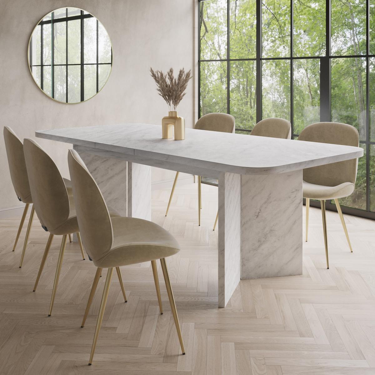 I’m a fan of the Geneva table for its clean silhouette and clever extendable top - it sits comfortably as a four-seater most days, then stretches out for dinner parties. The white marble-effect finish and pillar legs work particularly well in contemporary or Scandi interiors where you’re aiming for a pared-back look with a touch of sculptural interest. To style, pair it with slim-framed chairs in velvet or tan leather to introduce warmth, and ground the setting with a natural-fibre rug. Keep tableware simple - think matt ceramics or white porcelain - and add a low greenery centrepiece or linen napkins for texture. In open-plan layouts it neatly defines the dining zone against pale walls or exposed concrete while letting accent colours and accessories take centre stage.