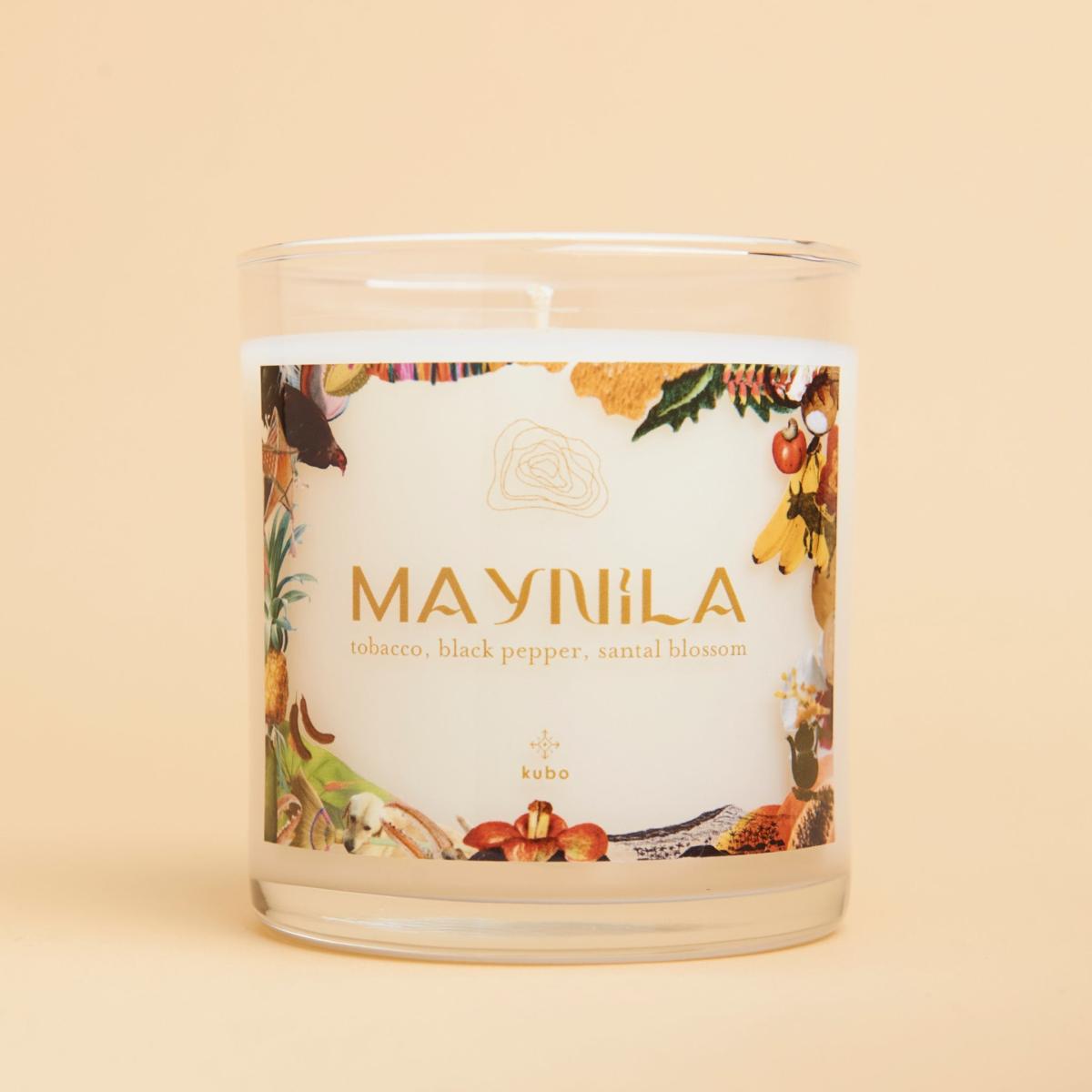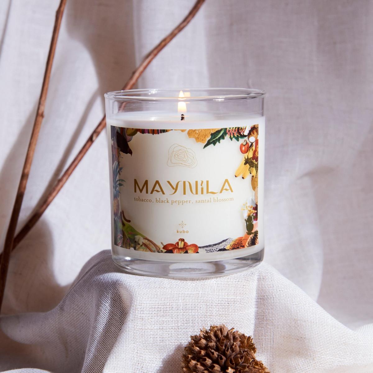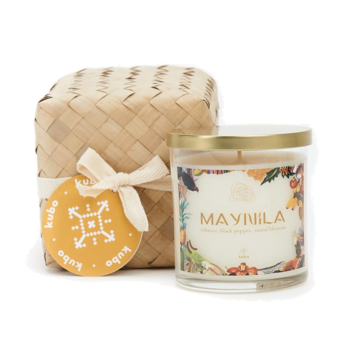 The kubo Maynila candle features the scent of tobacco, black pepper, and santal blossom. Creamy luxurious sandalwood mingles with amber woods, tobacco leaf and sweet vanilla in a captivating, powerful impression of opulence. Maynila, a place rich in history and punctuated by iconic characters, adds a bold yet inviting statement to any time of your day. The Maynila candle is hand-poured in clear glass jars that diffuse a soft glow while lit, illuminating the iconic Filipino elements on the candle labels. The gold metal lid adds a luxurious touch. Each candle is packaged in a handwoven palm leaf box.