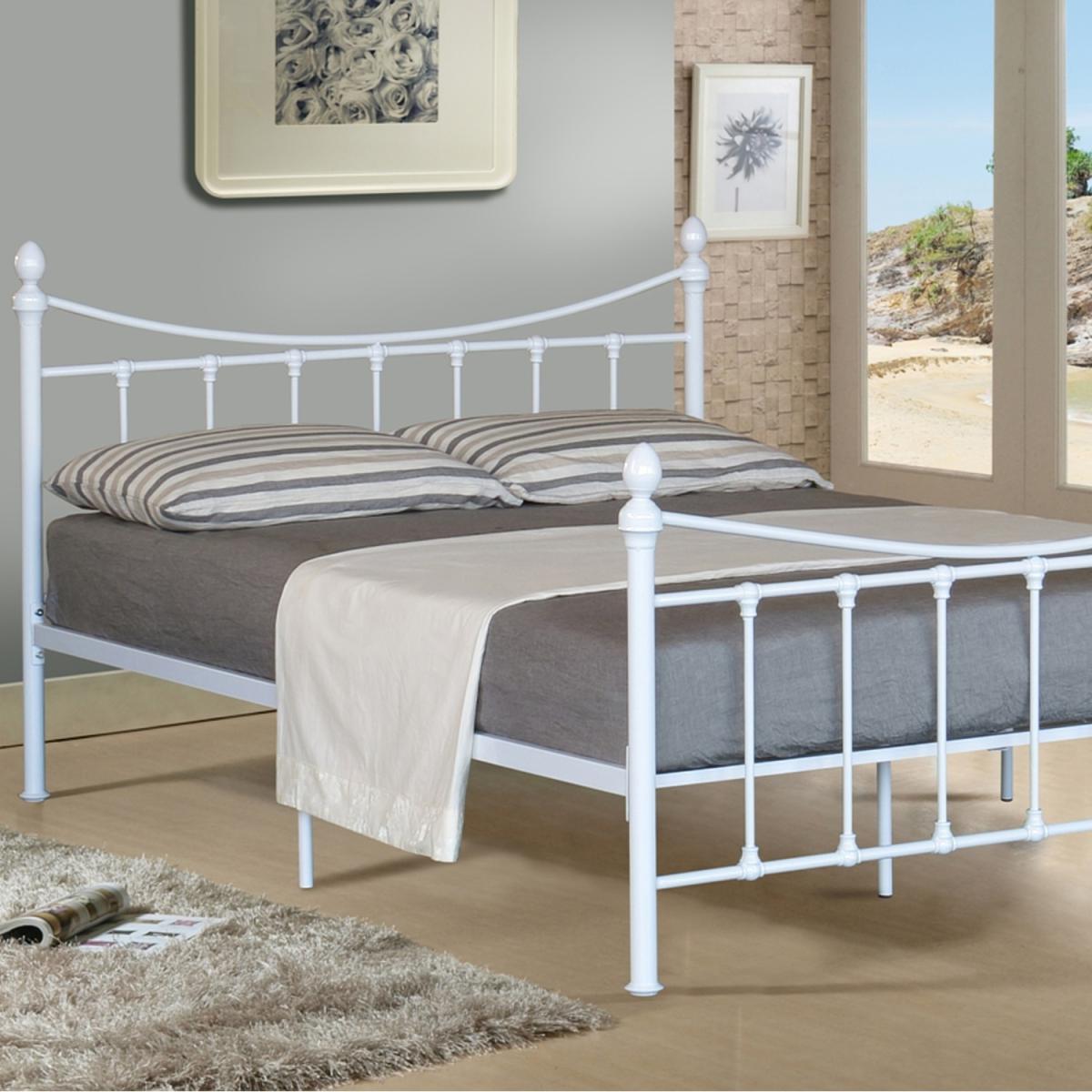 This beautiful classic metal bed frame is available to purchase in white and is available in either 4ft small double, 4ft6 double or 5ft king size. This sleek bed frame shows great traditional features including the delicately designed finials and the gently curved headboard and footboard with vertical bars for the classic finish. This solid metal frame comes with solid wooden sprung slats and a centre support rail giving extra sturdiness to this frame.