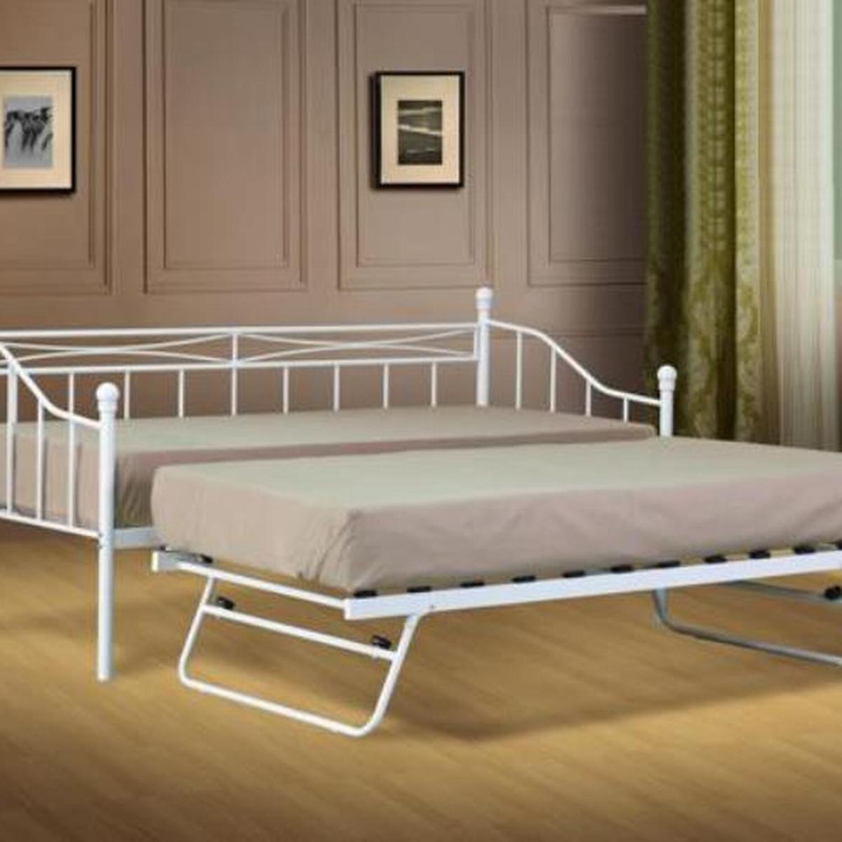 This day bed with its three railed sides can double up as an additional seating area when space is an issue. The bed is made from a solid metal frame and features a posture sprung solid wooden slats. If purchased with the addition of the trundle bed the this easily fits under the day bed when not in use, and can be slid out (courtesy of the well-placed wheels) and can be popped up to provide an extra bed when needed for those guests...hey presto a double bed. This bed frame fits a standard 2ft 6 or 3ft single size mattress depending on the size of the frame purchased.